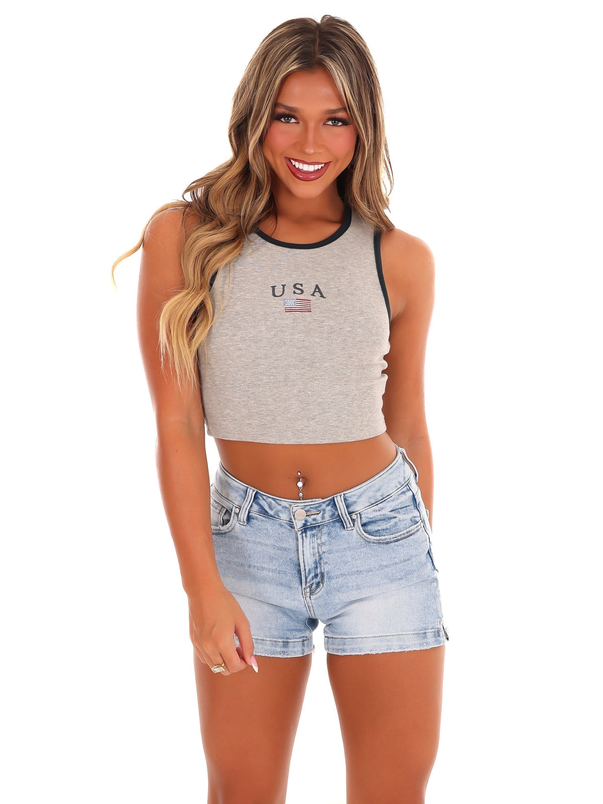 Celebrate the Fourth of July with our All in My Head Ribbed Crop Top! Made of ribbed fabric and featuring embroidered USA detail, this top is perfect for the holiday. With a rounded neckline, it's the perfect addition to your patriotic wardrobe.