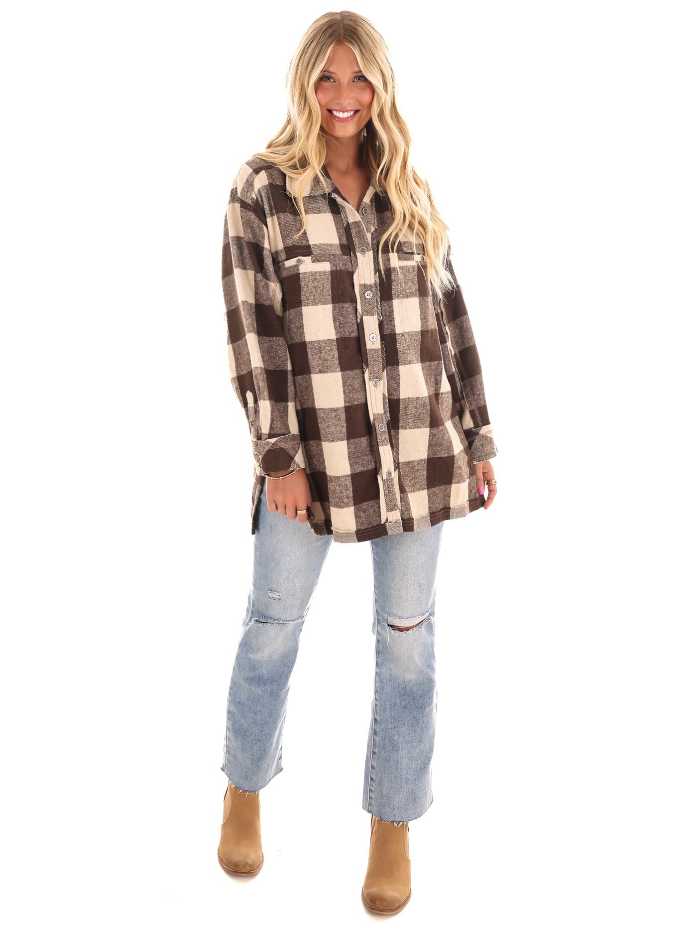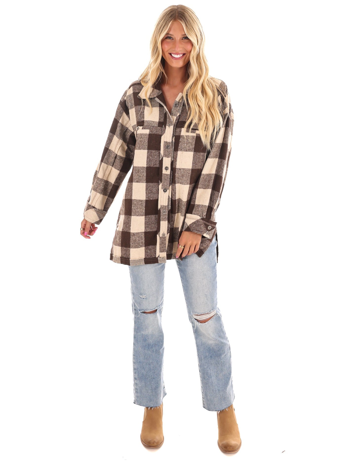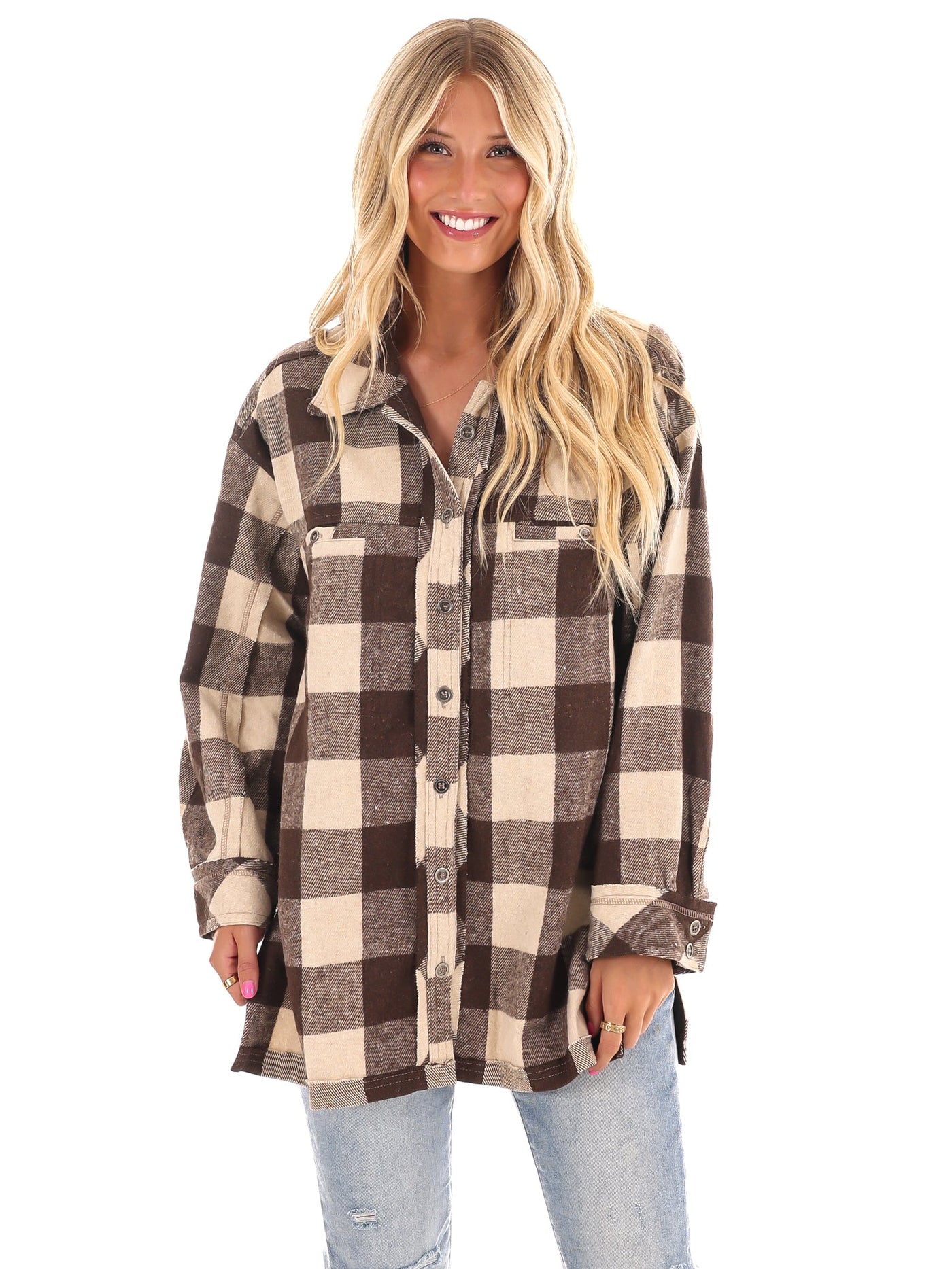 Get ready to rock the checker print trend with our Checker Print Button Down Shacket! Featuring a collared neckline and a relaxed, comfortable fit, this long sleeve shirt jacket is perfect for any age range or size. Complete with button down front, open front chest pockets, and buttoned cuffs, as well as unique frayed detailing and side slits. (Checker print has never looked so good!)