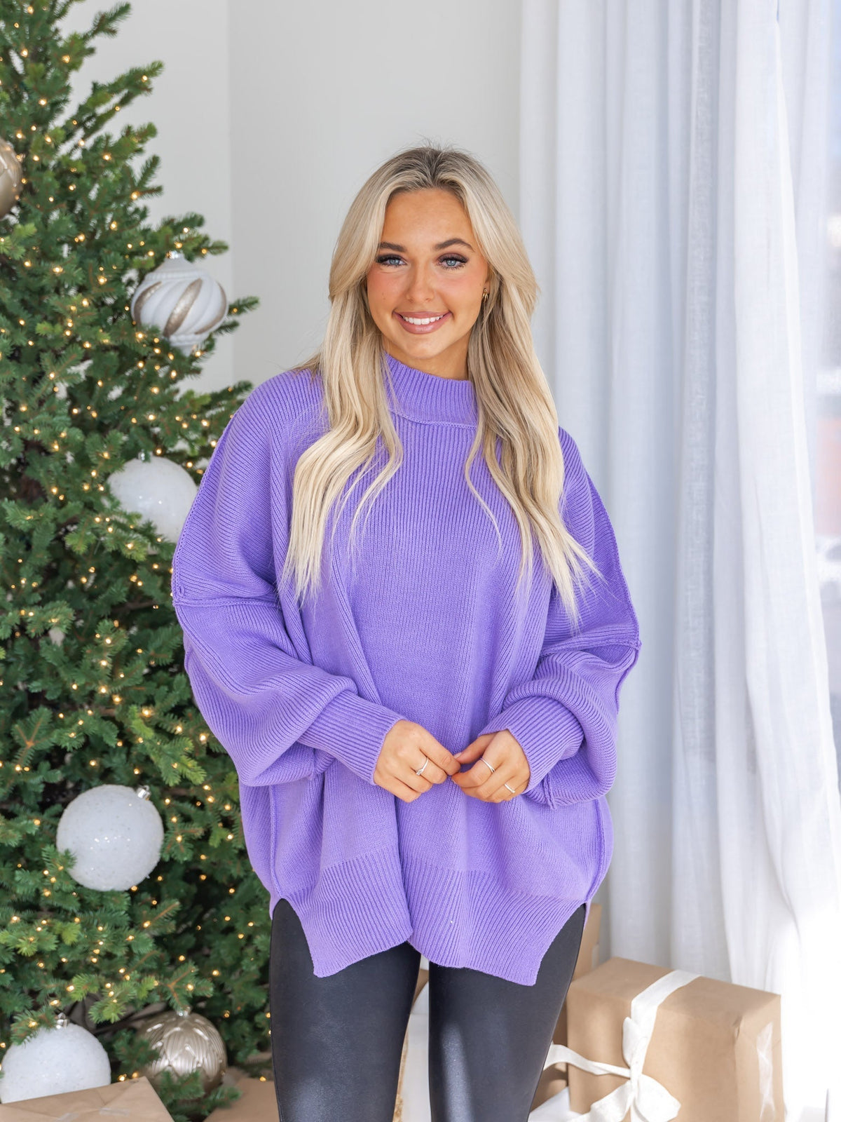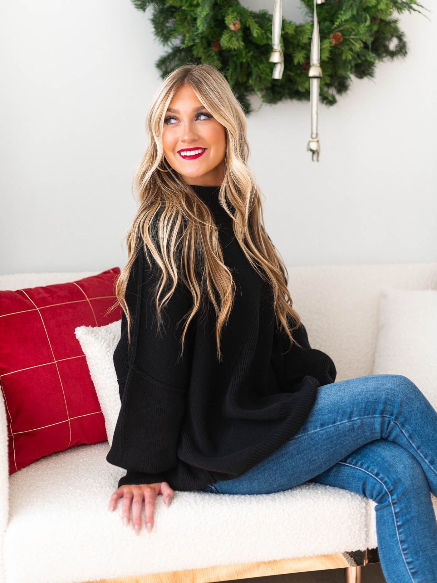 This oversized ribbed sweater is the perfect layer for cozy winter days! With a mock neckline, drop shoulder and side slits, you'll look effortlessly chic and be super comfy. Chilly days? No problem.