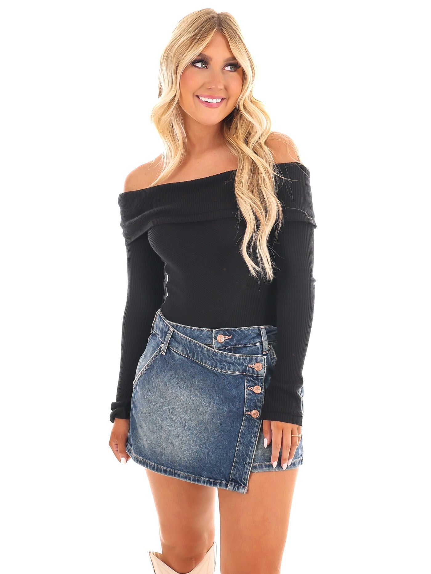 Features: Soft waffle fabrication, off-the-shoulder neckline, fold-down piecing, long fitted sleeves, seamed details, button gusset