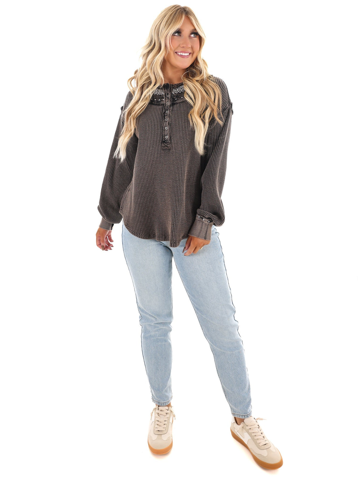 Features: Textured thermal fabrication, henley-style with button closures, contrast neckline detail, exposed seams throughout, drop-shoulder sleeves with elasticated cuffs