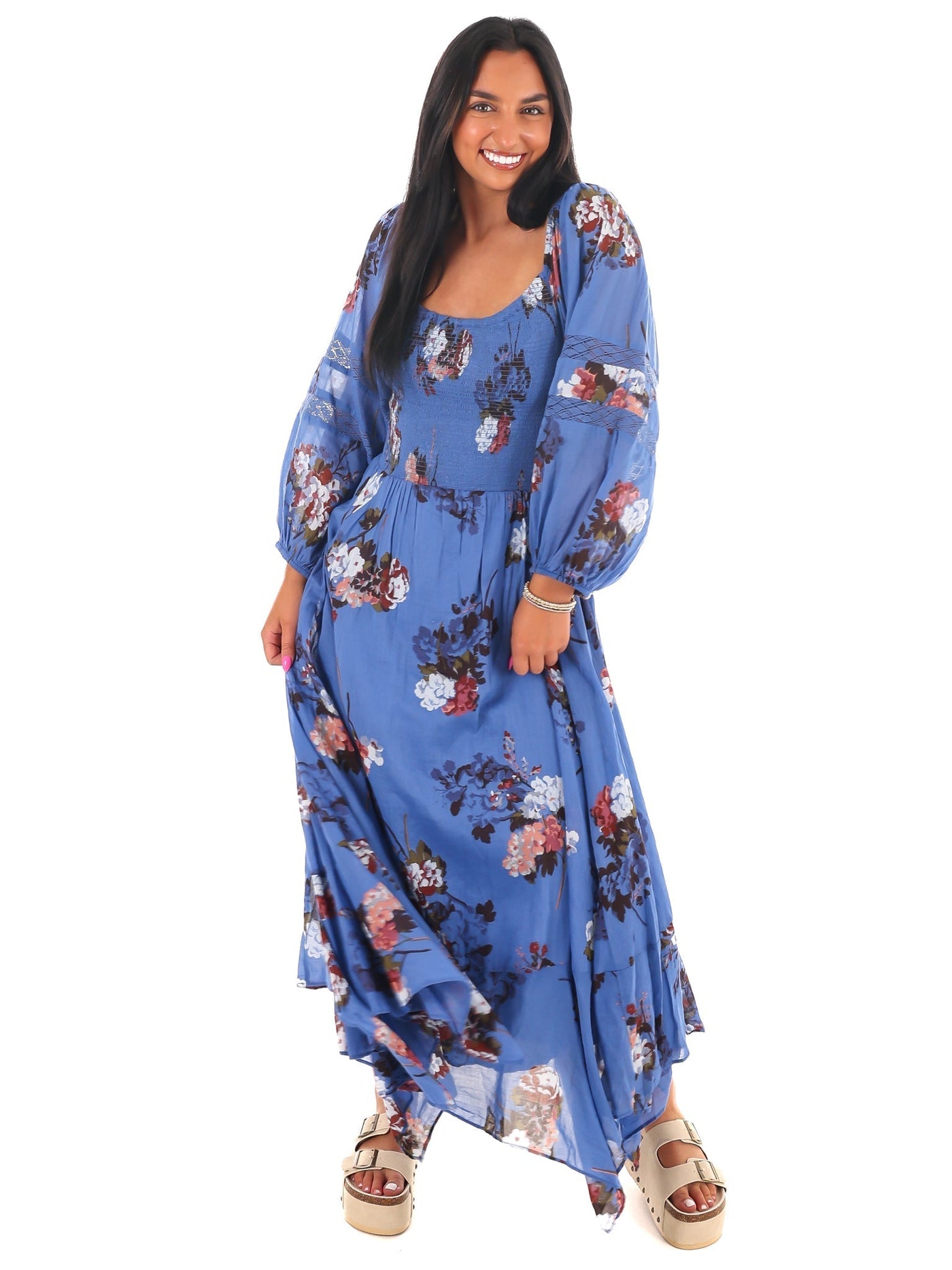 Billowy and beautiful, this printed maxi is featured in a soft cotton fabrication and flattering fit-and-flare style with a smocked bodice and balloon-inspired sleeves.
