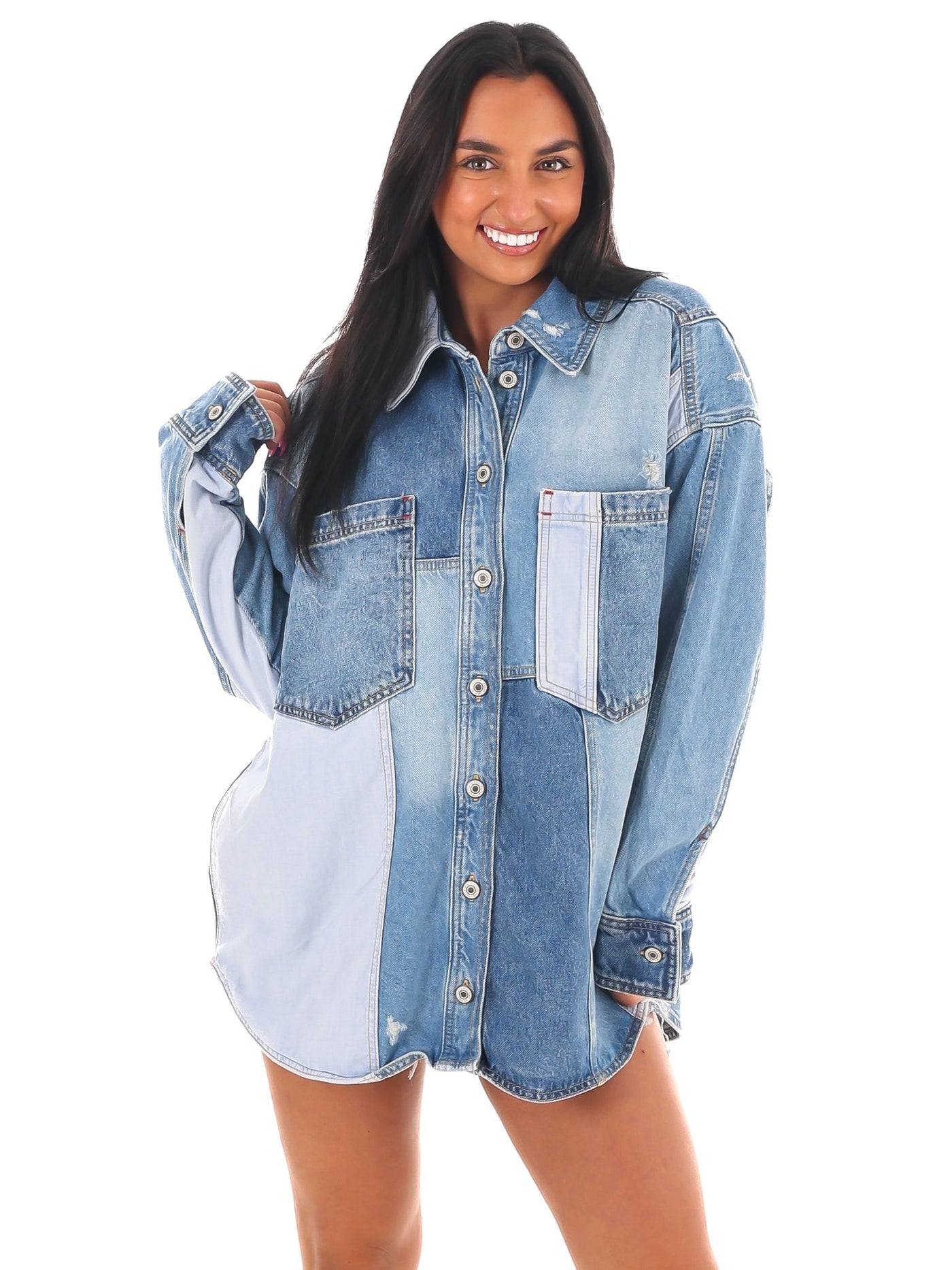 Features: Slouchy relaxed fit, oversized style, button-front closure, classic collar, rounded bottom hem, patched denim fabrication