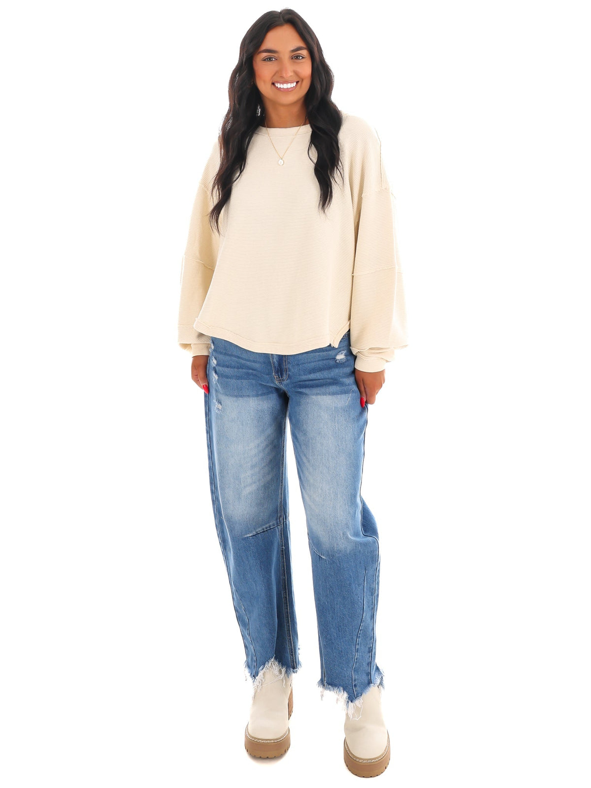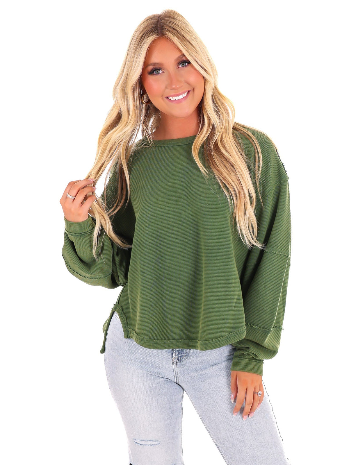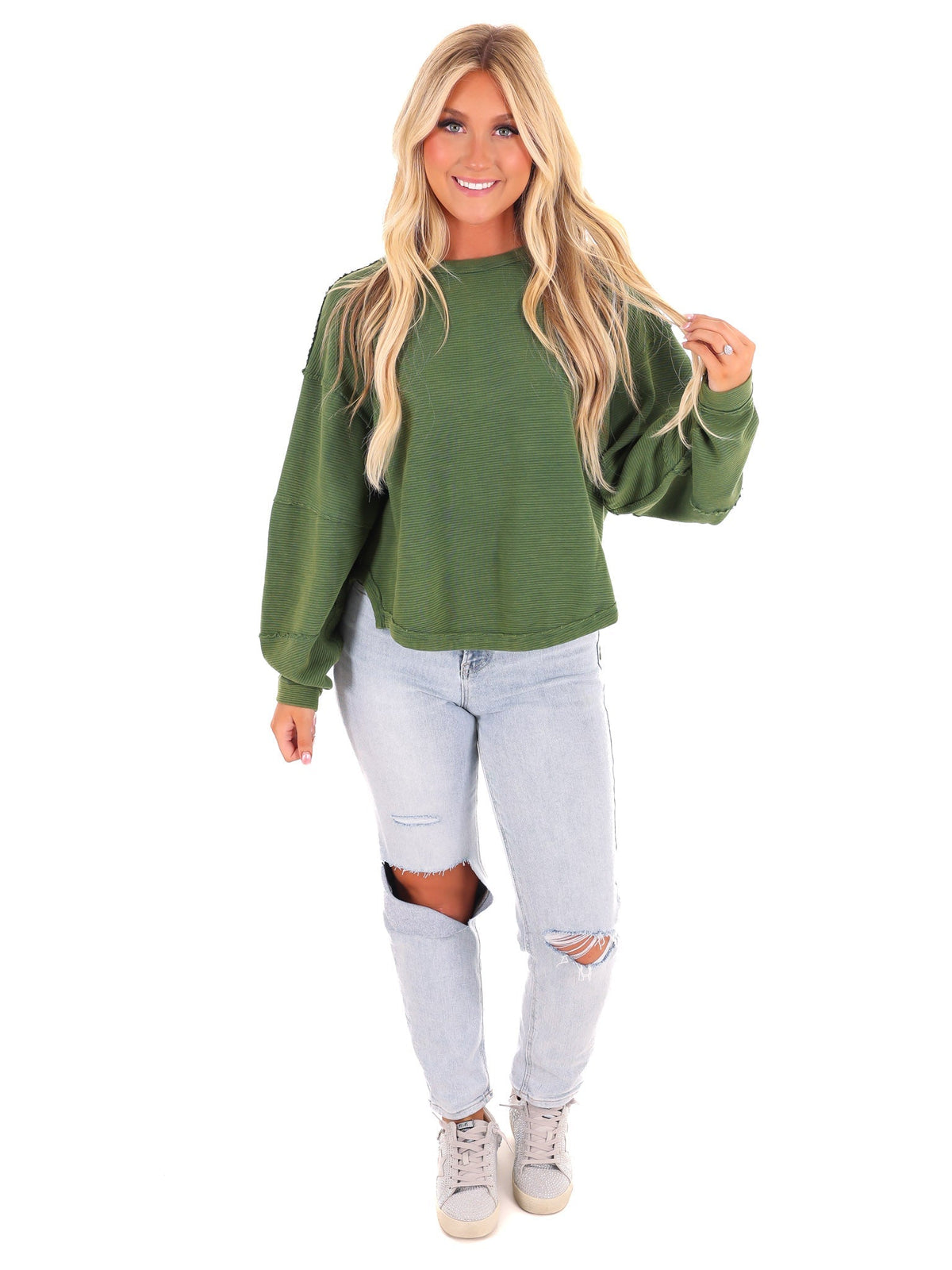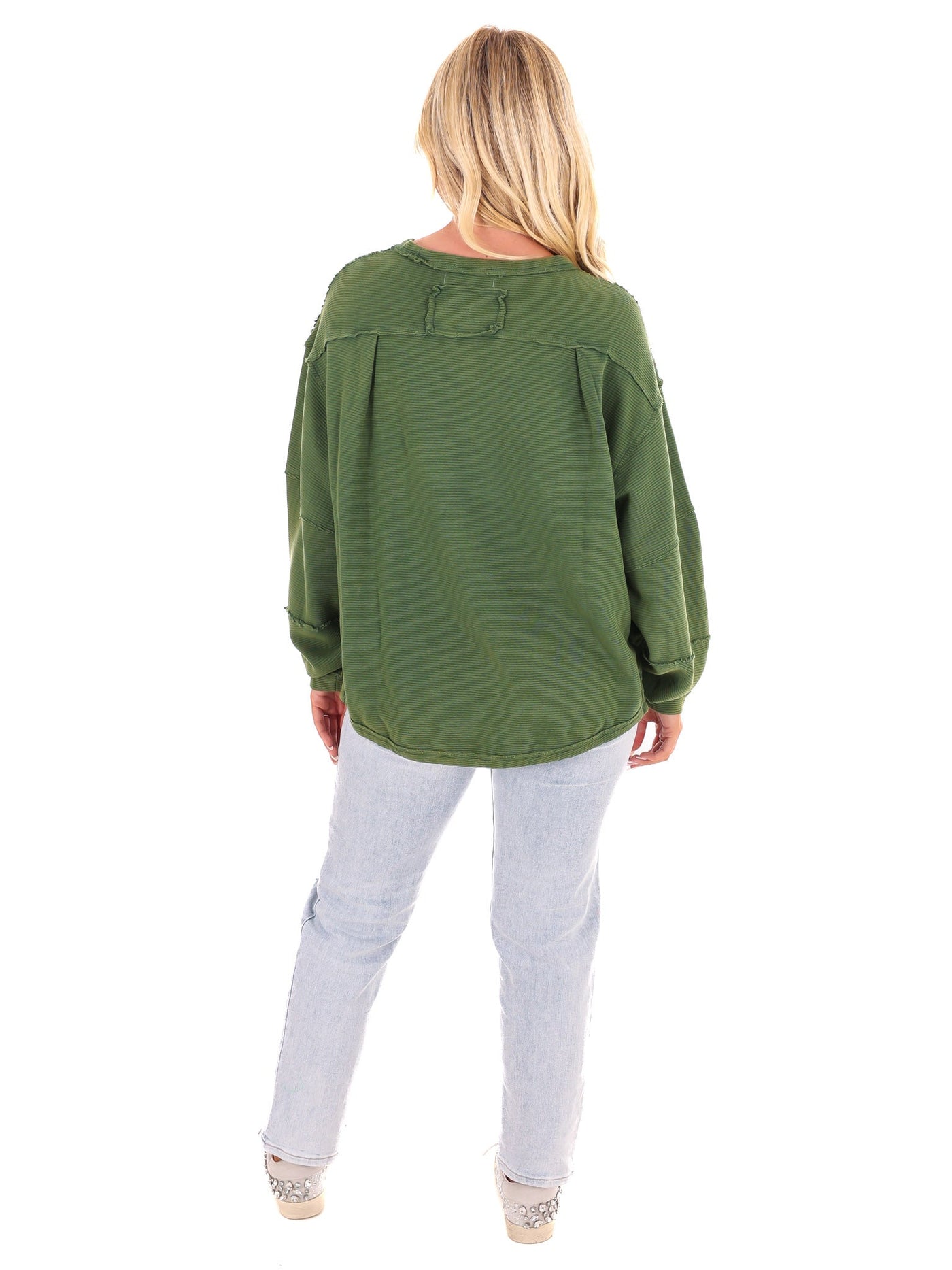 Features: Soft ribbed knit fabrication, slight scoop neckline, dropped dolman sleeves with cuffed hems, raw trim throughout