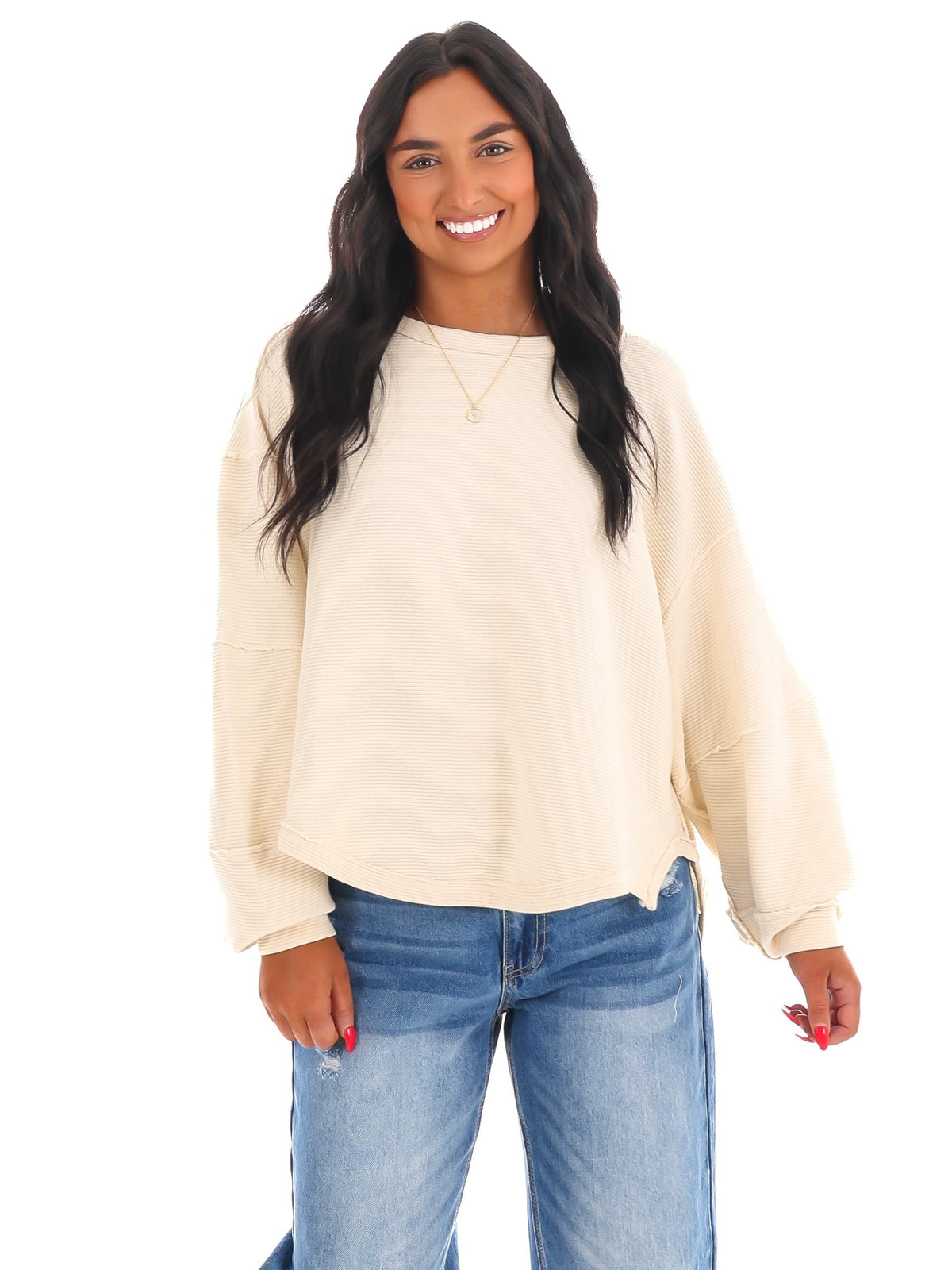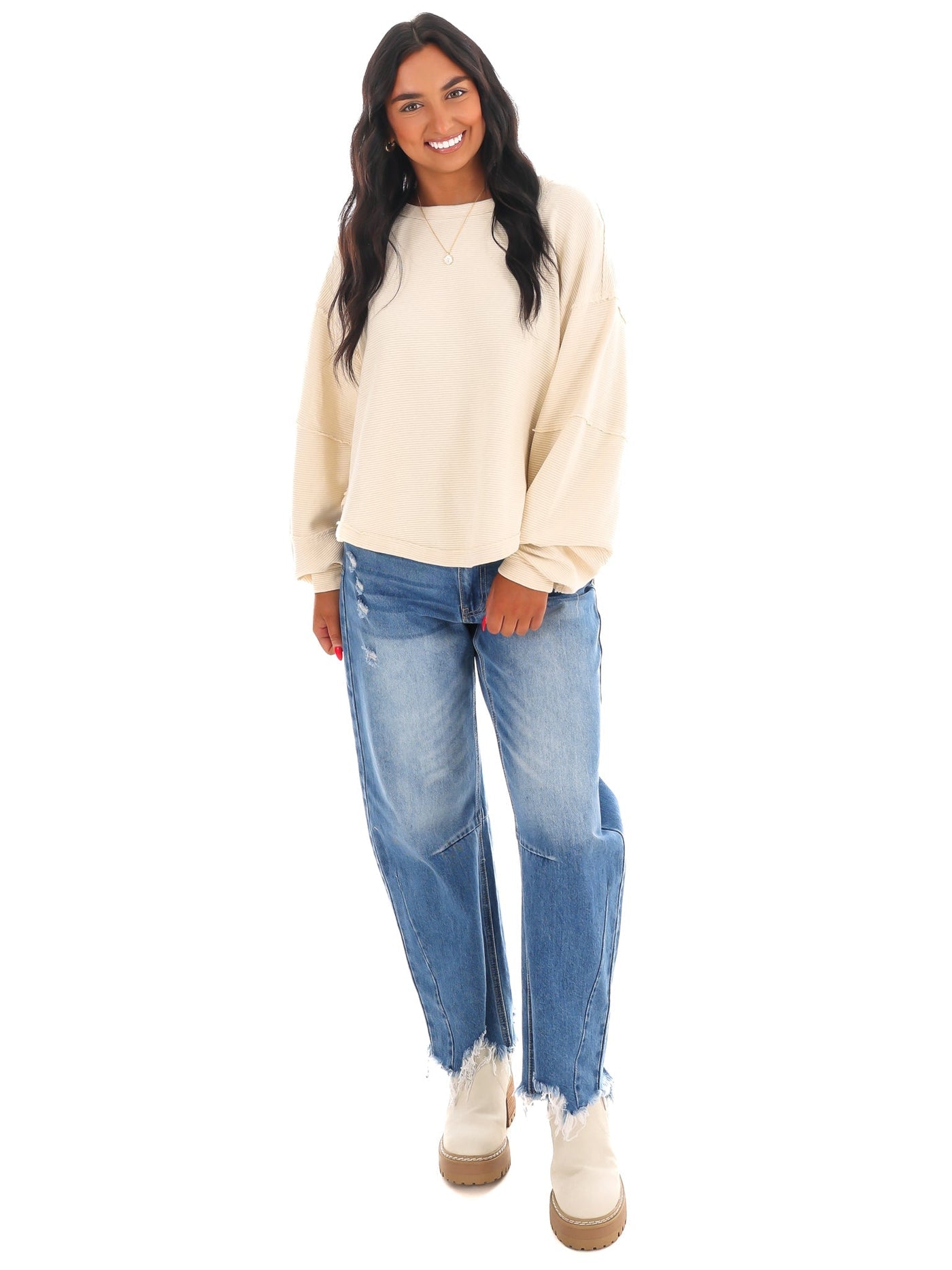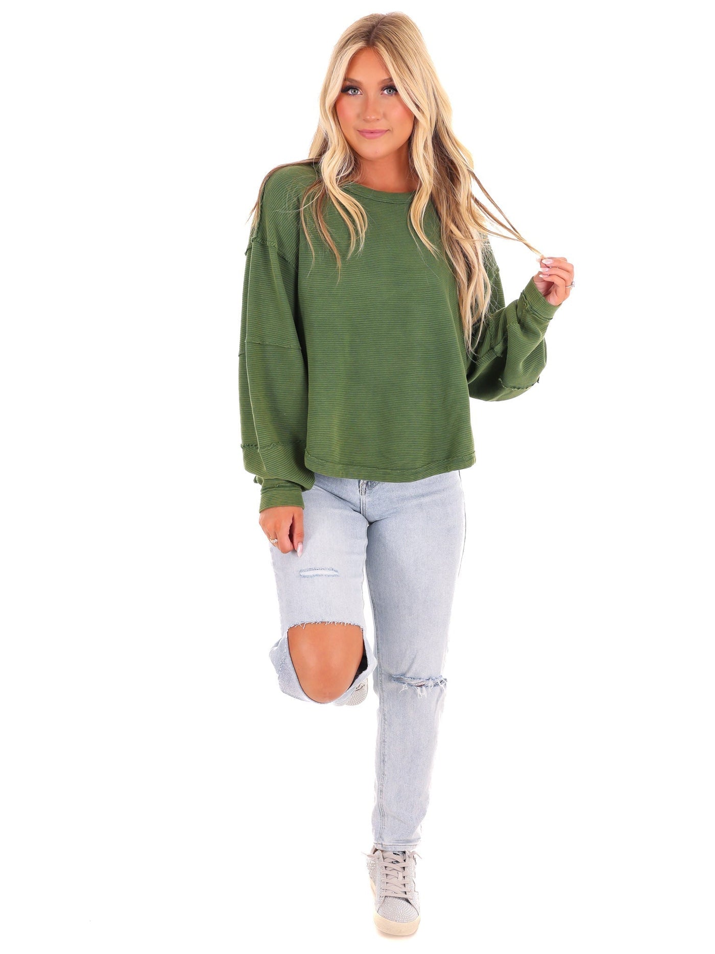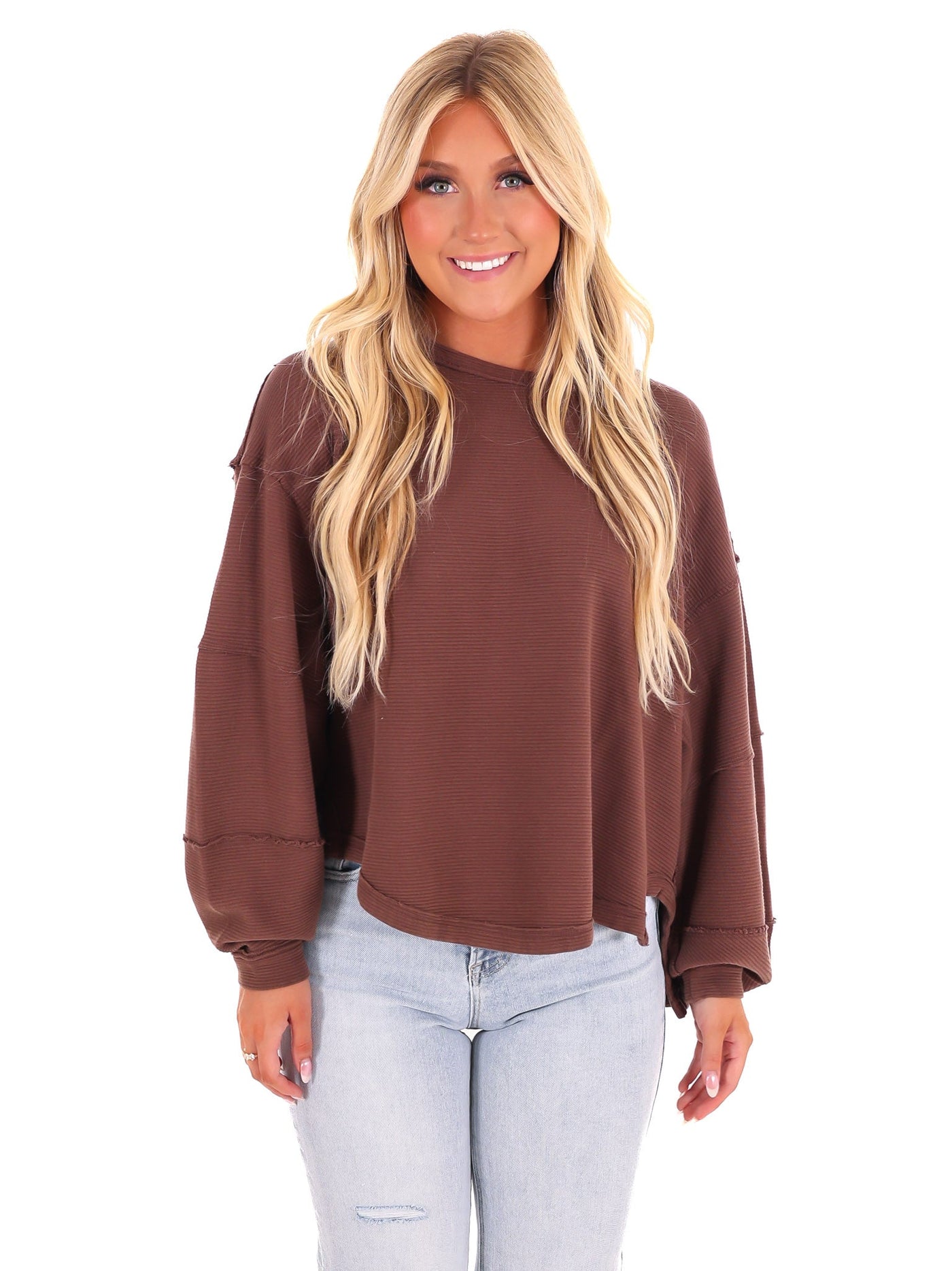 Features: Soft ribbed knit fabrication, slight scoop neckline, dropped dolman sleeves with cuffed hems, raw trim throughout