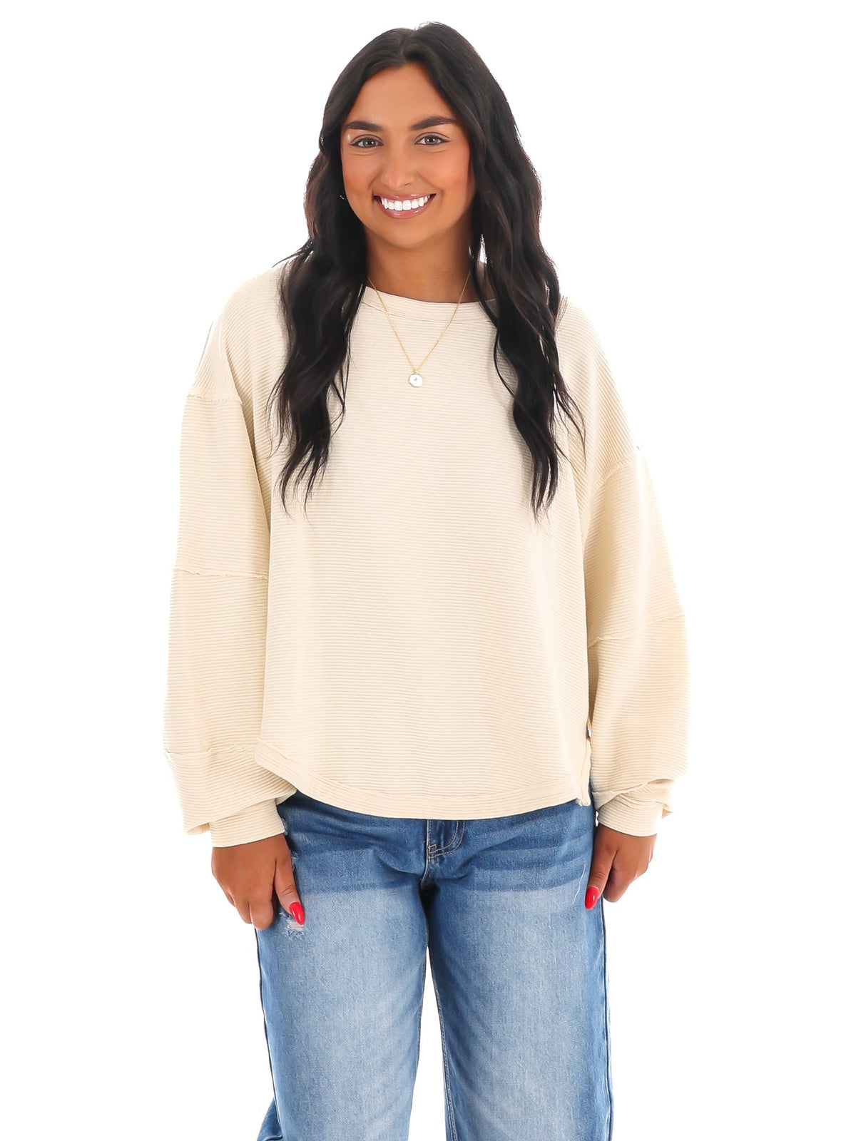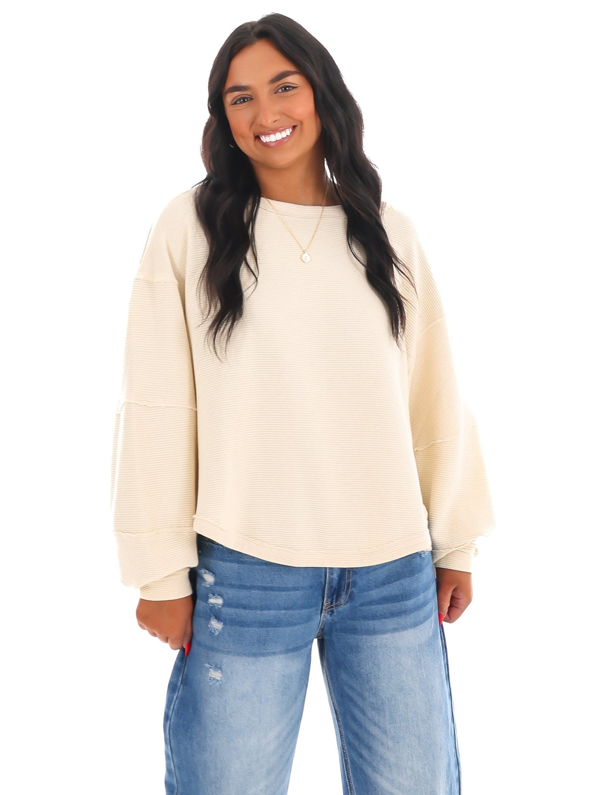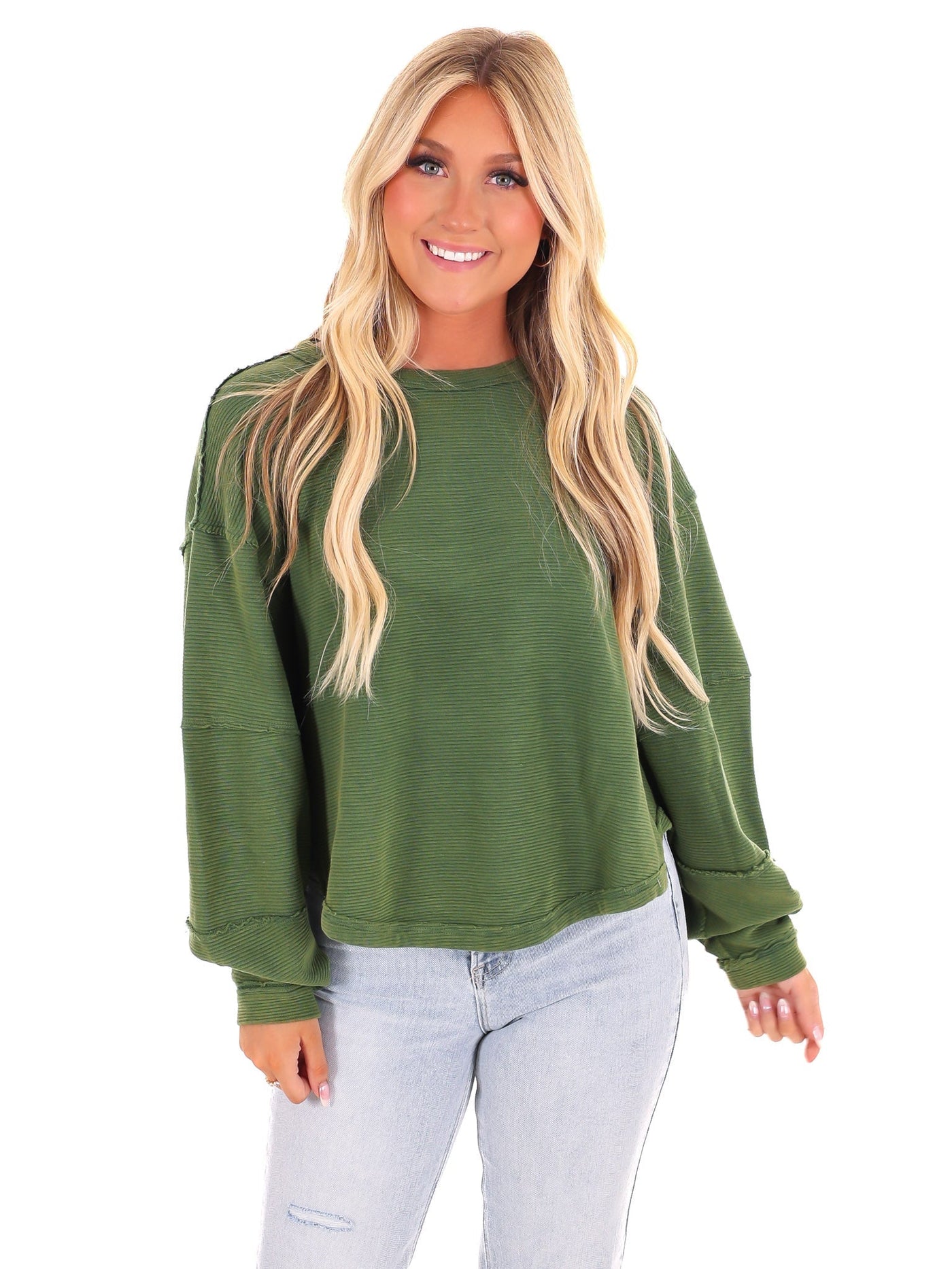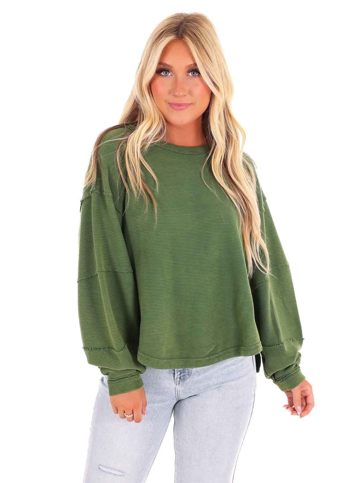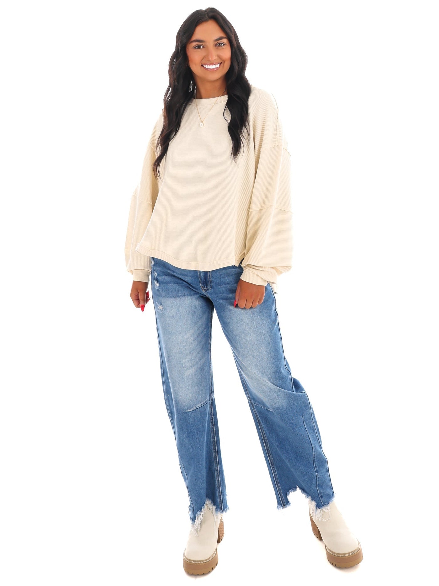 Features: Soft ribbed knit fabrication, slight scoop neckline, dropped dolman sleeves with cuffed hems, raw trim throughout