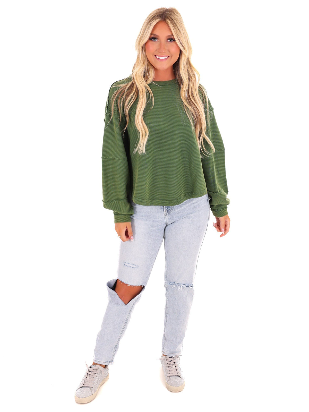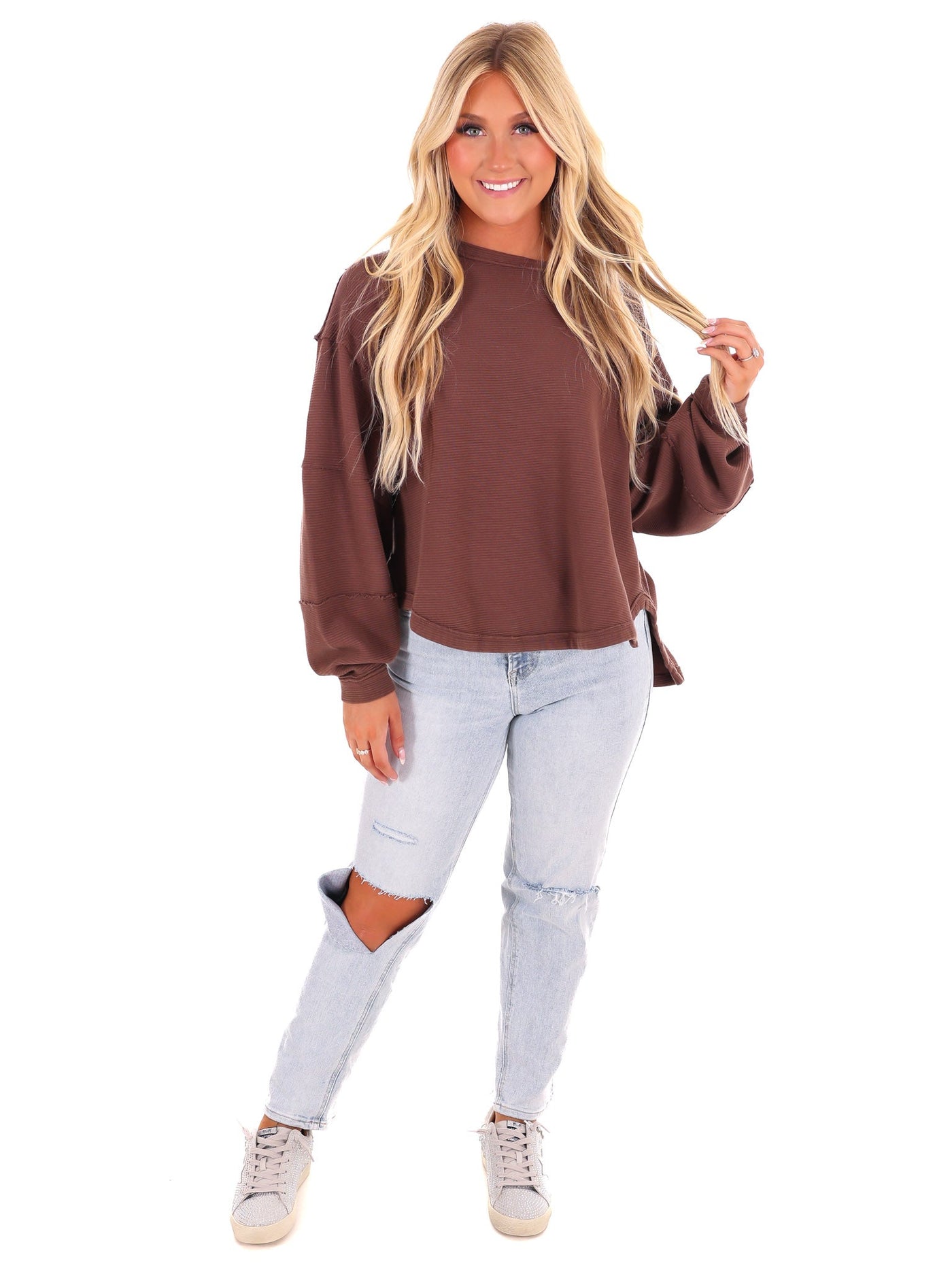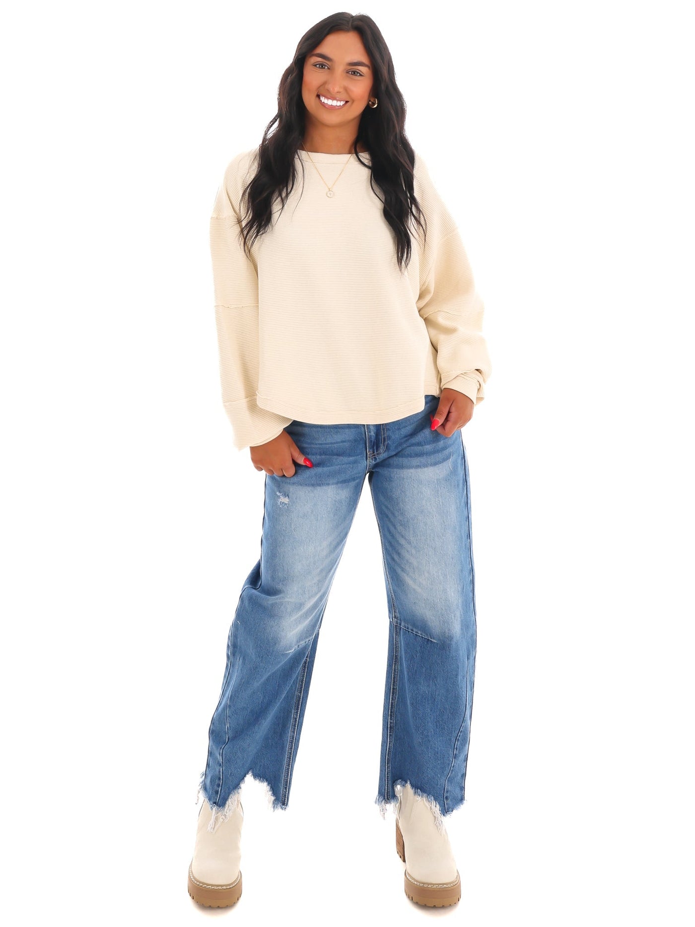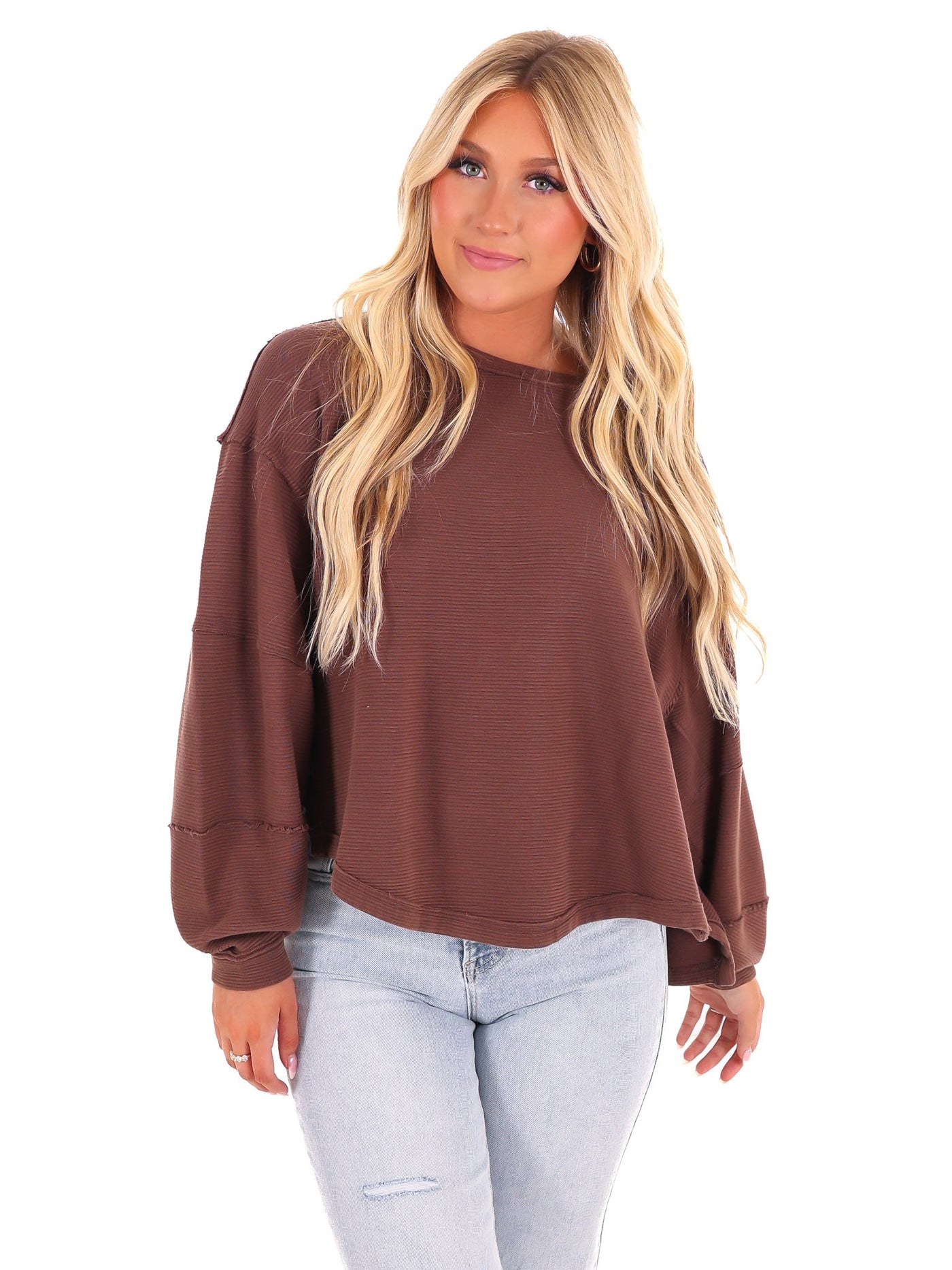 Features: Soft ribbed knit fabrication, slight scoop neckline, dropped dolman sleeves with cuffed hems, raw trim throughout