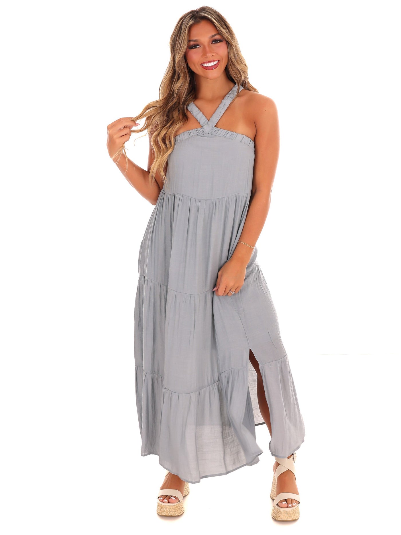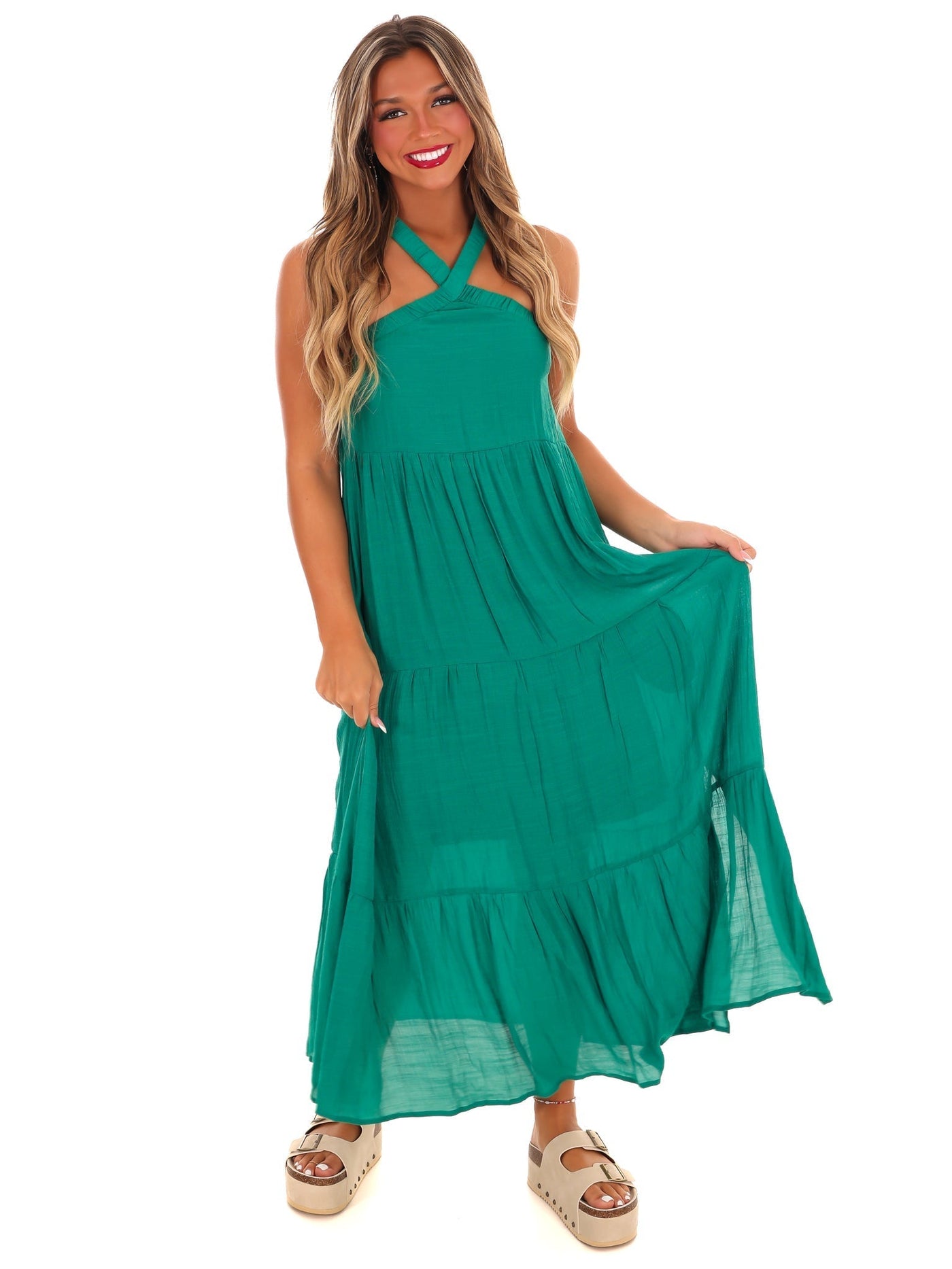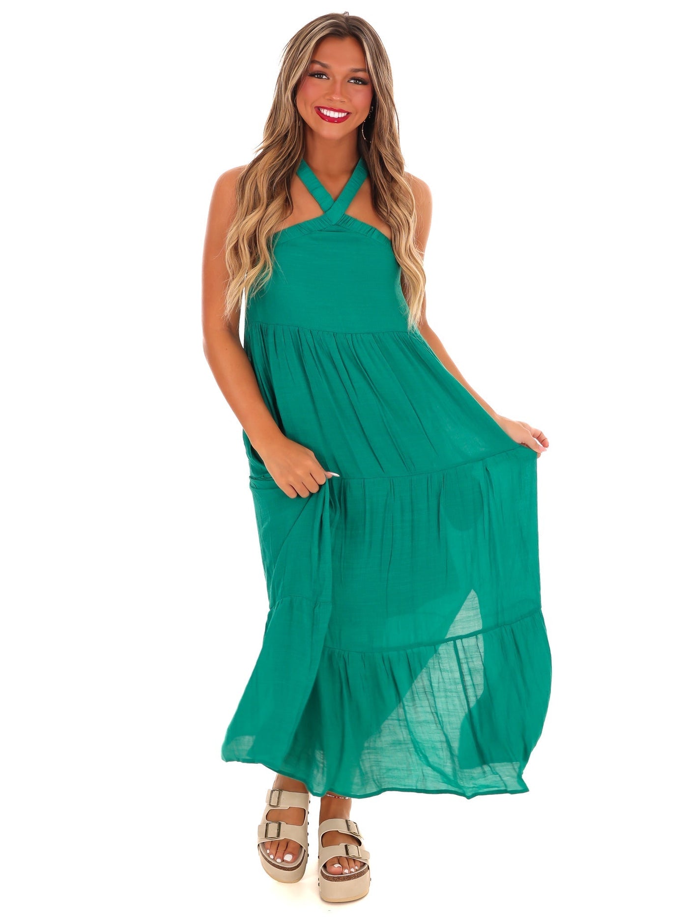 Get ready to turn heads with our Front and Center maxi dress! This halter dress features a unique cross back detail and convenient side pockets. Plus, it's fully lined for a comfortable fit. Perfect for any occasion, this dress will keep you stylish and on-trend.