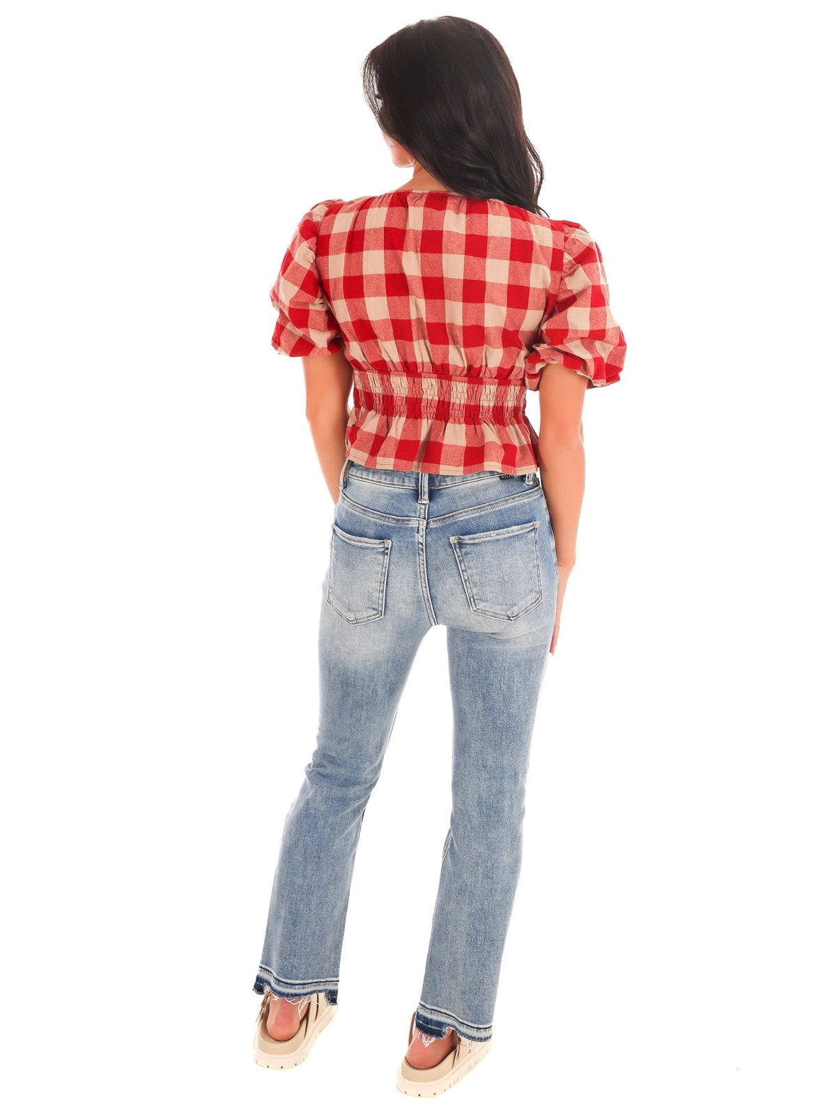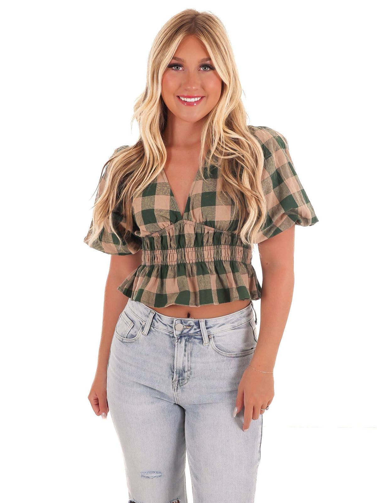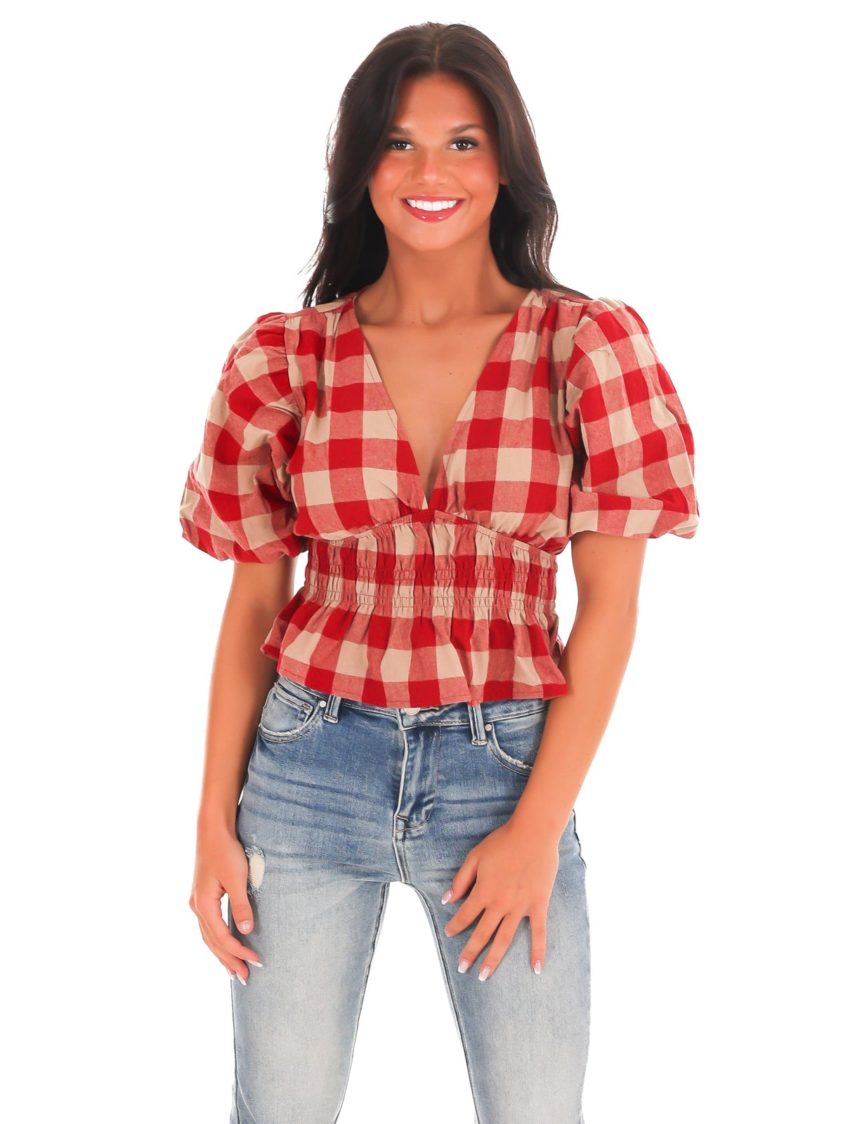 Take a walk on the playful side with our Harvest Hues V-Neck Top! Featuring a gingham print and bubble short sleeves with smocking detail, this top is a fun addition to any wardrobe. Show off your unique style with this quirky and charming top.