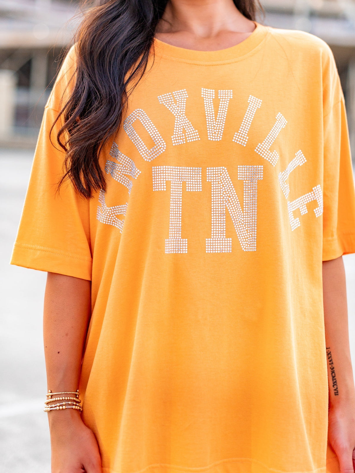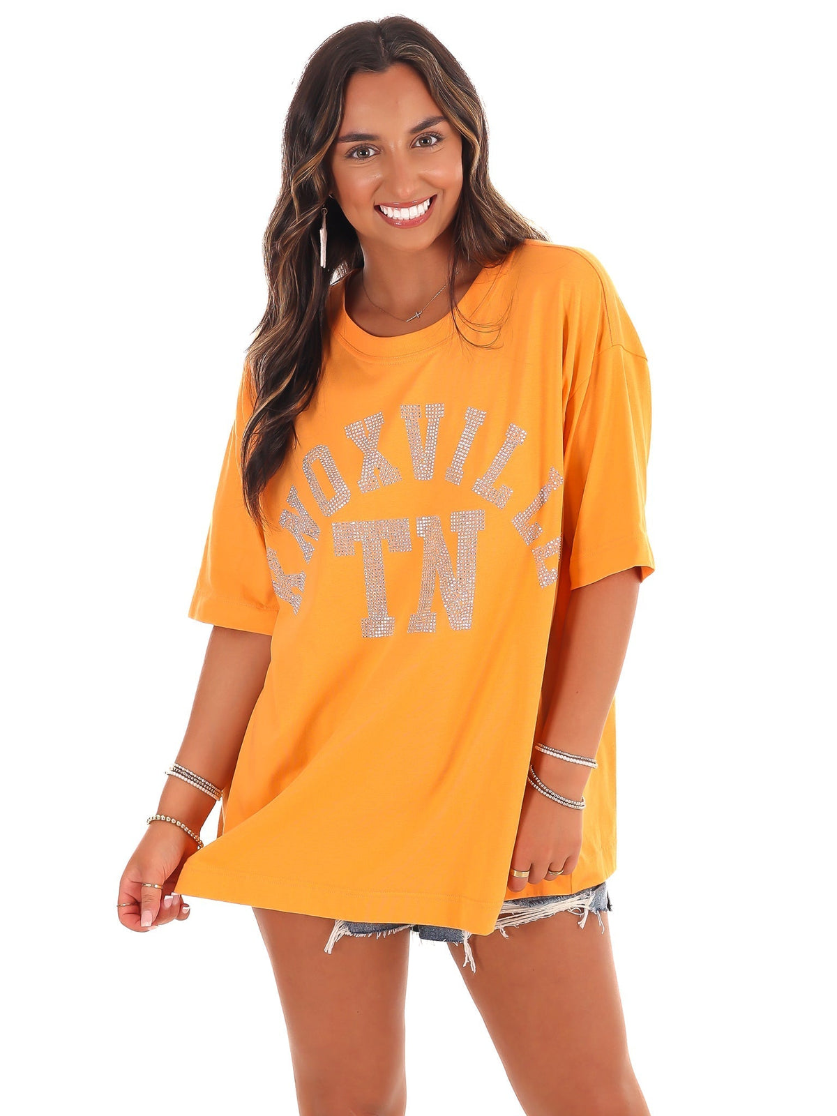 Get ready to shine and show your love for Knoxville, TN with our Rhinestone Tee. This playful orange tshirt is adorned with glimmering silver rhinestones, making it the perfect addition to your wardrobe. Let your style sparkle with this quirky and fun top!