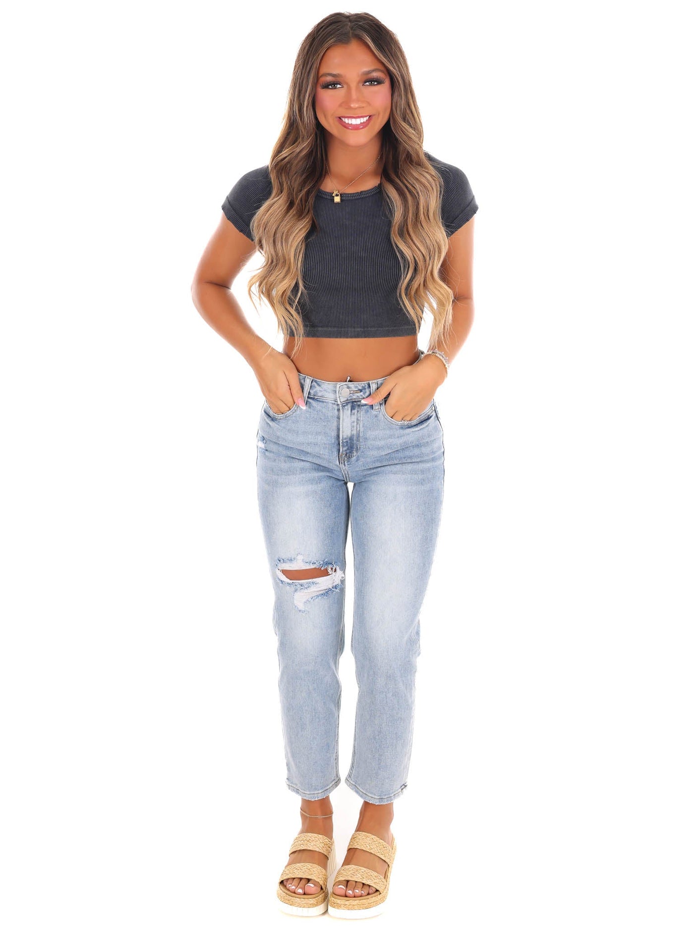 Express your love for fashion with the "Love is A Song" crop top. Featuring a distressed binding and washed short sleeves, this top is perfect for a casual day out. The solid color and slim fit add a touch of style, while the cropped design keeps it trendy. Sing your style loud and proud in this top!