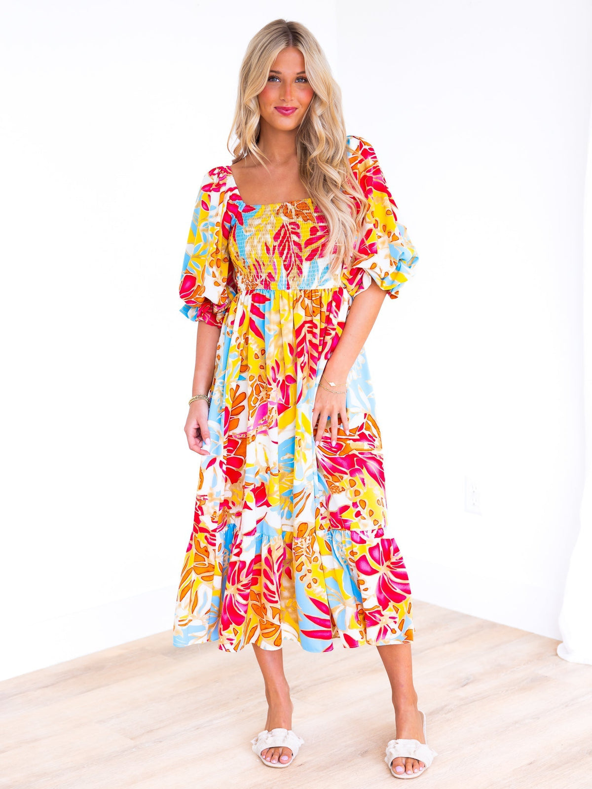 Embrace the power of love in this playful midi dress. Featuring a tropical print, square neck, and half sleeves, this dress is perfect for any occasion. The smocking at the back and elasticized sleeves provide a comfortable fit. The lightweight and non-sheer fabric make it perfect for summer. Spread the love!