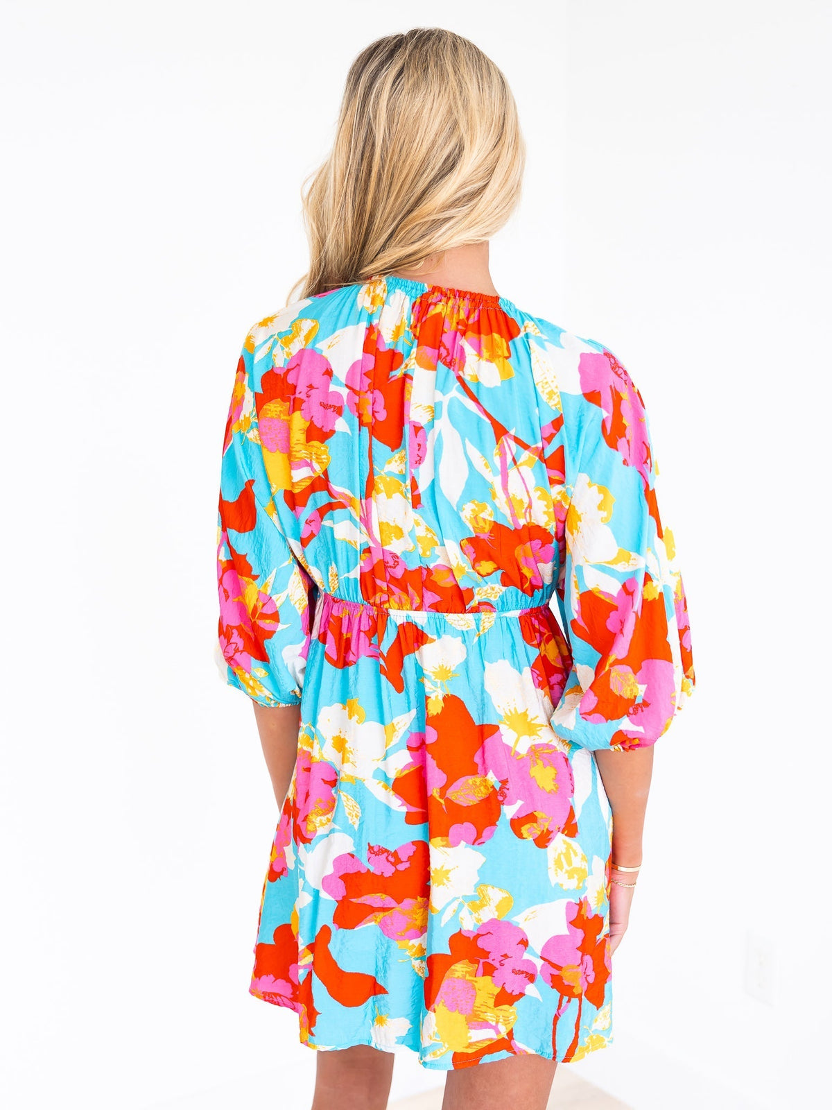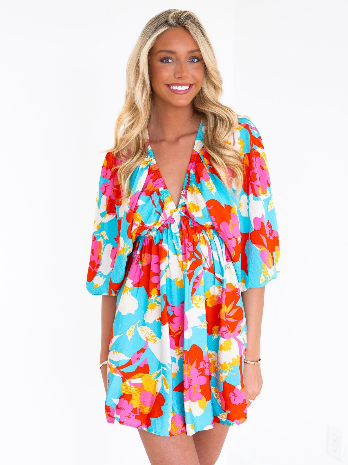 Spread the love (and style) in this bold print mini dress. Features include an elastic v-neckline, exaggerated balloon sleeves, and side pockets. Perfect for any occasion with its colorful flair. (Love it too much? We don't blame you.)