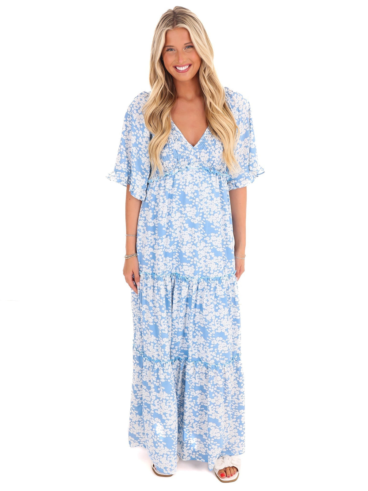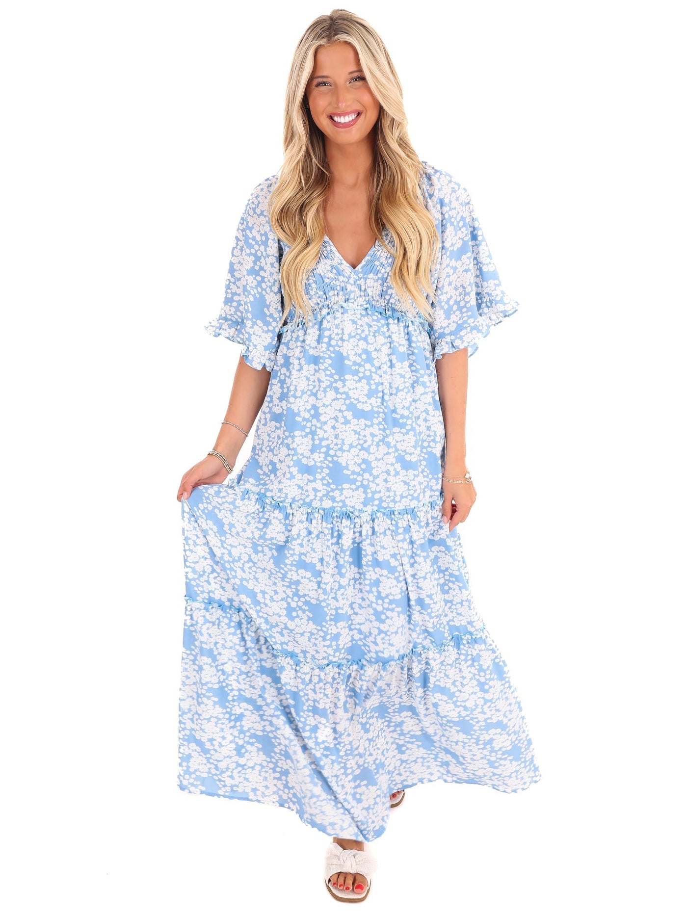 Indulge in this dreamy V-neck maxi dress with flutter sleeves and a smocked, tiered design. Sure to make you smile with its playful print and flowy silhouette. Perfect for a fun day out or a romantic evening.