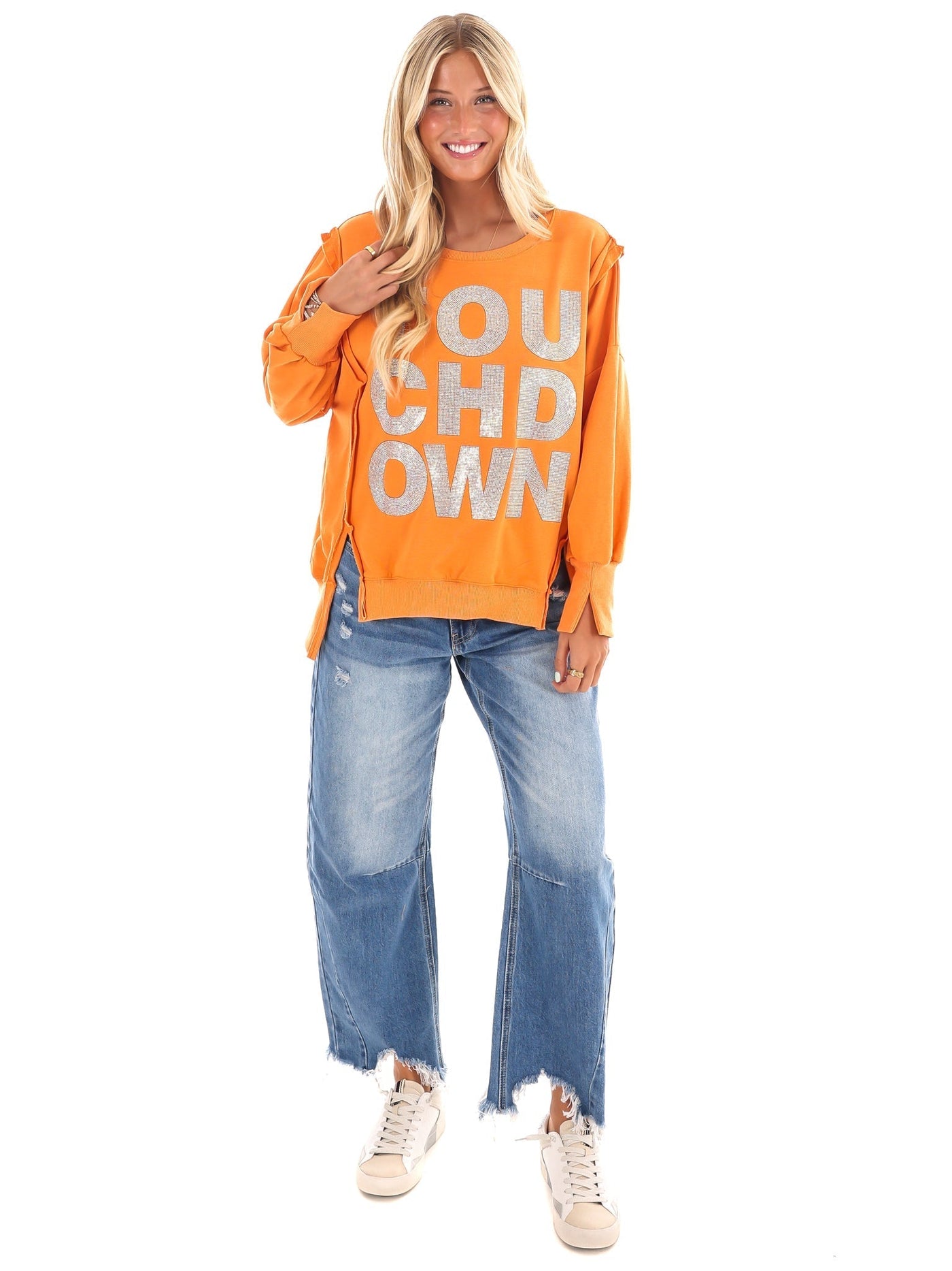 This pullover is sure to score a fashion touchdown! In vibrant orange with a sparkling rhinestone touchdown design, this playful and quirky top is the perfect addition to your wardrobe. Stay warm and stylish with this unique piece.