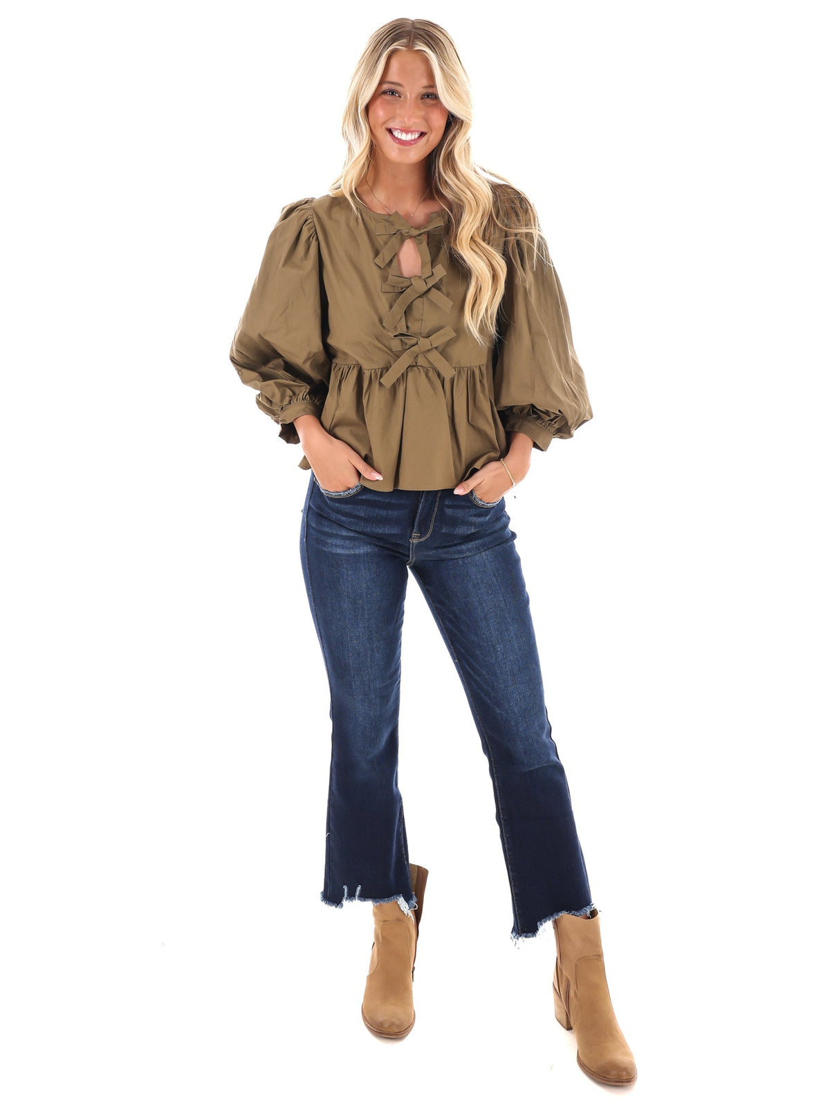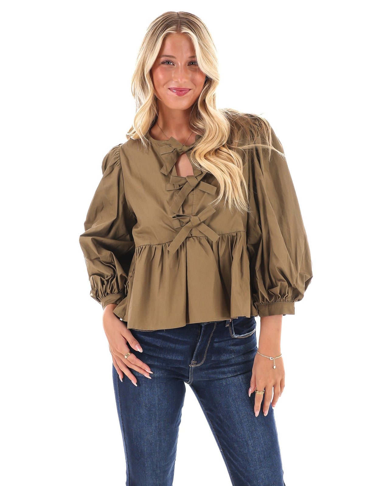 Rock the perfect blend of playful and chic with our Peplum Perfection Bow Top. This U-neck top features a charming bow tie, three quarter balloon sleeves, and stylish band cuffs. Add a touch of fun to any outfit!