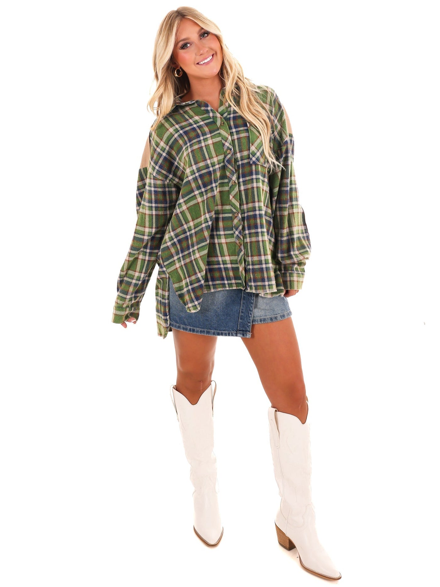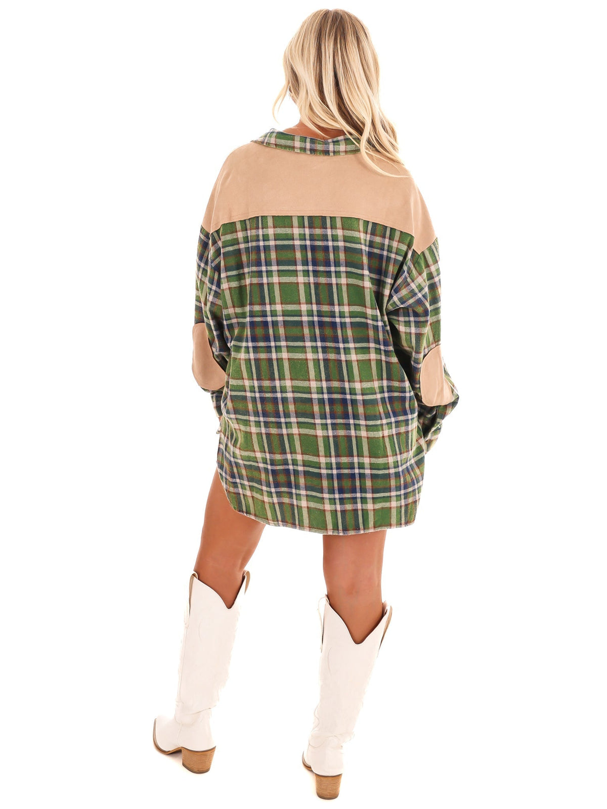 Rock the ultimate cool-girl vibe with our Plaid and True Button Down Top. This top features an edgy acid wash and unique suede fabric on the shoulders and elbows. With a loose, relaxed fit, dropped shoulders, and side slits, this top is perfect for a laid-back, yet stylish look. The front chest pocket and button down closure add a touch of classic charm.