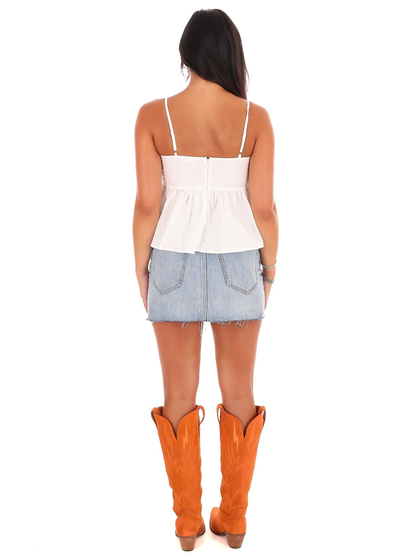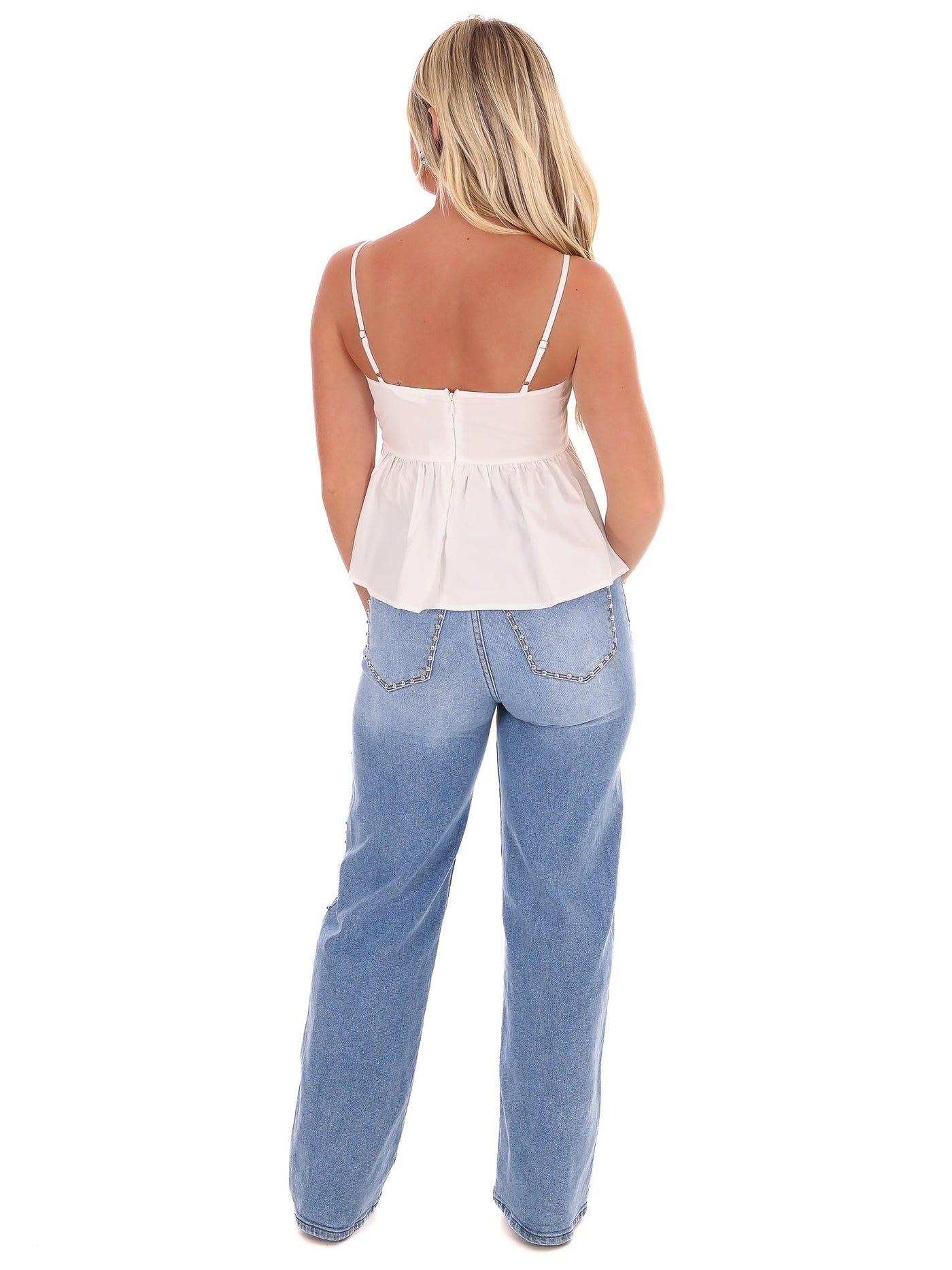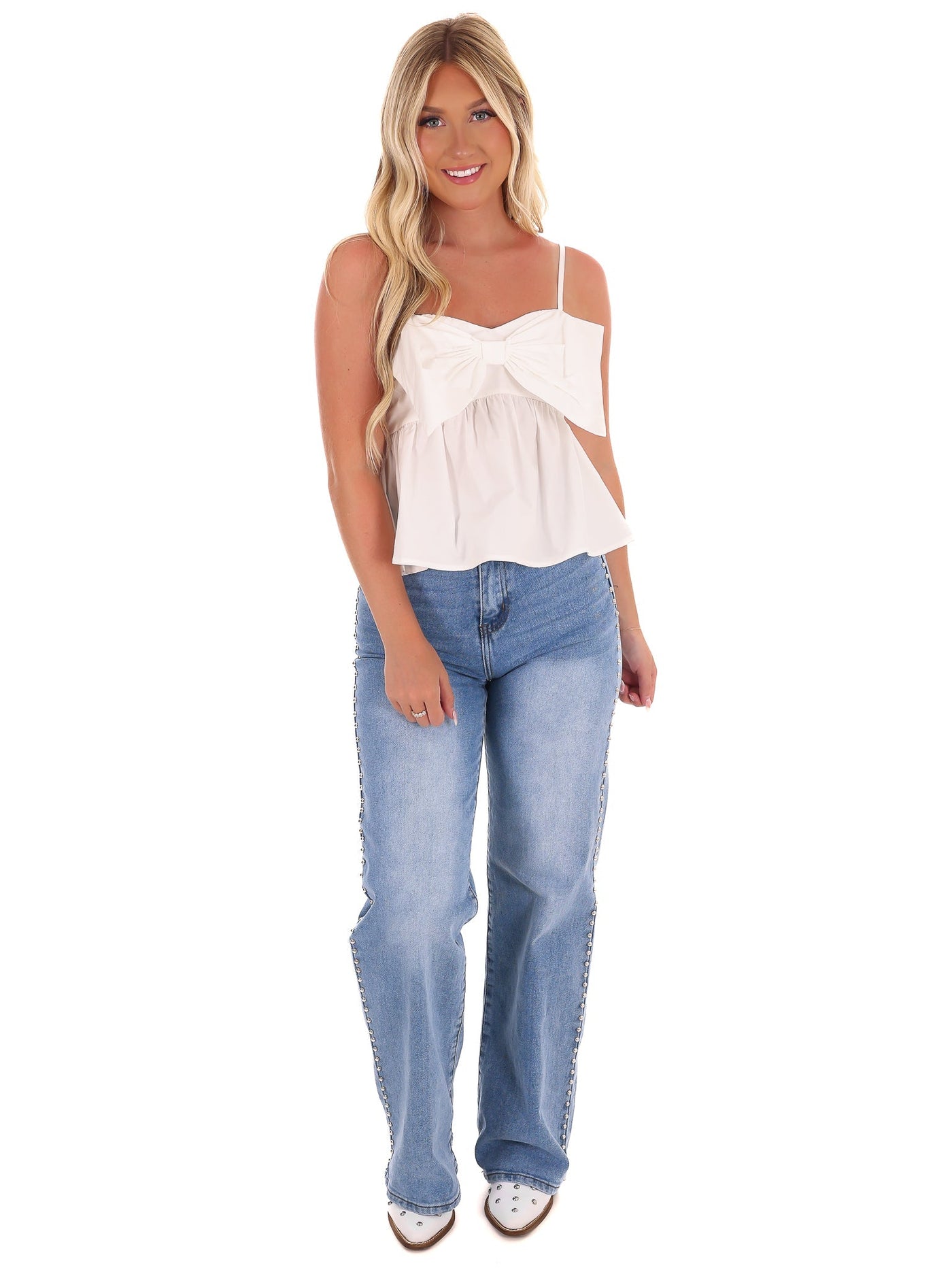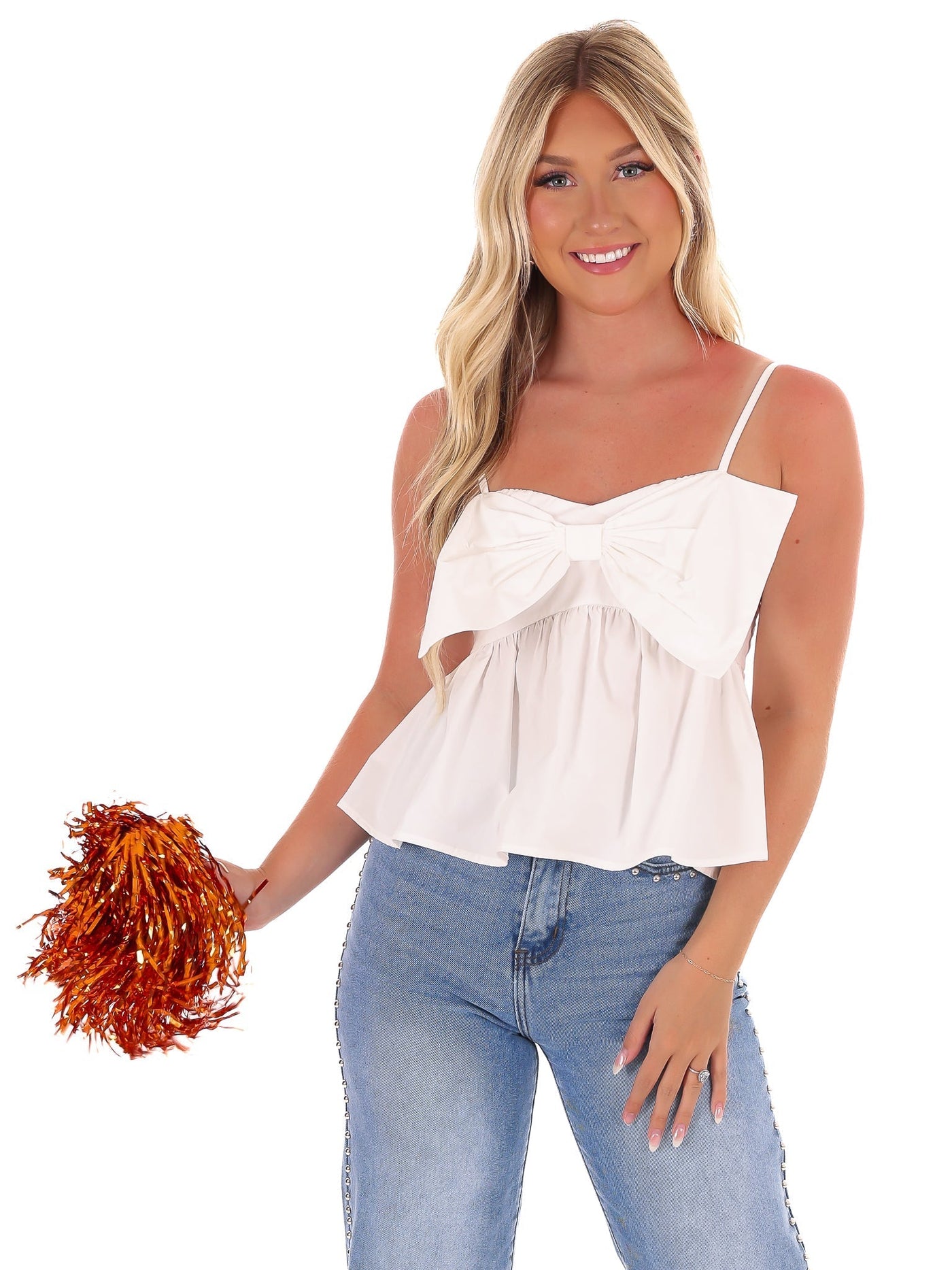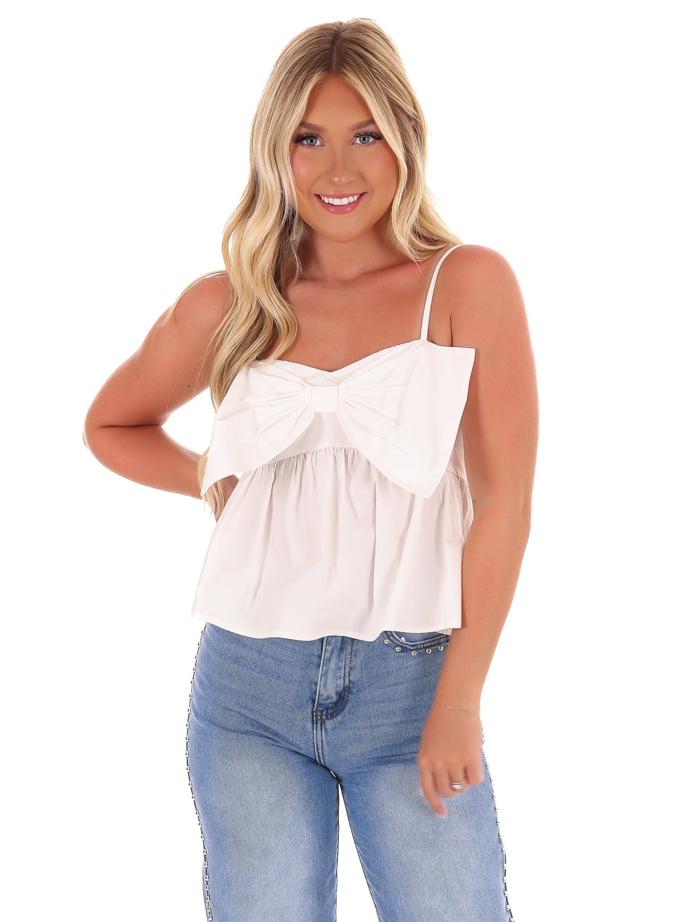 Introducing the Show Goes On Bow Top! This playful spaghetti strap babydoll top will have you feeling cute and carefree. The bow detail adds a touch of whimsy to any outfit. Don't miss out on this fun and flirty piece!