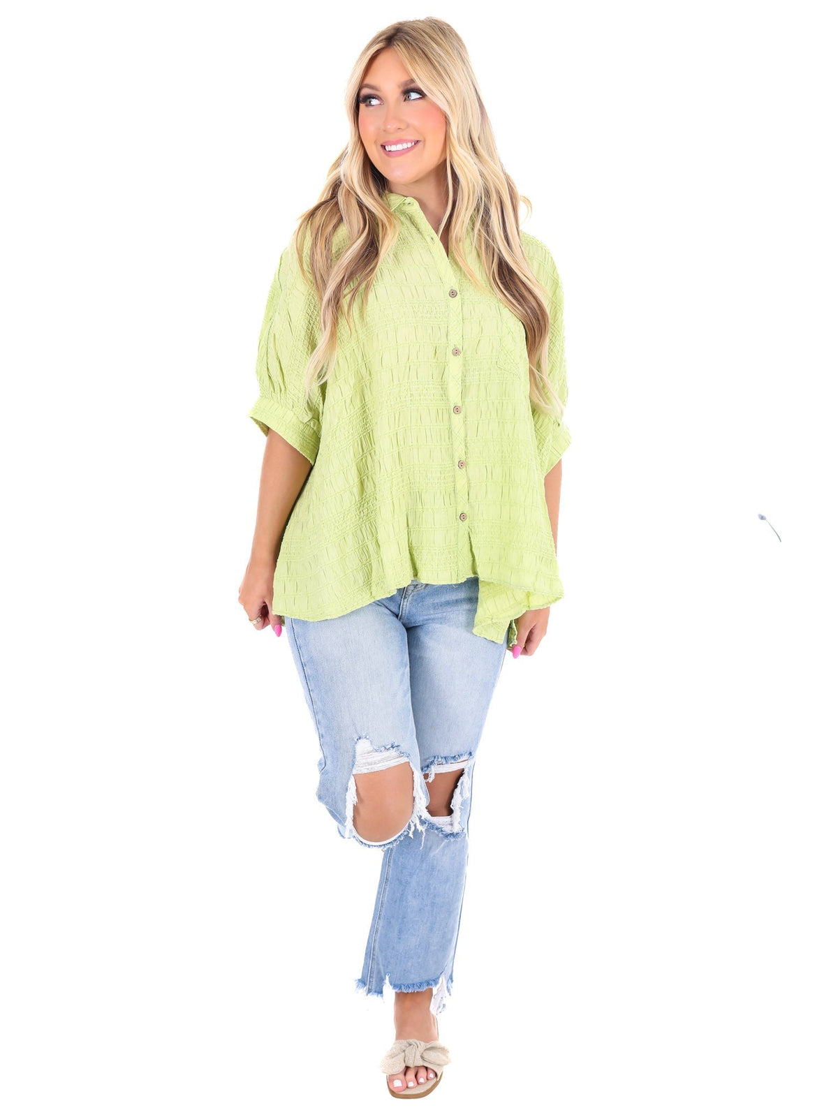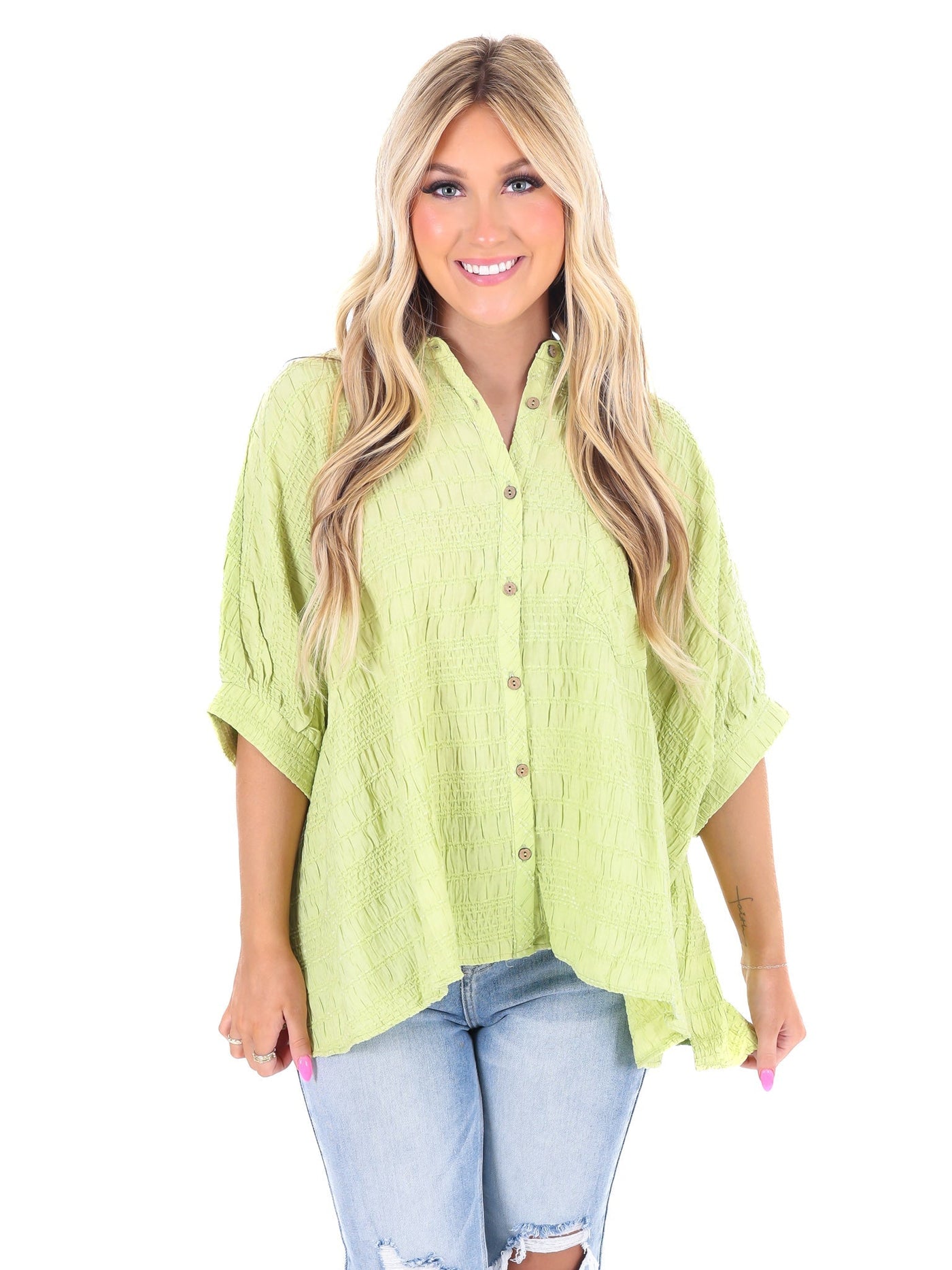 Introducing our Slow it Down Textured Button Down Top! With a collared neckline, button-down front, and front chest pocket, this oversized shirt is perfect for a relaxed and laid-back look. The rolled arm cuff adds a touch of cool, while the textured woven fabric provides a slight stretch for all-day comfort. Slow it down and embrace the chill vibes with this must-have top!