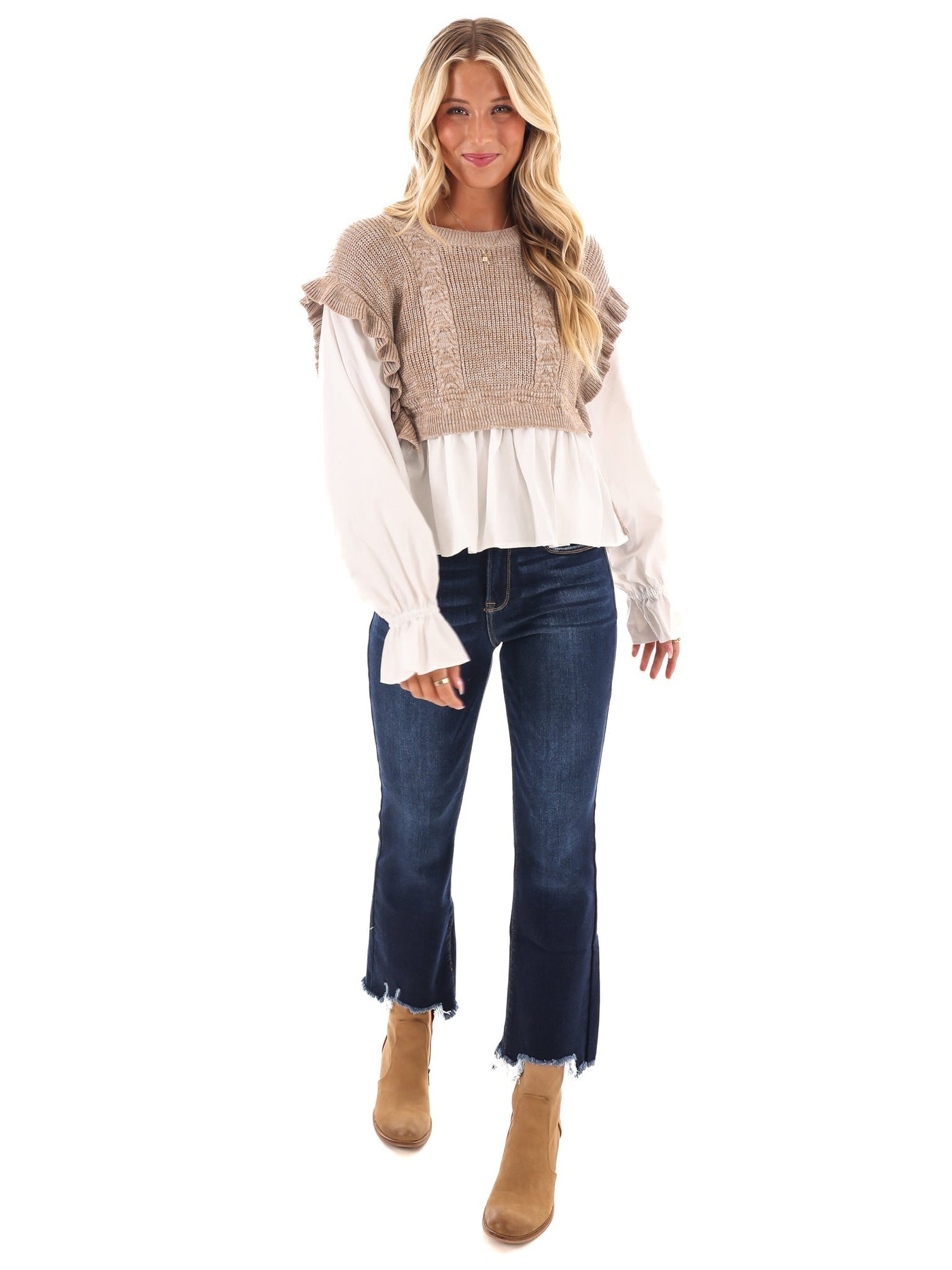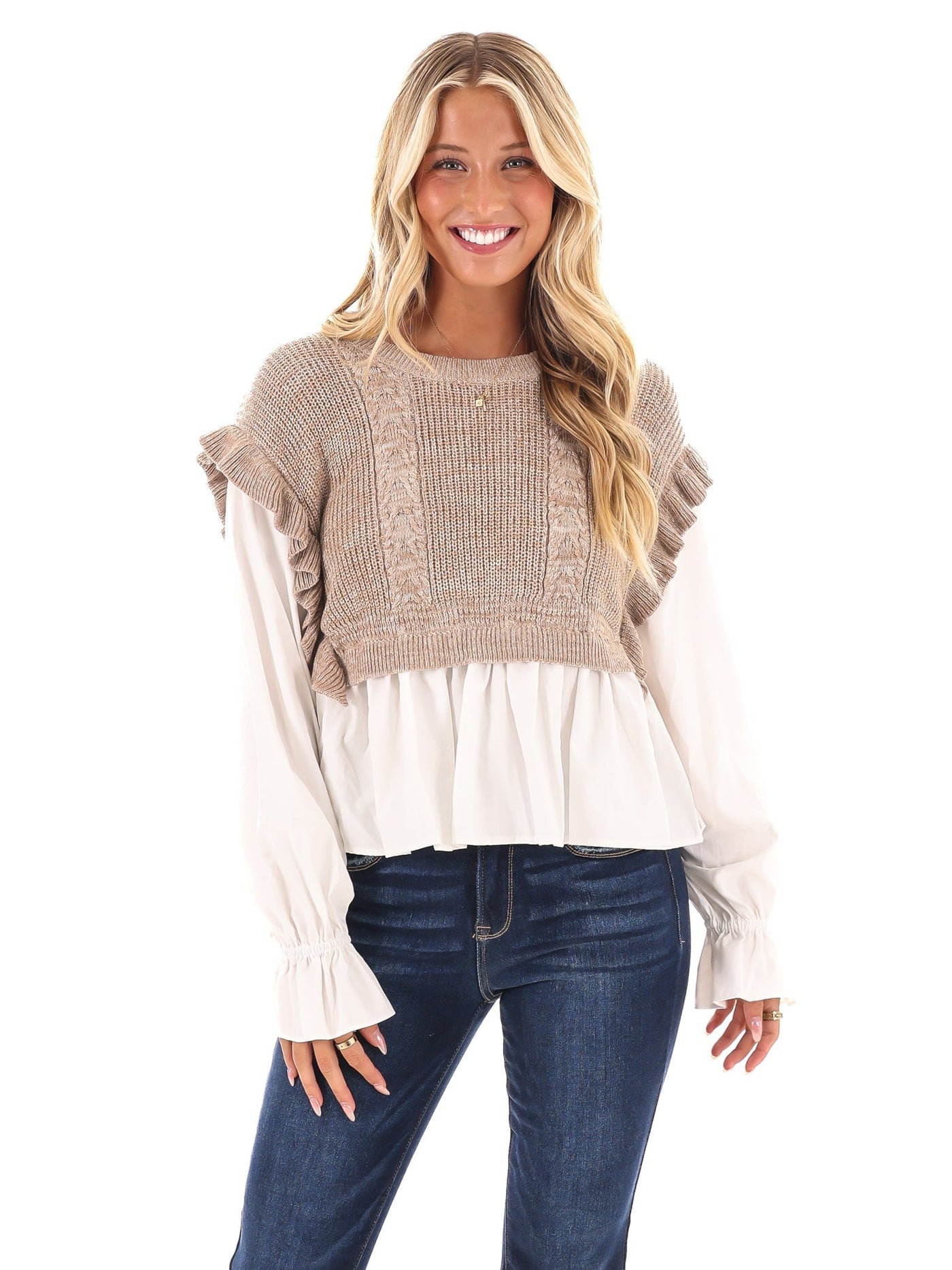 Elevate your style with our Sophisticated Layers Top. This knitted vest blouse features a flattering scoop neckline, long sleeves with elastic cuffs, and playful ruffles. Perfect for adding a touch of fun to any outfit.