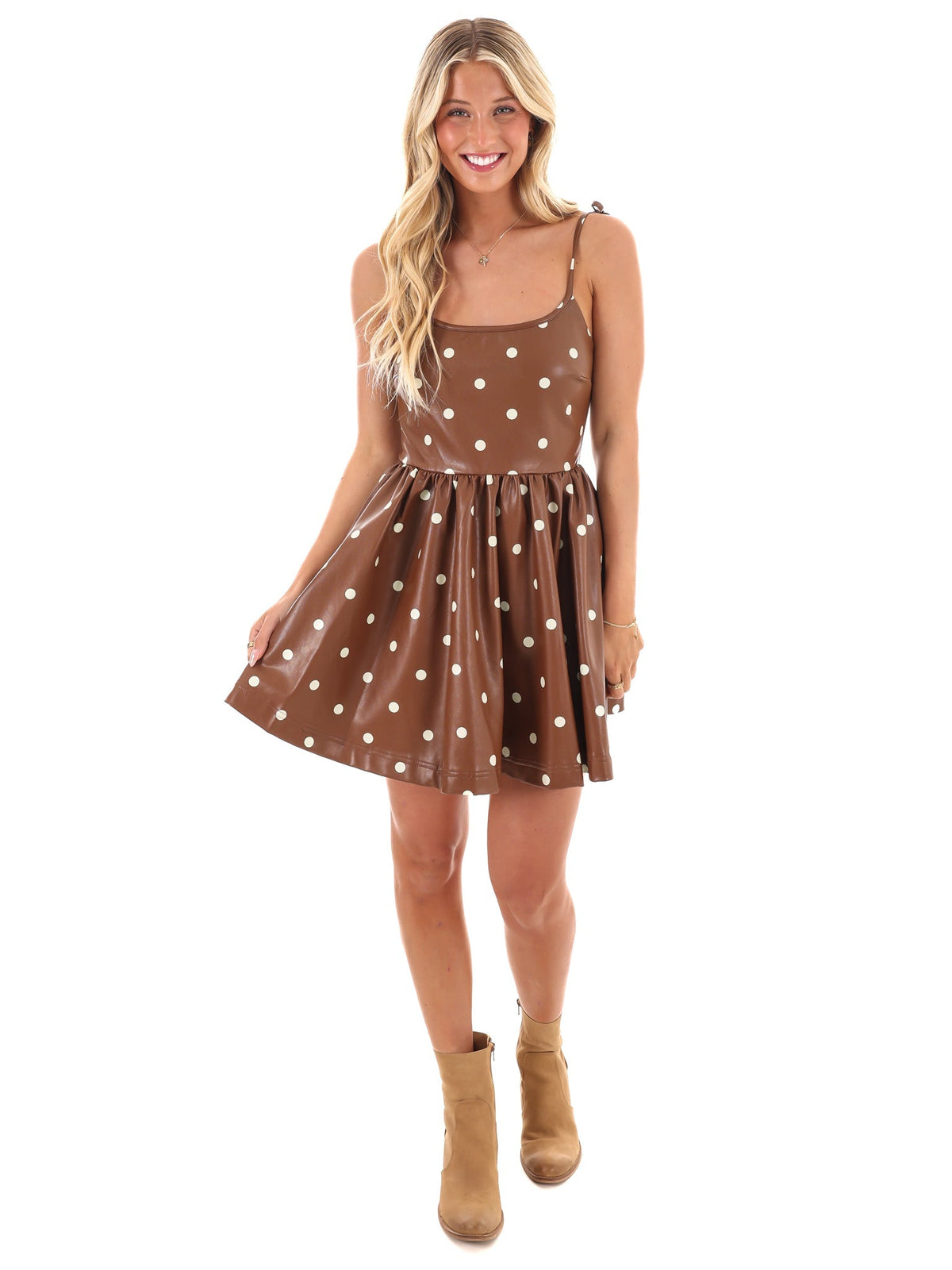 Get ready to steal the spotlight in this flirty faux leather polka dot mini dress. With charming straps that tie into a bow, this dress is sure to make a statement. And with a zipper back closure, getting dressed will be a breeze. Fashion meets fun in this must-have dress. Elevate your style game without sacrificing comfort!