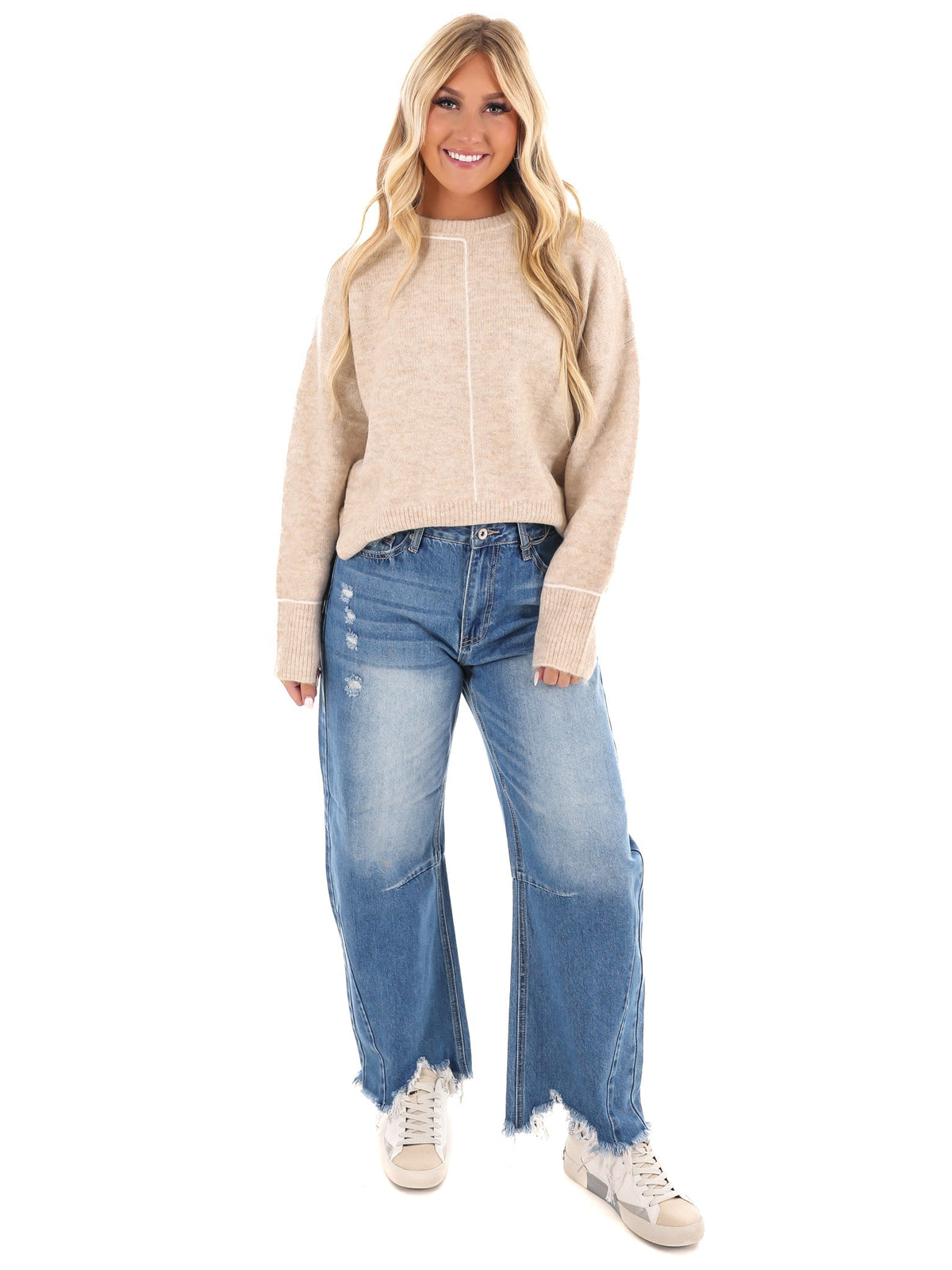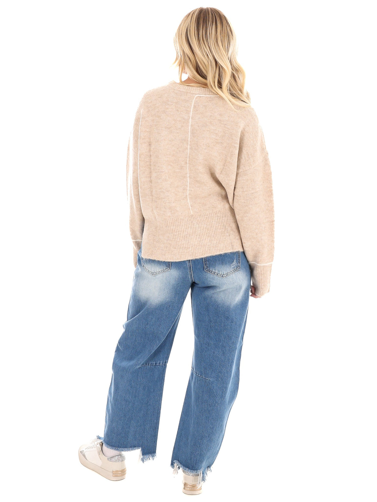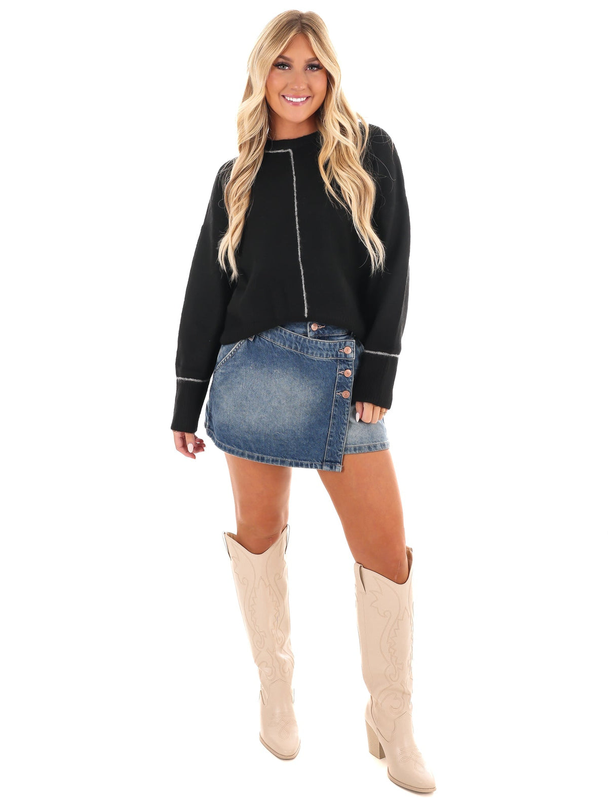 Stay cozy and stylish with our Stay Together Sweater! This playful pullover features a round crewneck and long sleeves, with a unique contrast line detail and ribbed accents. The drop shoulder design adds a relaxed touch, while the side hem split adds a trendy flare. Made from sweater knit for ultimate comfort, this sweater is a must-have addition to your wardrobe.