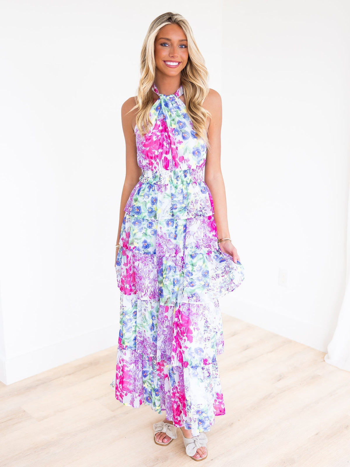 Elevate your style with our Sunday Best Floral Maxi Dress. The halter neck and tiered ruffle hemline add a touch of whimsy, while the smocked waistband ensures a flattering fit. The bold floral print is sure to turn heads. Perfect for any occasion!