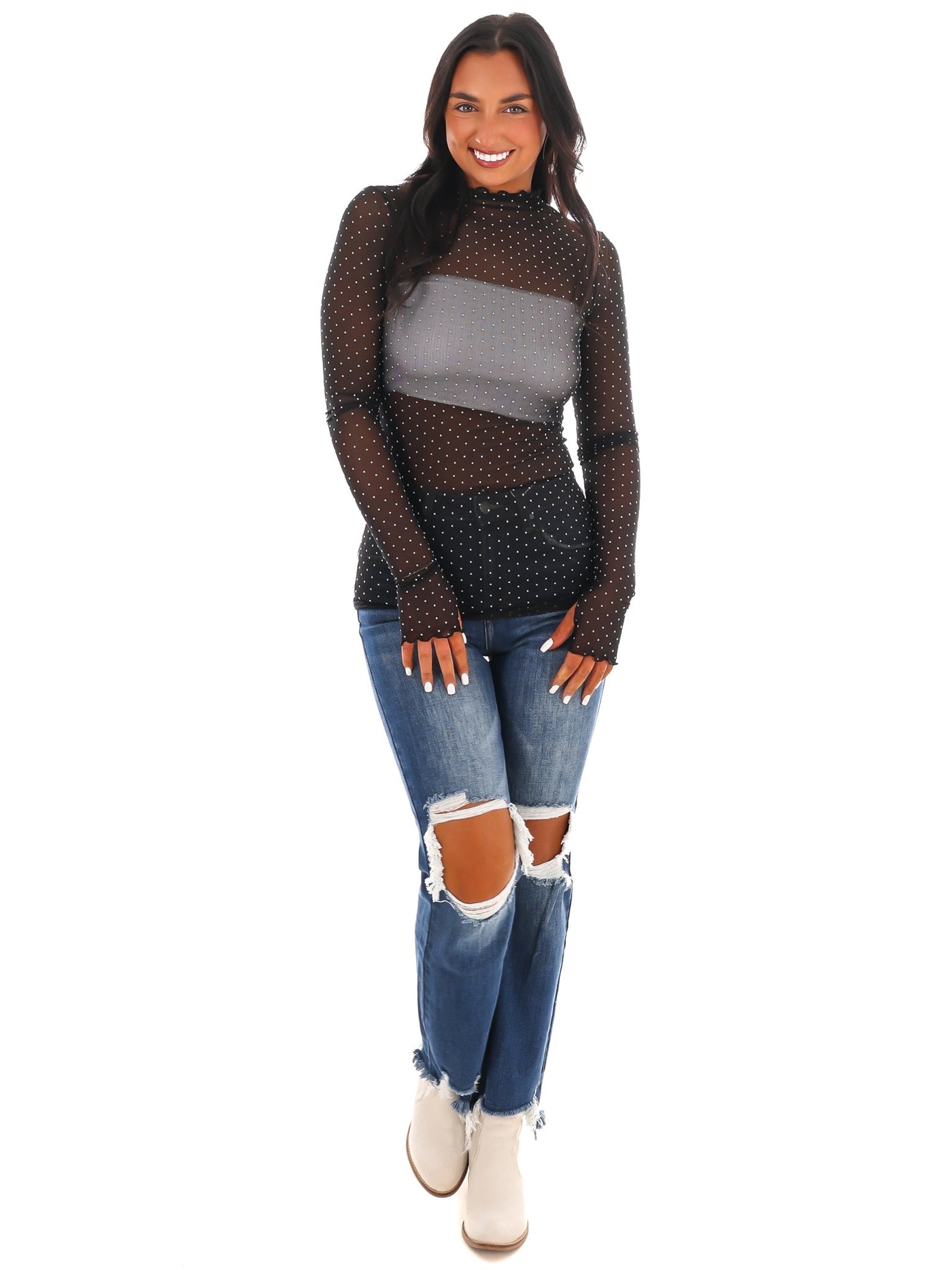 Discover your playful side with the Tell Me Something Mesh Polka Dot Top. Featuring polka-dot flocking all over the body, this top is perfect for adding a touch of whimsy to your wardrobe. The soft, stretchy mesh fabric ensures a comfortable and flattering fit, while the high neck and thumb-hole sleeves add a unique twist. Get ready to make a statement in this slim-fit top!