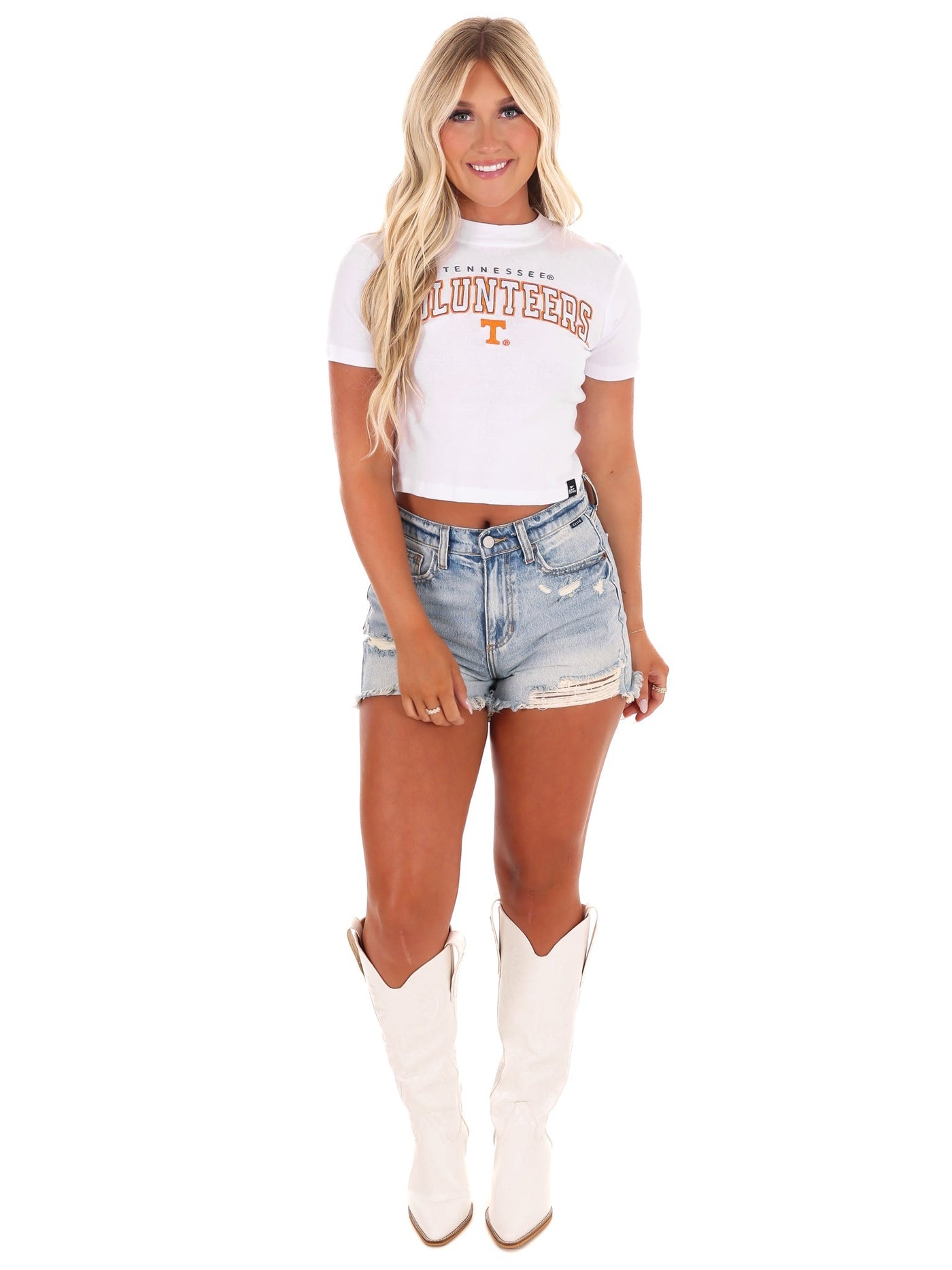 Get ready for game day with our Tennessee Volunteers Embroidered Crop Tee. This trendy Women's Baby Tee offers a tighter, cropped fit for a unique style. Pair it with sneakers and blue jeans for a standout game day look. (And say goodbye to basic t-shirts!)