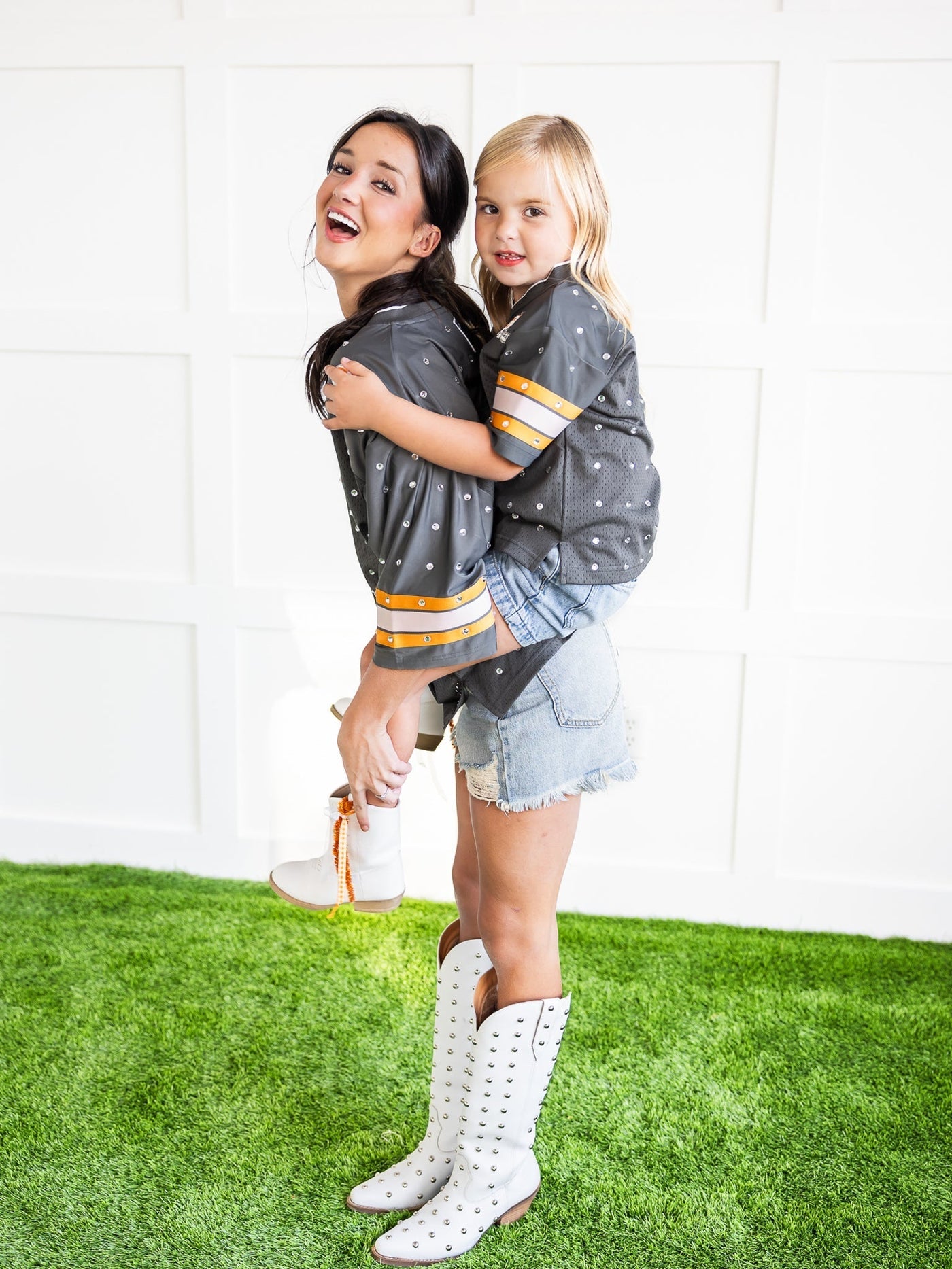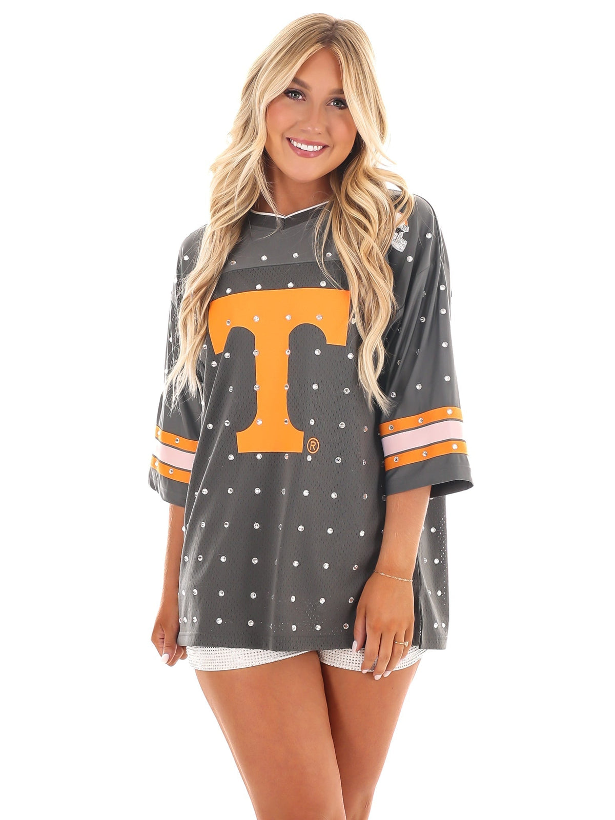 Game day just got better with our Tennessee Volunteers all-over rhinestone v-neck sports stripe fashion jersey top. Ideal for both game day and everyday wear, show off your team pride.