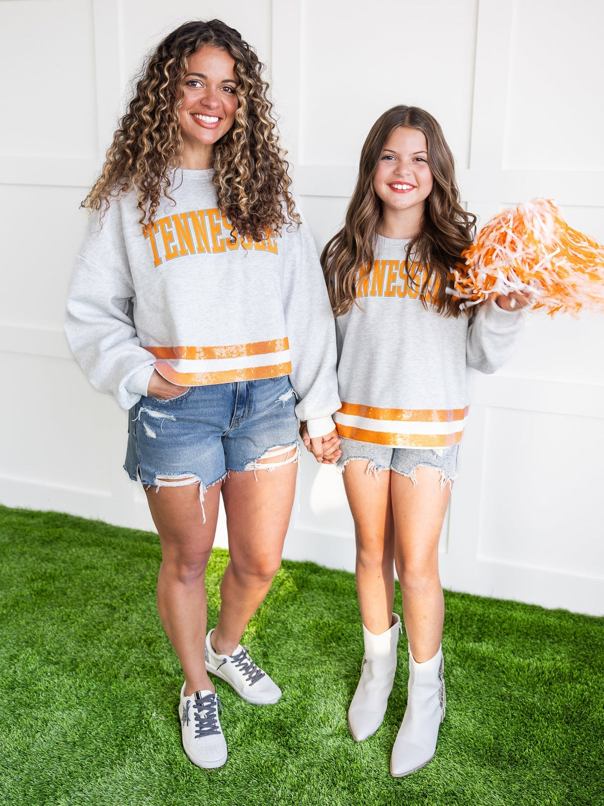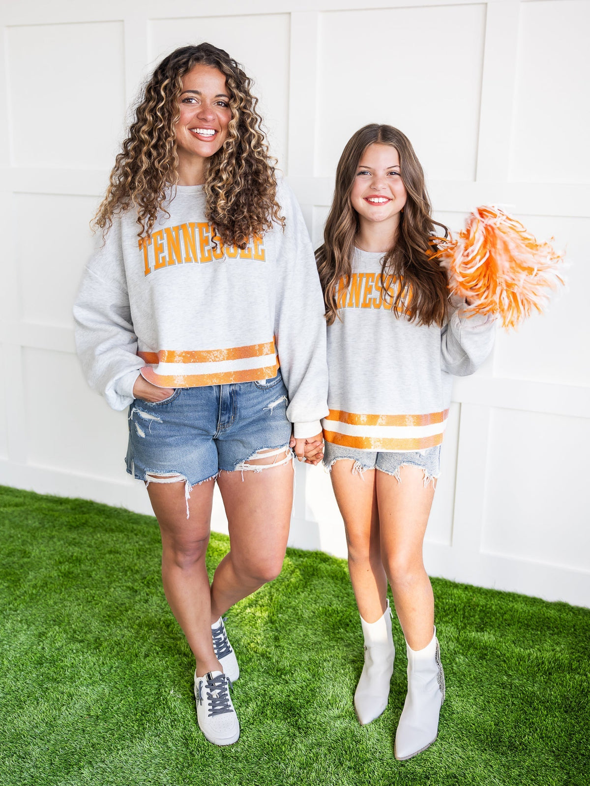 Add some sparkle to your game day look with the Tennessee Volunteers Pass the Shine Sequin Crop Sweatshirt! The orange and white stripes along the hem feature eye-catching sequins, making this sweatshirt a stylish way to show off your team spirit. With a playful and quirky tone, this sweatshirt is perfect for the fun-loving fan.