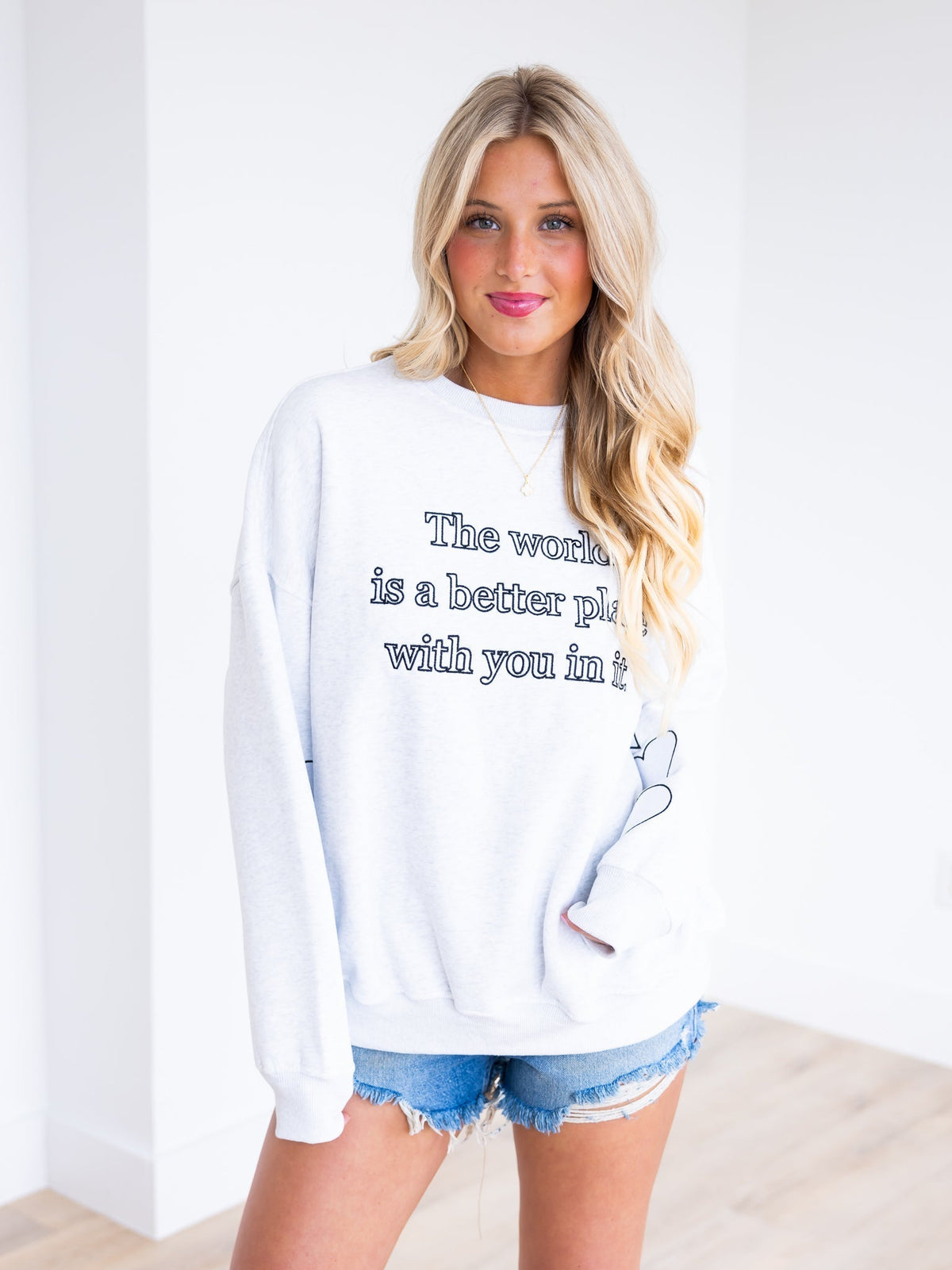 Spread some love and positivity with our "The World is A Better Place With You In It" sweatshirt! Made with a cozy crew neckline and embroidered hearts on the sleeves, this sweatshirt is a reminder that you make the world a better place. Spread joy and warmth while staying stylish in this playful and quirky sweatshirt.