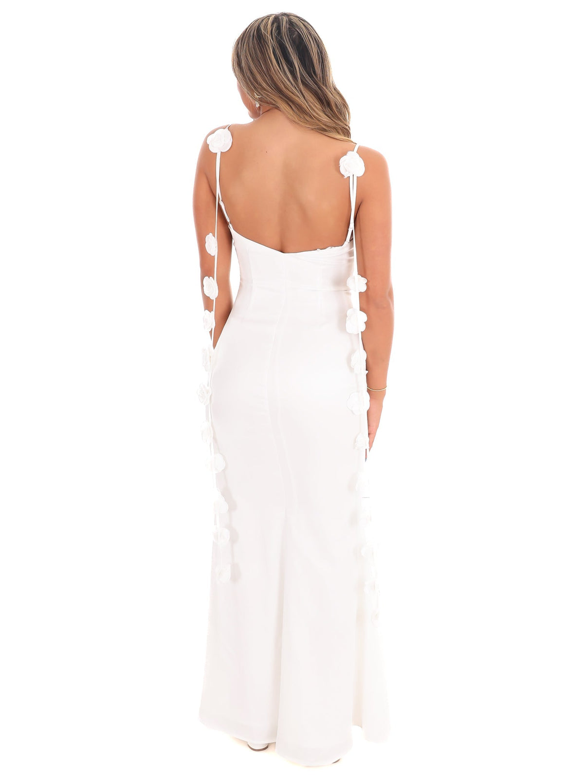The perfect dress for garden parties and summer soirees! This stunning white maxi dress features a delicate rose design cascading down the back straps, adding a touch of whimsy to your look. With a lined bodice, you'll feel confident and comfortable all day.