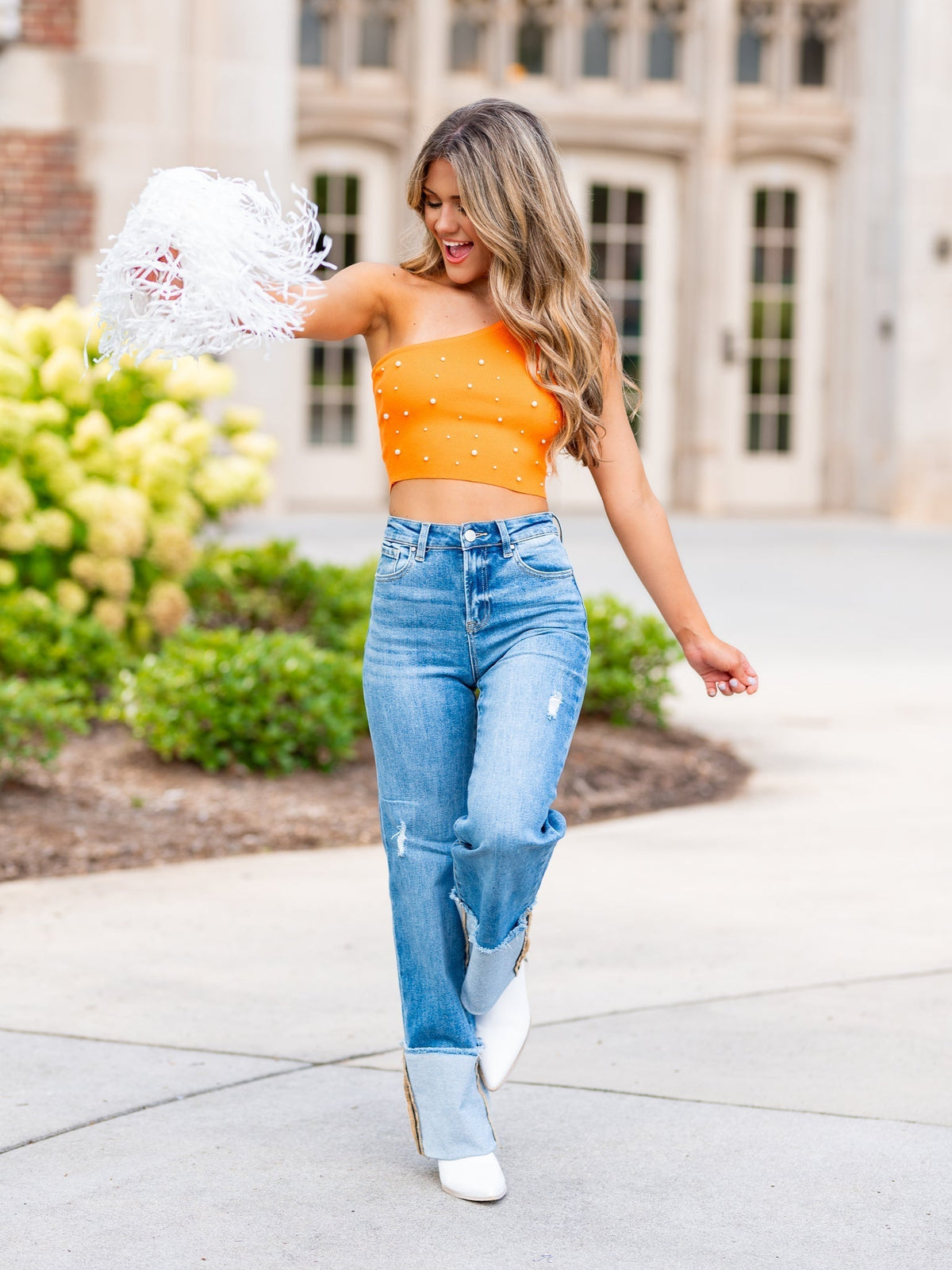 Through the T One Shoulder Pearl Crop Top - Orange / S