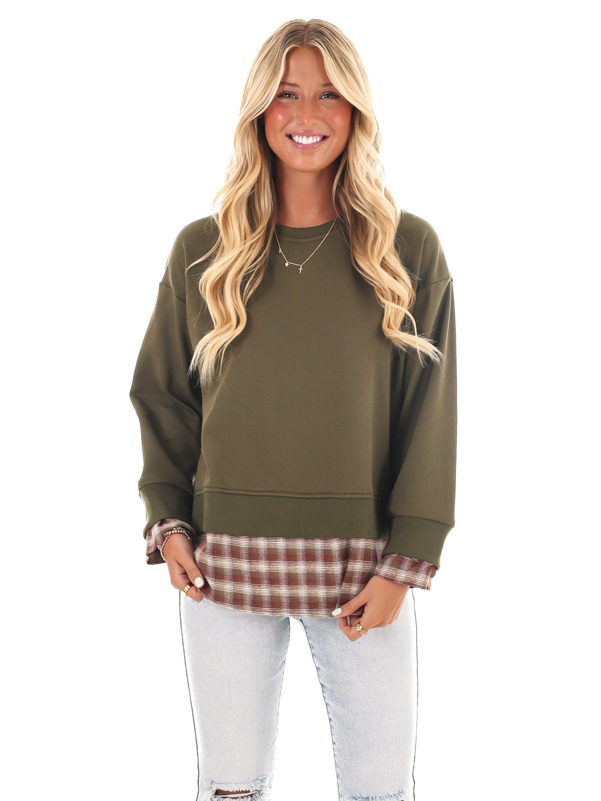 True to Me Plaid Contrast Top - Dark Olive / S