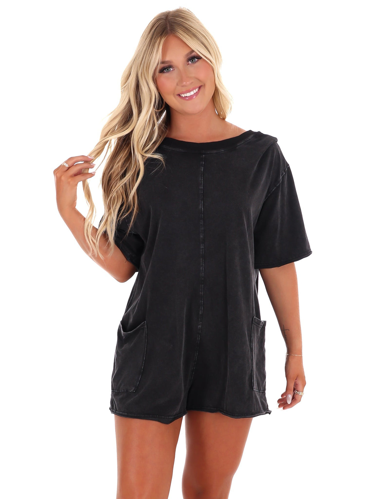 Introducing our All Yours Washed Romper - perfect for summer days. This vintage washed romper features short sleeves and a back opening, with the added convenience of front pockets. Comfort and style, all in one. Get it while it's hot!