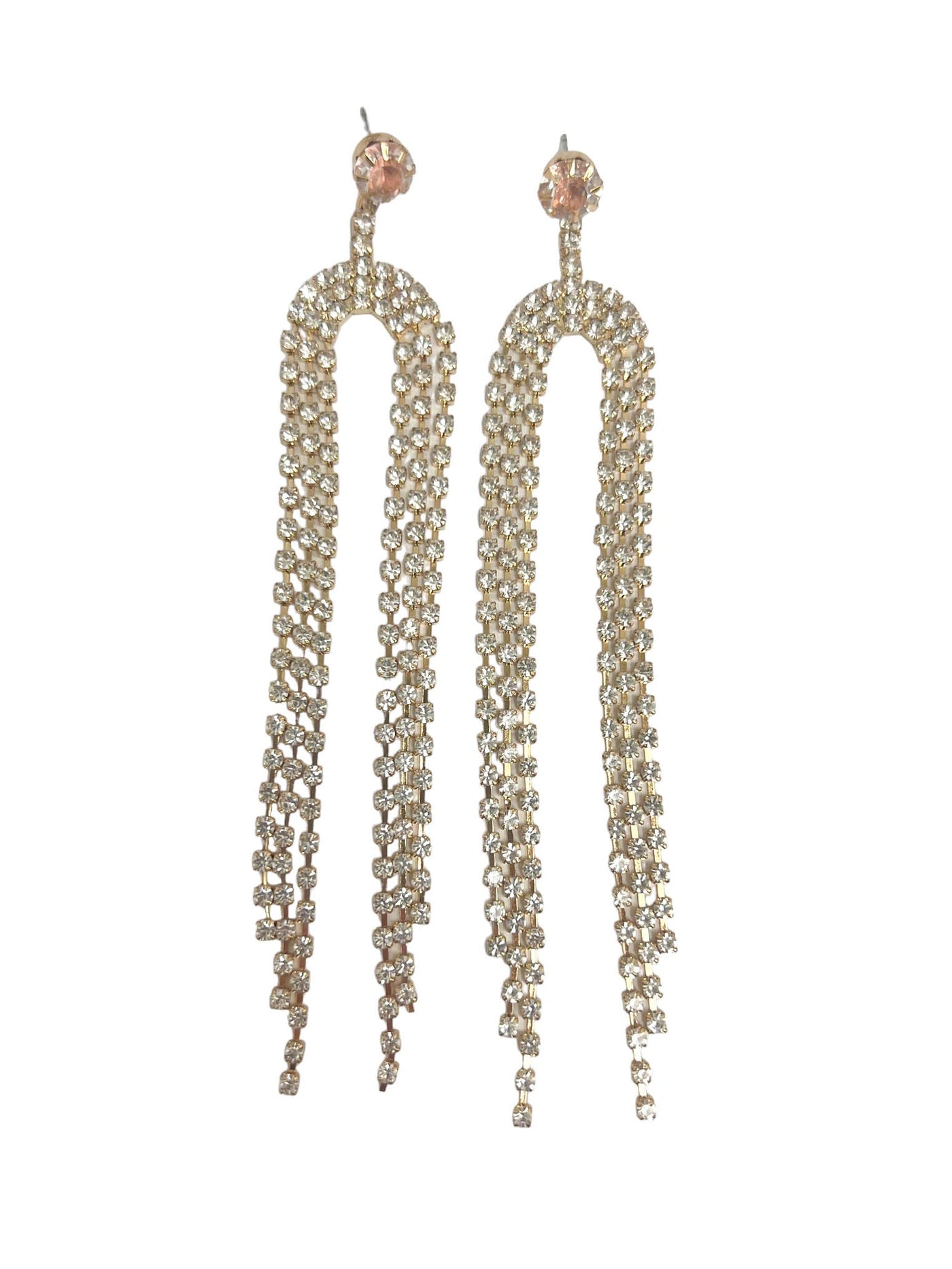 These Arched Rhinestone Drop Earrings will make any outfit sparkle! The arched fringe, combined with the shimmering rhinestones, will add a glamorous touch to any look. Make a statement in style!