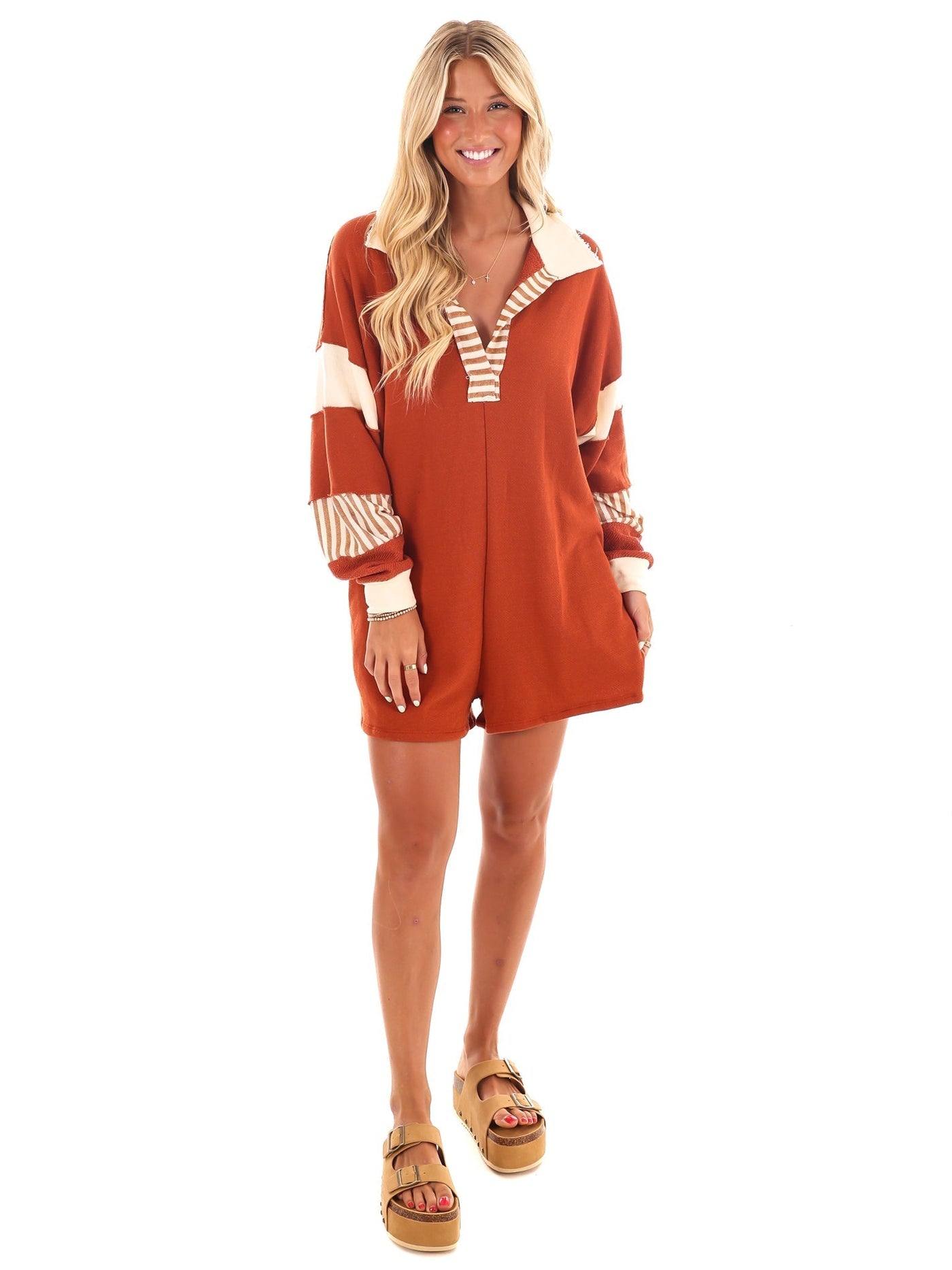 Get ready to have some fun in the Can't Escape You Collared Romper. This French Terry, color-blocked romper features a big collar and Henley style with long dolman sleeves. The contrast color block details and raw edge details add a quirky touch to this oversized romper. Plus, side pockets for all your essentials. Let the good times roll!