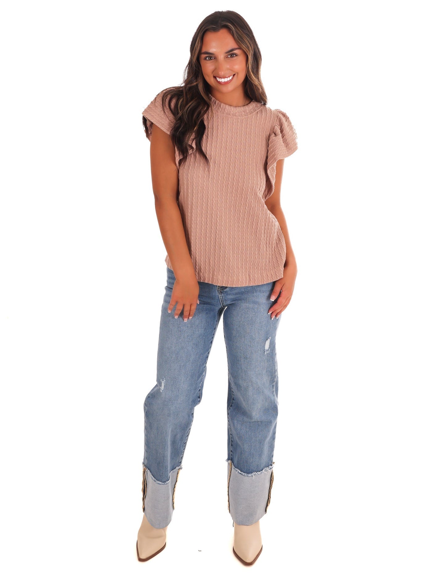 Add some flair to your wardrobe with our Carry My Love Textured Top! Featuring flutter sleeves, cable knit texture, and shirring detail, this top is sure to turn heads. Perfect for any occasion, this round neck top will be your new favorite statement piece!