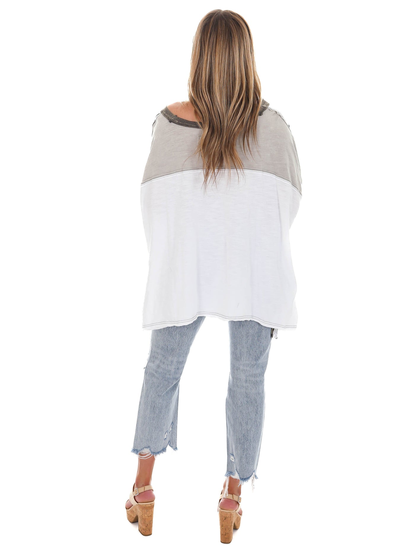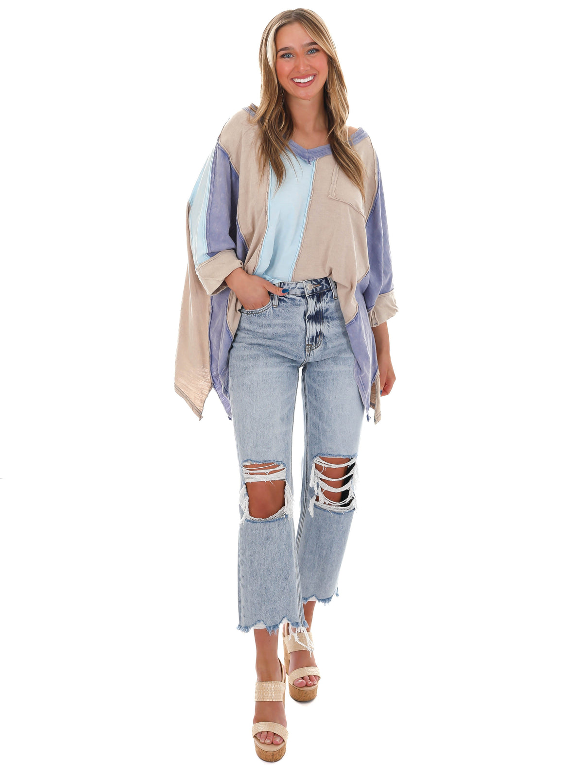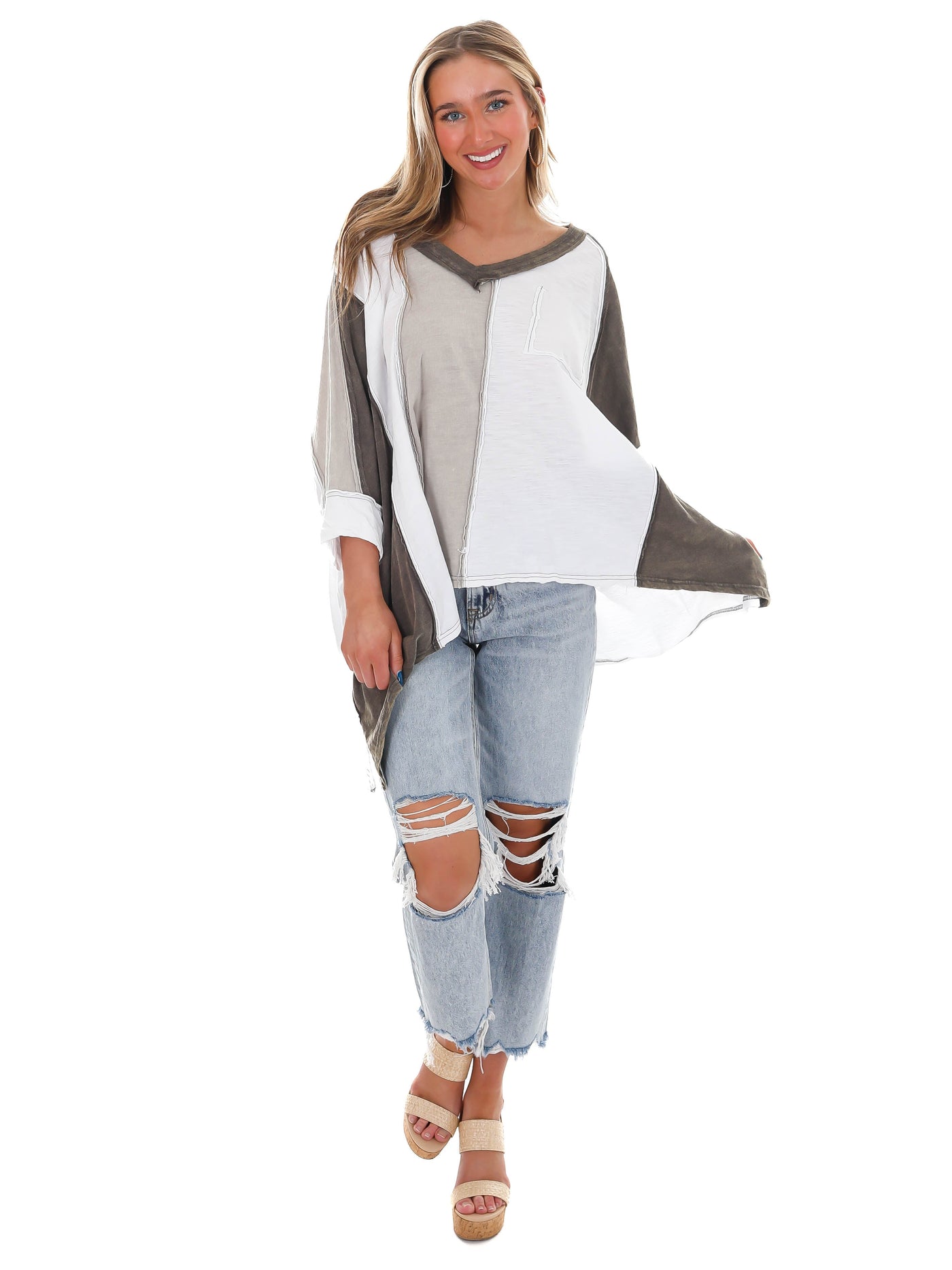Look and feel stylish and comfortable in this Catch the Wind Oversized Colorblock Top. With an oversized fit, flattering V-neckline, side slits, exposed seams and stylish colorblock design, this top will have you feeling confident and looking great. Welcome the new season in style!