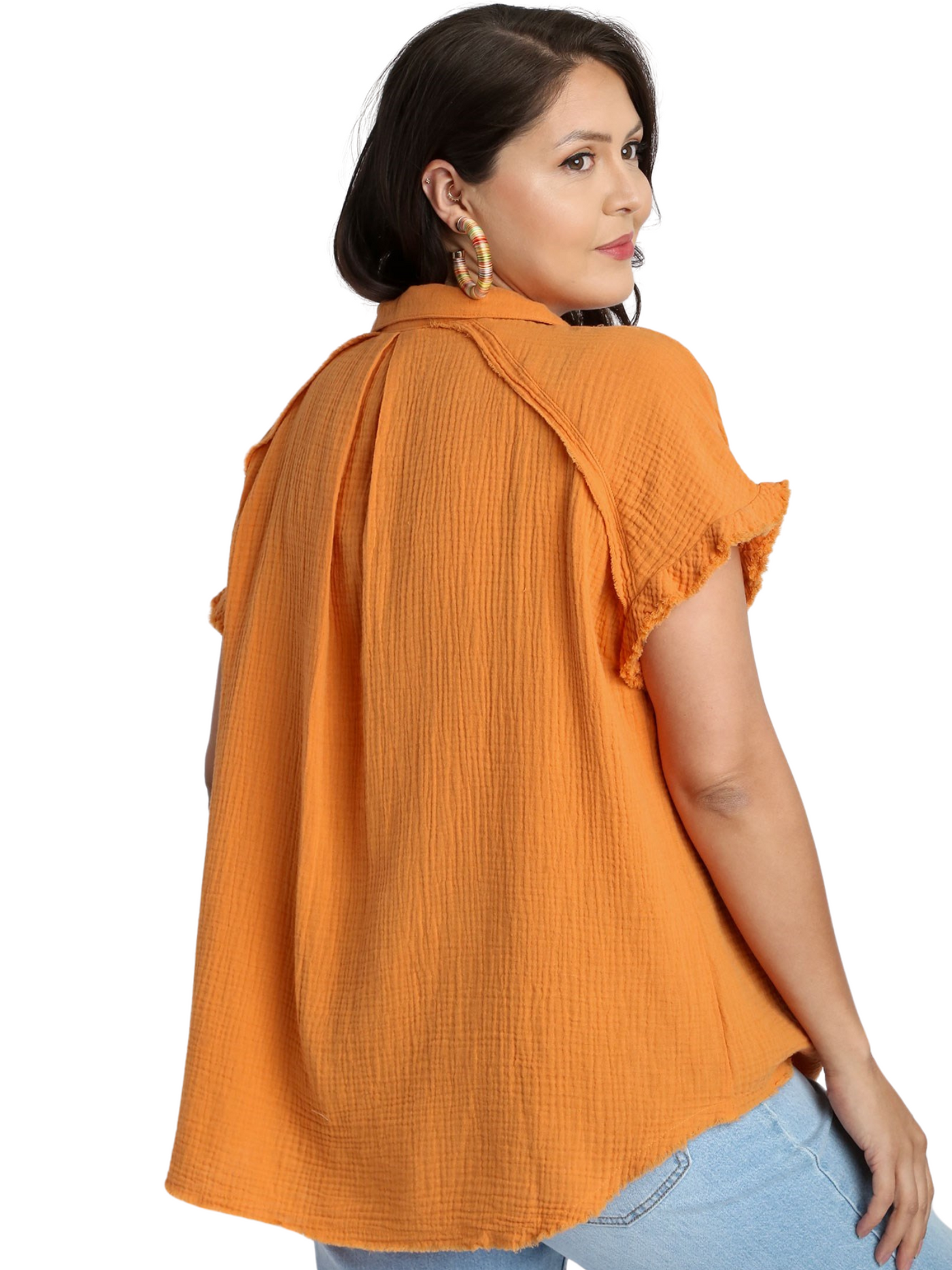 Style and comfort unite in our Curvy Let's Go Team Button Up Top! This short sleeve collared top features a frayed hem for added edge. Perfect for any casual or dressed up occasion, this top will have you feeling confident and ready to take on anything. Let's go, team!