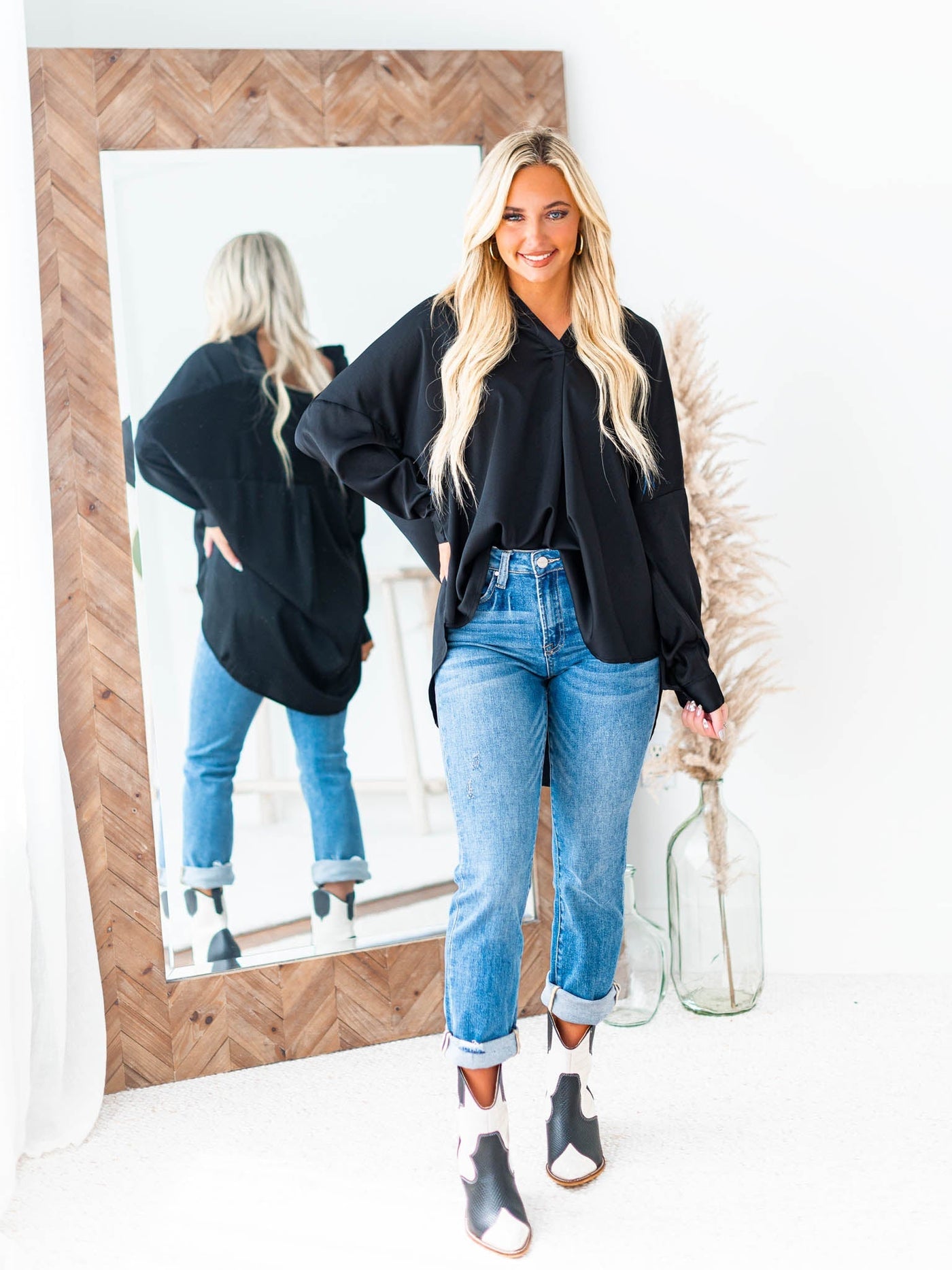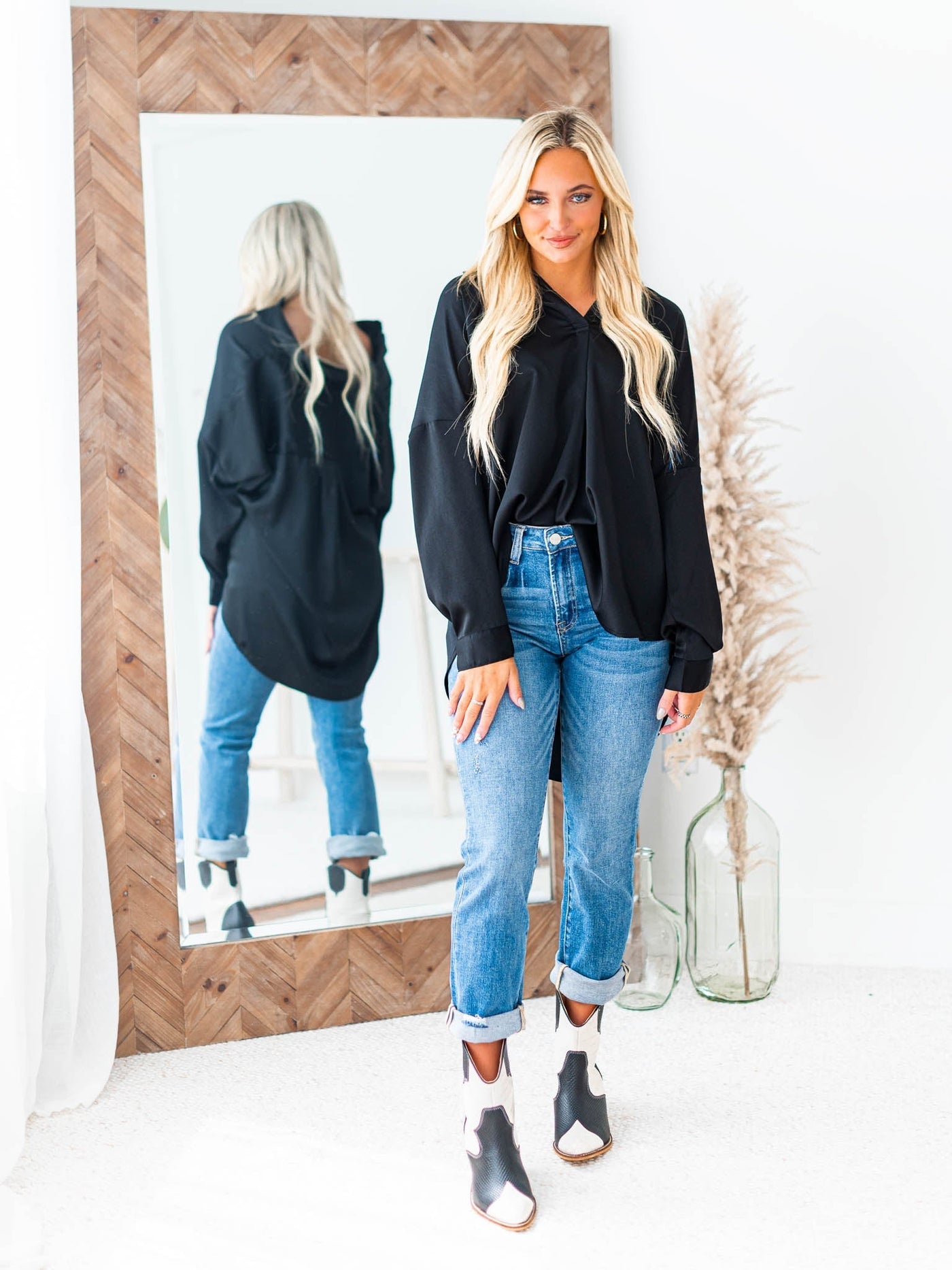 Our Curvy Make Your Choice Top is the perfect long sleeve blouse for any cool weather wardrobe. This loose fit tab collar top features a flattering V-neckline and is sure to up your style game.