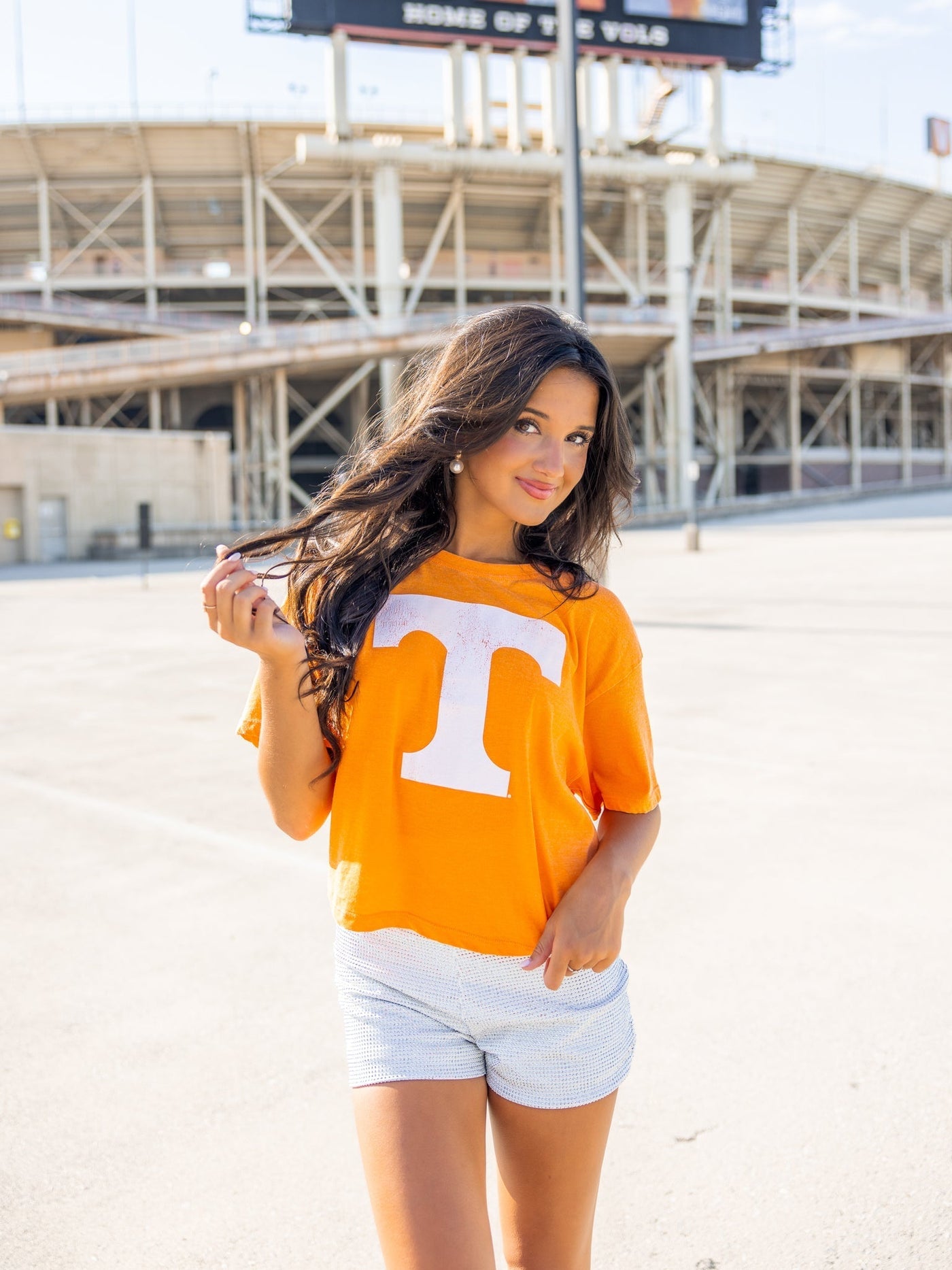 Rock that Volunteers pride like a rockstar in our Tennessee Distressed Logo Tee! Perfect for casual days or game day, this waist-length crewneck is distressed to perfection and officially licensed by the University of Tennessee. Just what you need to show off your Vols fandom in style!