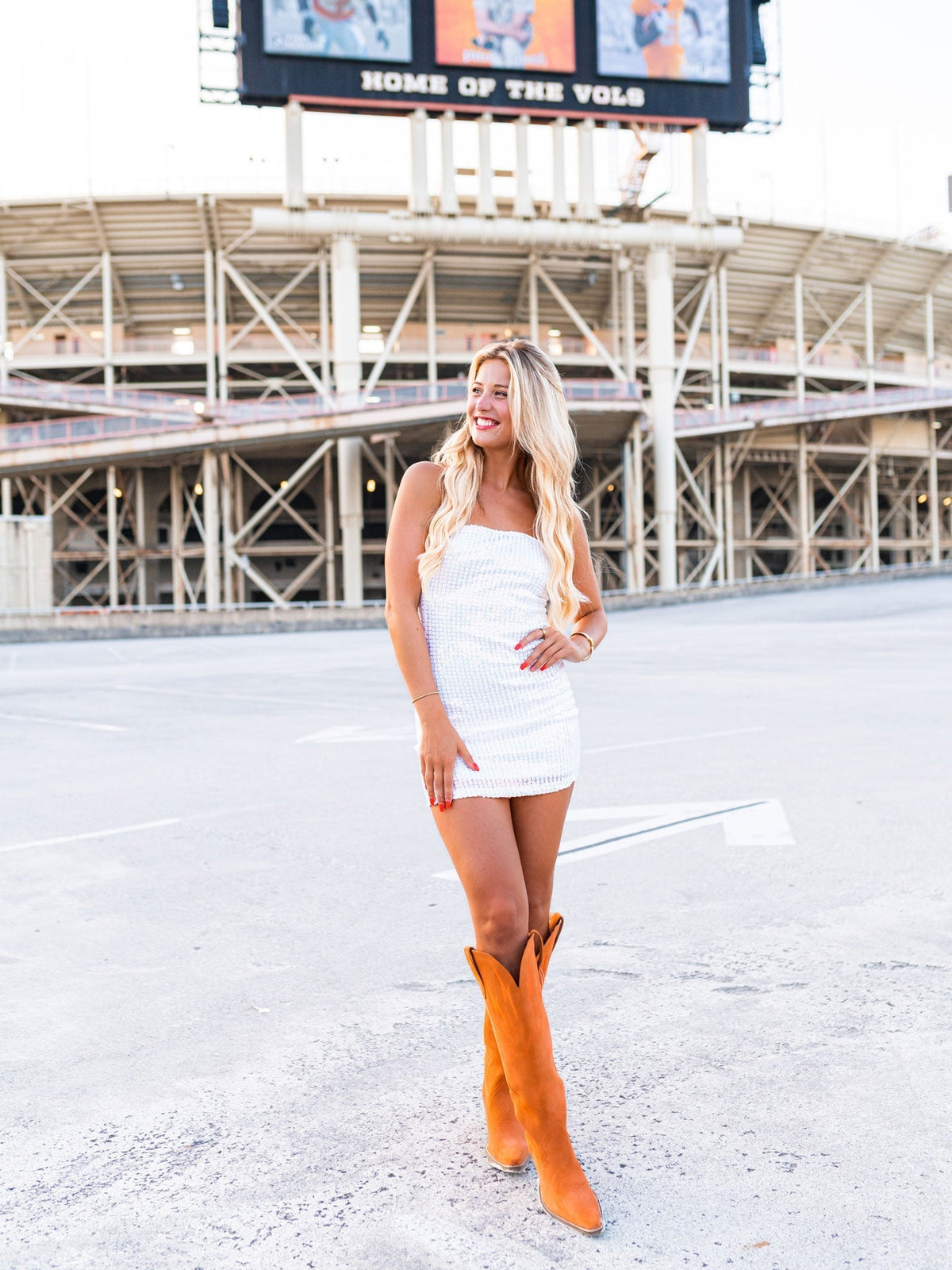 Score a touchdown in style with our V-I-C-T-O-R-Y Sequin Mini Dress! This strapless mini dress is covered in sequins for a sparkly show of support for your favorite college team. Ready for game day - and any day! Go team!