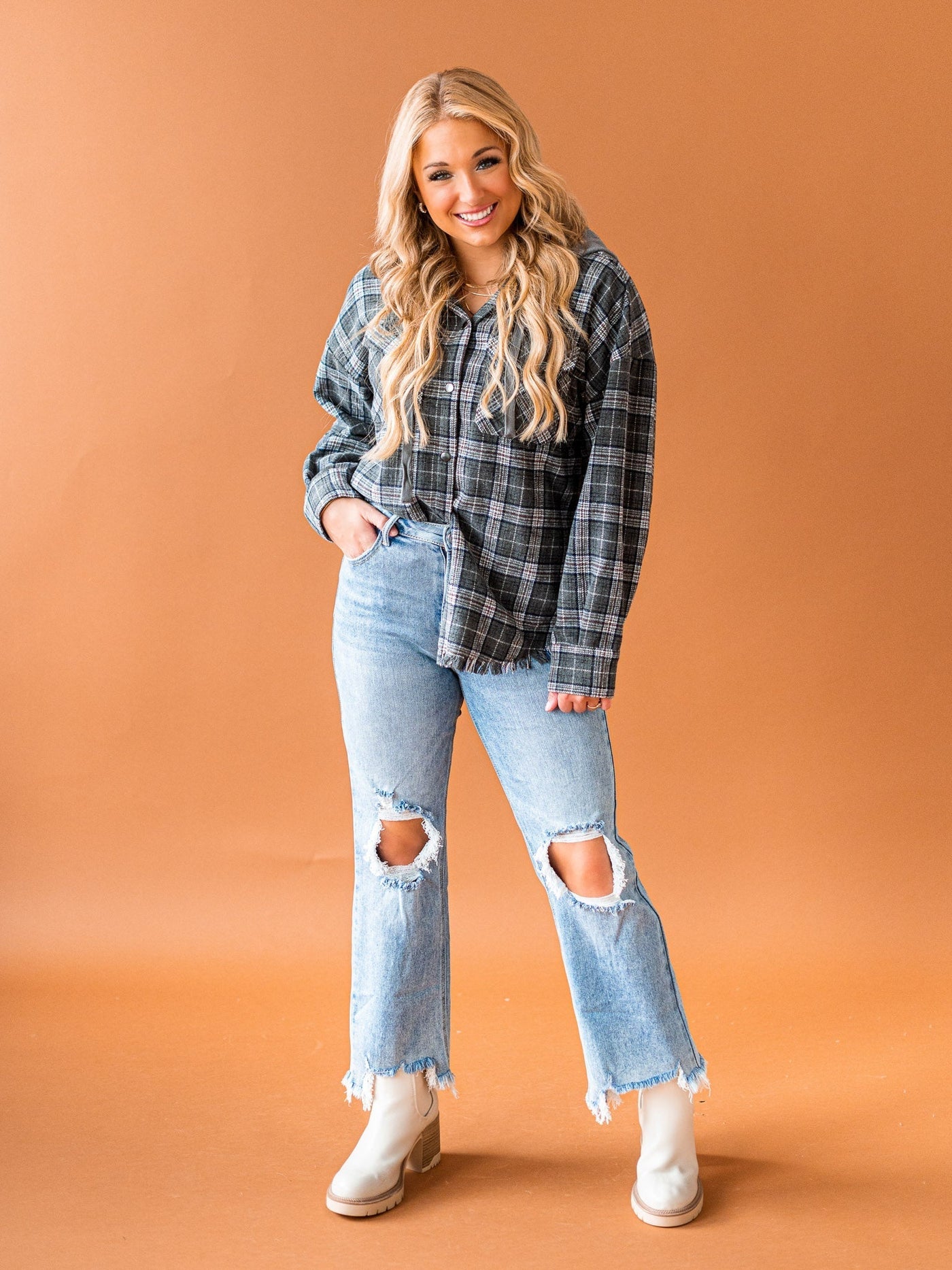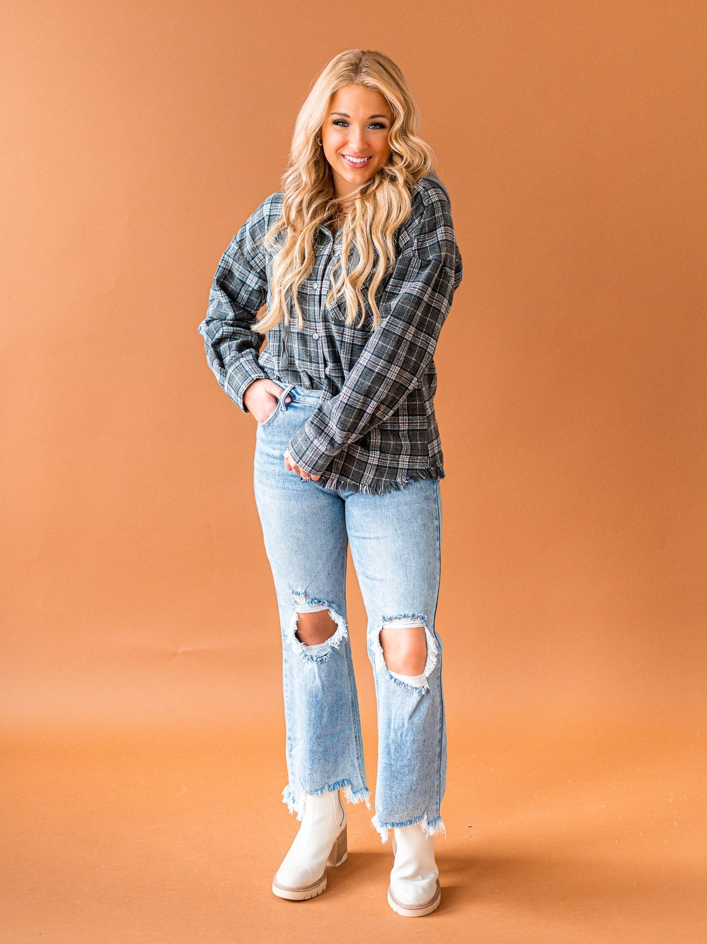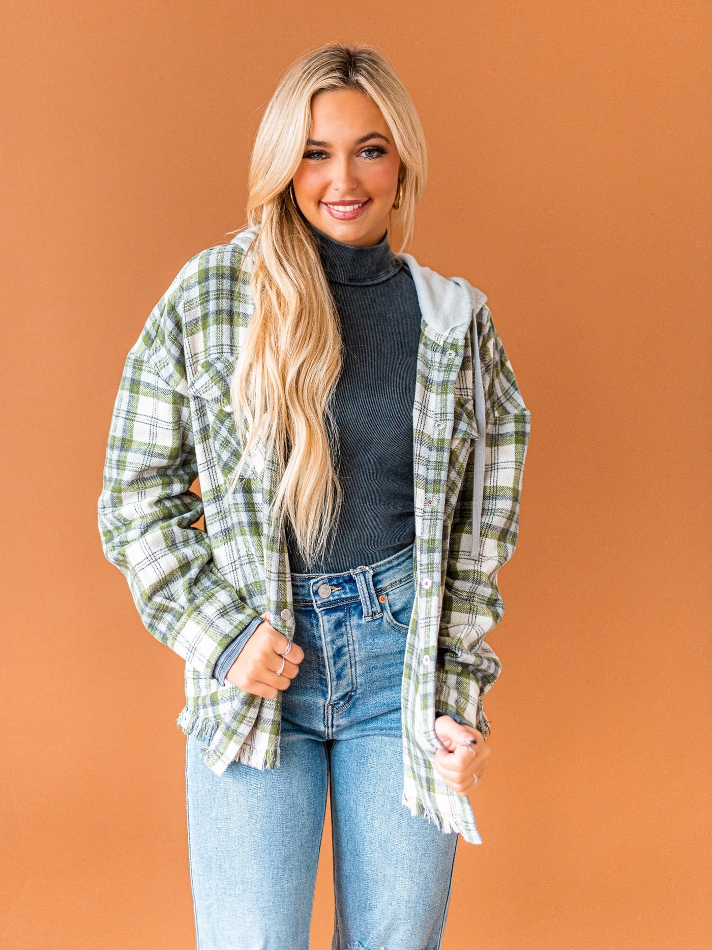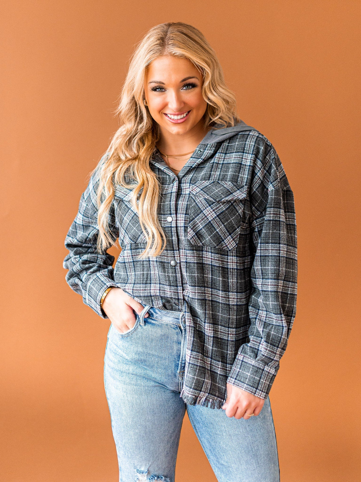 Worth Your While Hooded Plaid Top - Charcoal / S