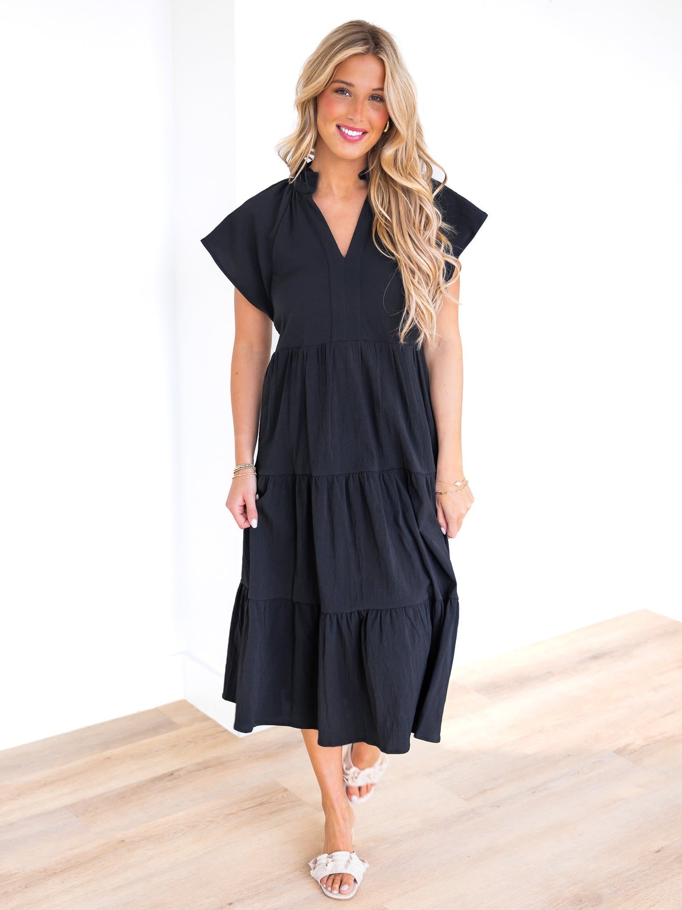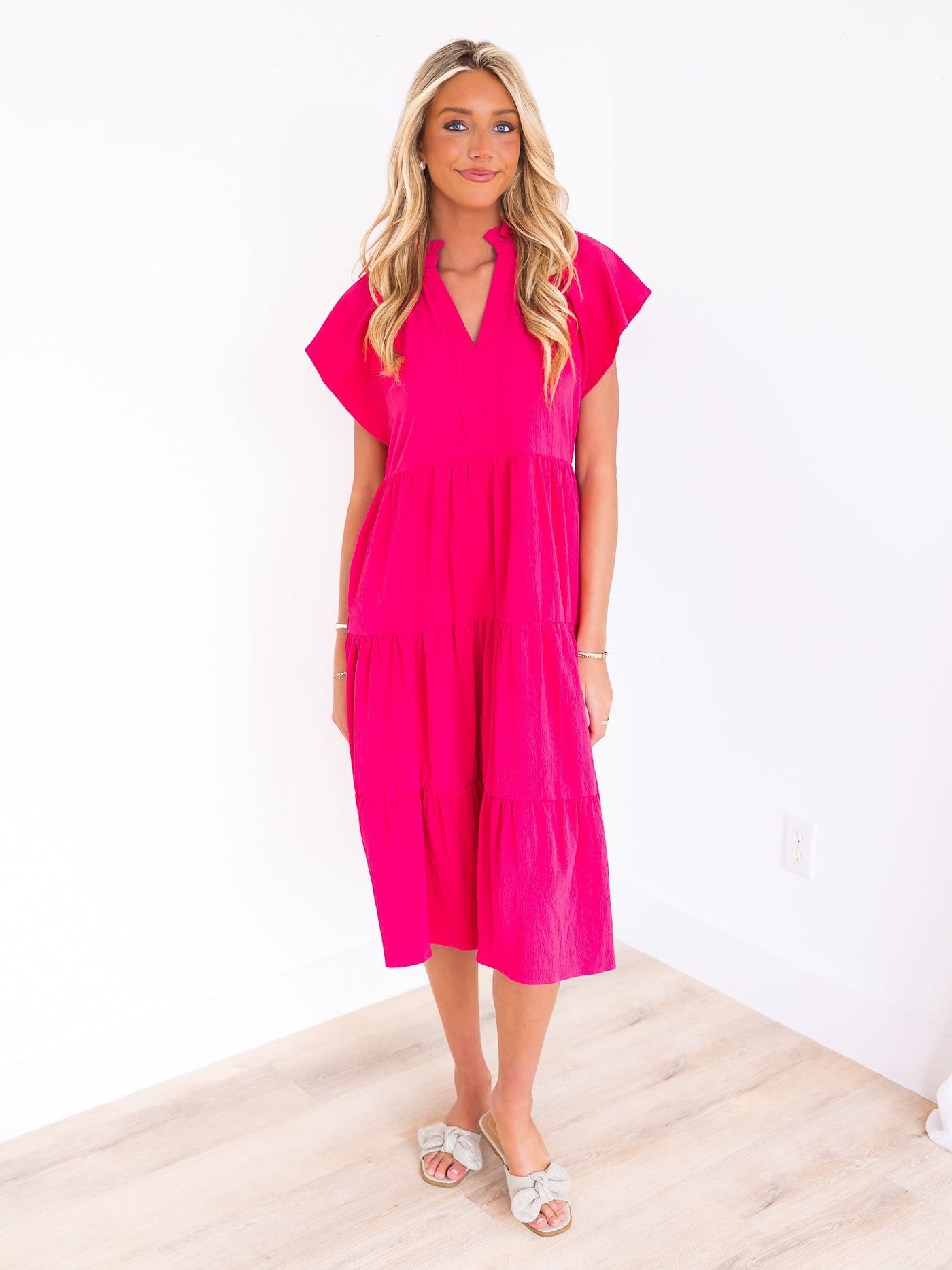 This solid v-neck flutter sleeve midi dress is a must-have for any fashionista's wardrobe. The tiered design adds a playful touch, while the pockets provide convenience. This lined, non-sheer dress is perfect for any occasion and the lightweight fabric makes it a comfortable choice. Yes, please!