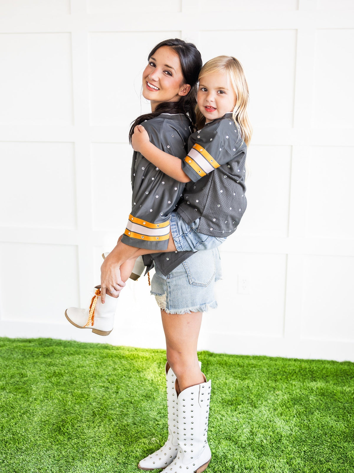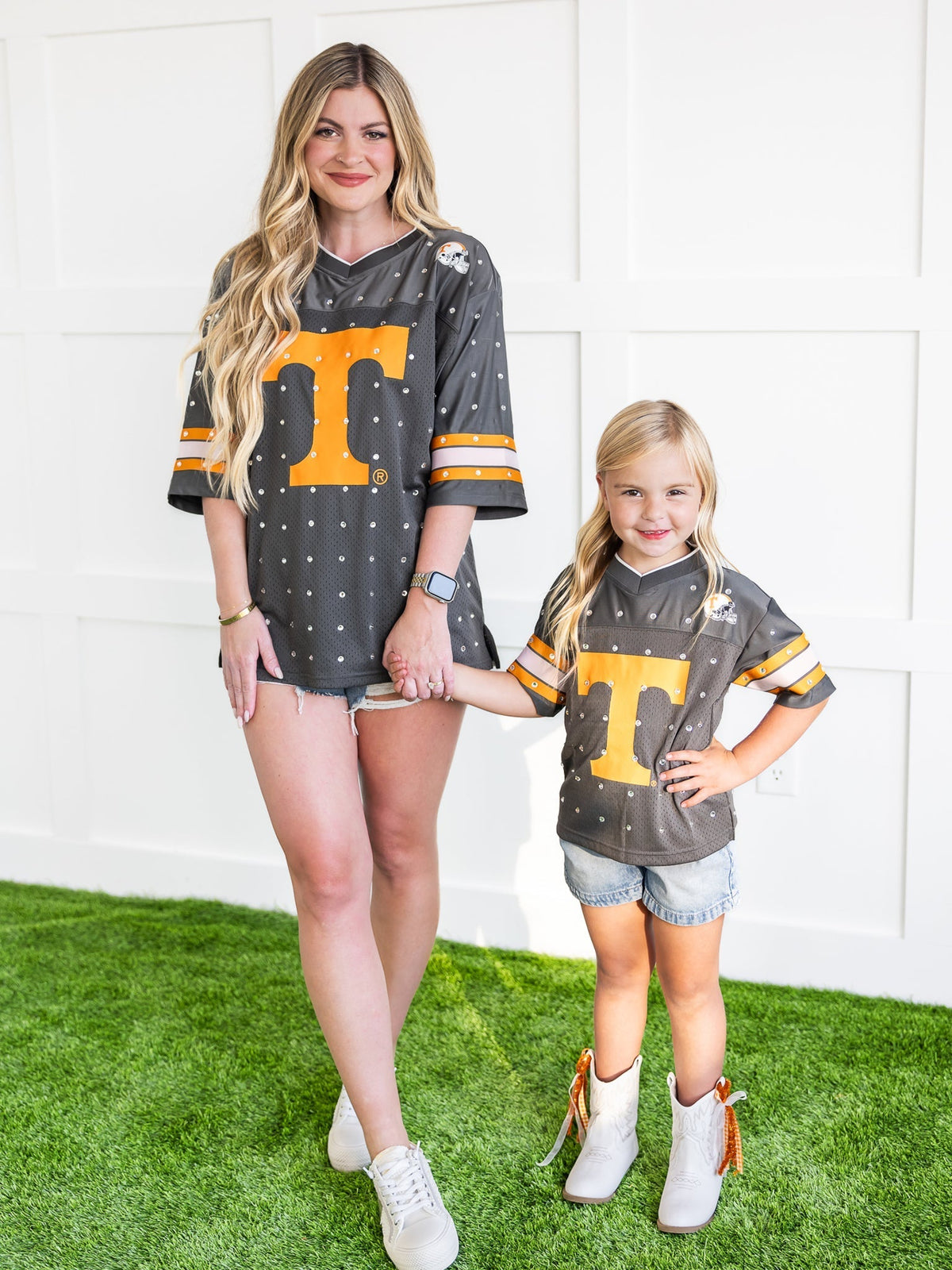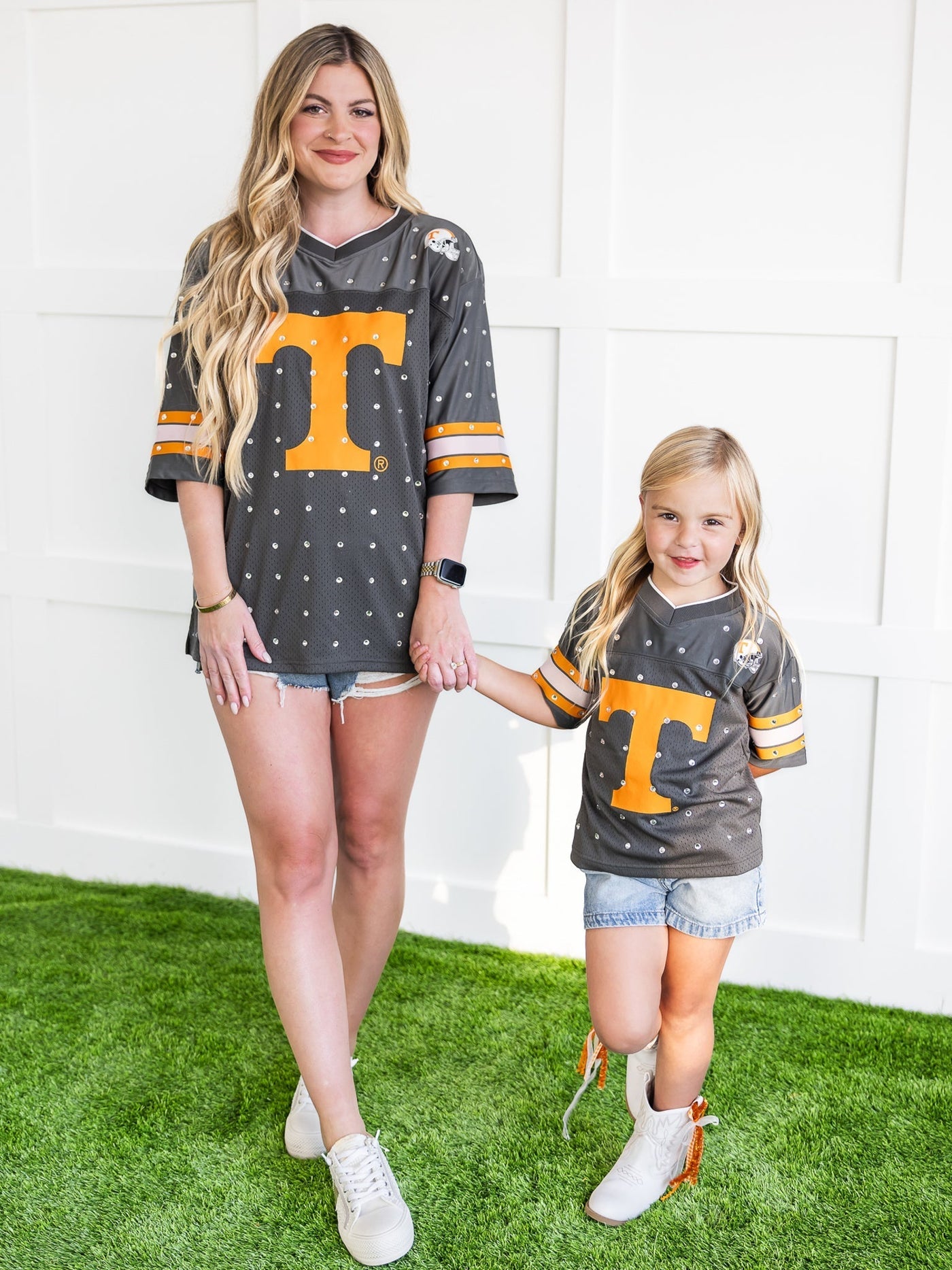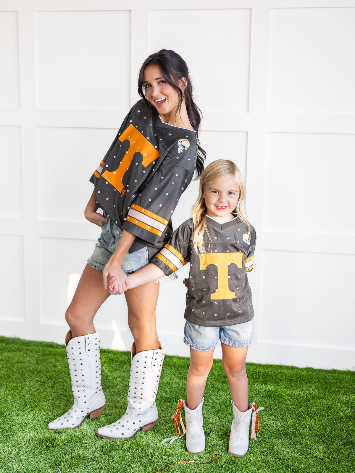 Get ready to kick off game day in style with the Youth Tennessee Volunteers Kick-Off Time Rhinestone Top. Featuring a bold and sparkly "Tennessee Volunteers" design, this top will make your little fan stand out from the crowd. Perfect for showing off team spirit and adding some extra shine to any outfit. Go Vols!
